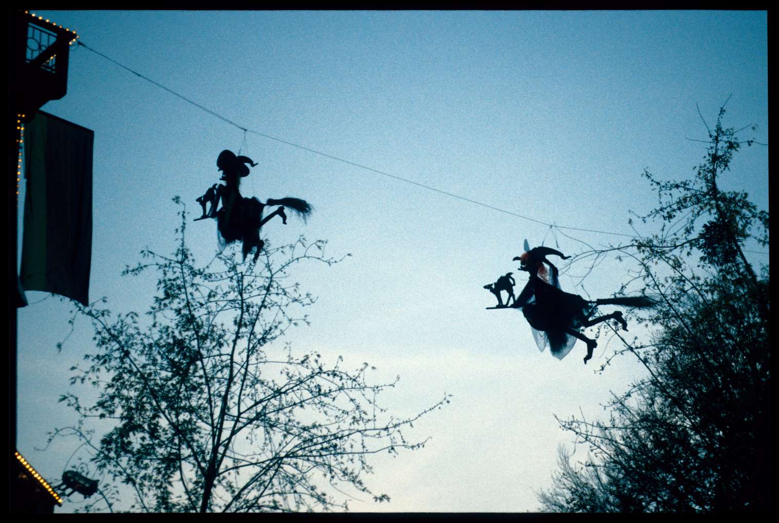 | Kurzbeschreibung: | Die Fotografie zeigt die Halloween-Dekoration in Form von "Hexen" an einem Seil zwischen Balkon und Baum, aufgenommen während des Betriebsausflugs der Landesstelle für Volkskunde Freiburg in den Europapark Rust, Halloween 2001. |