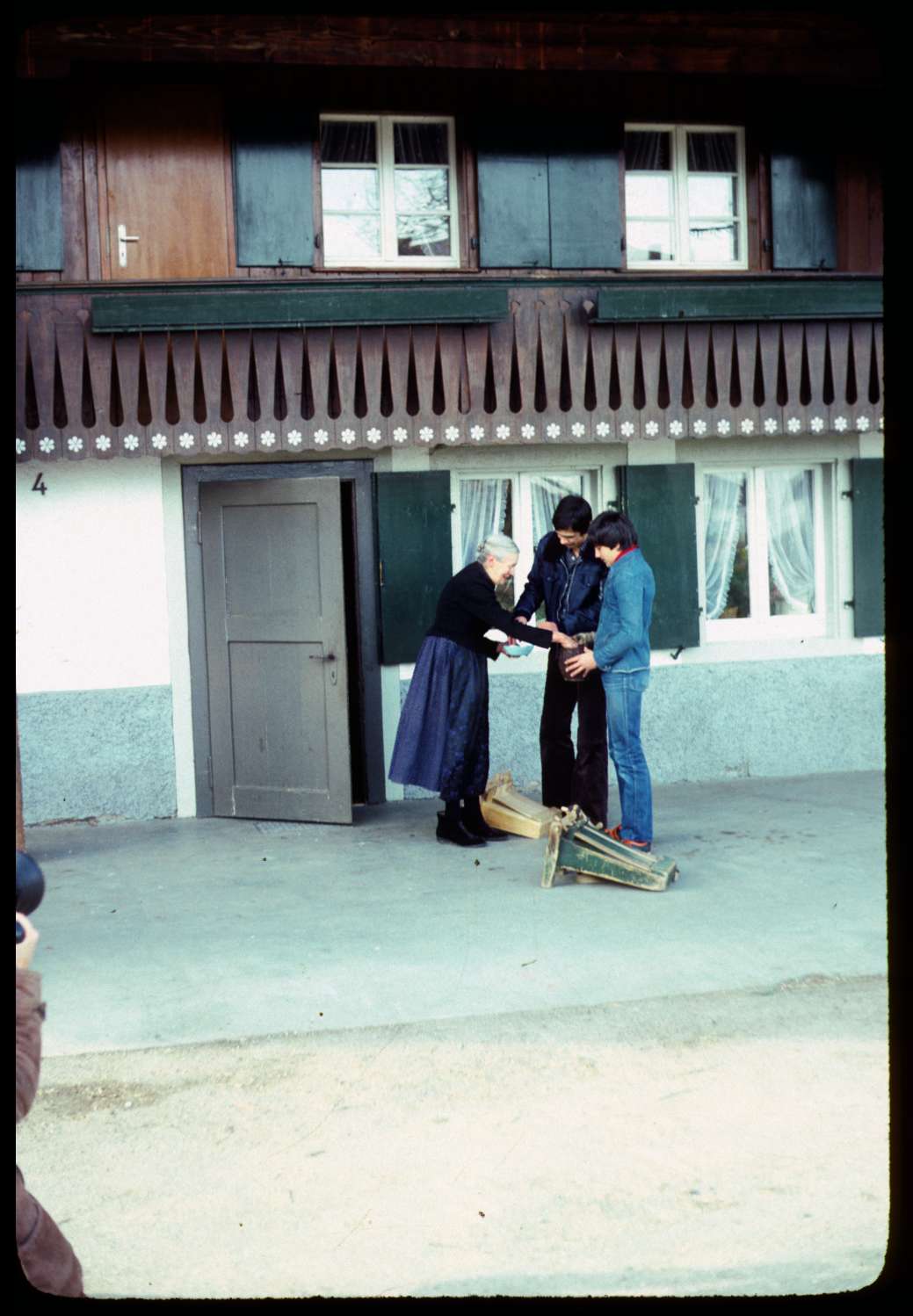 | Kurzbeschreibung: | Karwoche-Rätschen in Freiburg-Ebnet. Zwei Jungen bekommen für das Rätschen vor ihrem Haus von der Bäuerin ein Trinkgeld. Das Rätschen ist ein Brauch in katholischen Gegenden in der Karwoche. Kinder (meist Ministranten) ziehen mit hölzernen Lärminstrumenten durch die Straßen, um die Gläubigen an die Gebetszeiten und Gottesdienste zu erinnern. Die Ratsche ist ein hölzernes Schrapinstrument. Der Überlieferung zufolge schweigen von Gründonnerstag nach dem Gloria der Messe vom letzten Abendmahl den gesamten Karfreitag und Karsamstag über bis zum Gloria in der Osternacht die Glocken, da sie "nach Rom geflogen“ seien. Das festliche Läuten ist in der Trauerzeit des Todes Christi nicht angebracht, und anstelle des Angelusläuten, wird es um 6 Uhr, 12 Uhr und 18 Uhr lautstark durch das Ratschen oder Klappern ersetzt. Auch innerhalb der Liturgie werden die Ratschen bzw. Klappern anstelle der Altarglocken verwendet, z. B. bei den Prozessionen mit dem Allerheiligsten am Gründonnerstag und Karfreitag. |