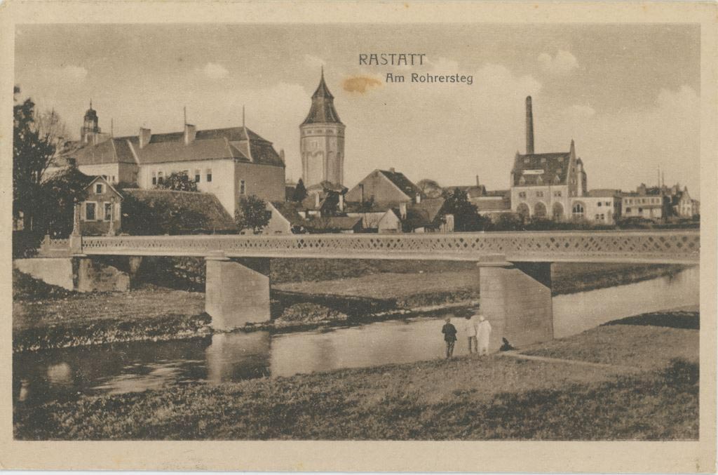| Kurzbeschreibung: | Fotopostkarte mit Ansicht der Brücke Rohrersteg über den Fluss Murg; im Hintergrund die Stadt Rastatt. Feldpost vom 3. Februar 1917 von Julius Steinhäuser an seine Familie in Freiburg, in der er den angekündigten Heimaturlaub absagt: "Rastatt 3. Febr. 1917, Liebe Eltern, Heute kam Gegenbefehl. Sitze gerade in der Bahn, fahre soeben ab ins Feld. Also 8. Comp. Ersatz Inf. Reg. 28, bz. Ersatz Div. Herzlichen Gruss Julius". |