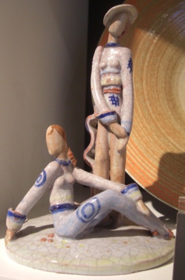 | Kurzbeschreibung: | Auf einem niederen Sockel stehen zwei vollplastisch ausgeformte Frauenfiguren. Die eine sitzt in enger Hose und langärmeligen Oberteil, die Beine angewinkelt auf dem Boden und dreht den Oberkörper nach rechts. Die andere Frauenfigur steht dahinter in enger Hose, langärmligen Oberteil, gewellter langer Schärpe und Hut. Die Bemalung in den Farben gelb, braun und blau erfolgte auf grauem Grund. 1926 begann Ilse Hohenreuther (1911-1952) als 15-Jährige eine dreijährige Lehre im Maleratelier der Staatlichen Majolika-Manufaktur Karlsruhe. Nach dem Abschluss ihrer Ausbildung arbeitete sie dort als festangestellte Keramikerin. Ihre eigenständige Entwurfstätigkeit begann die junge Keramikerin 1929 - also im Alter von 18 Jahren. Hohenreuther heiratete 1934 und führte ab diesem Zeitpunkt den Doppelnamen Köhler-Hohenreuther. Ab 1947 leitete sie in der Manufaktur ein Schmuckatelier, in dem sie die Mehrzahl der 107 Modelle umfassenden Schmuckreihe entwarf. Hohenreuther spezialisierte sich auf freiplastische Frauenfiguren, die in ihrer modernen Weiblichkeit die ästhetische Welt des Art Déco und des Expressionismus widerspiegeln. Die Künstlerin entwickelte einen eigenwilligen und unverkennbaren Frauentyp, bei dem meist junge Mädchen in einer charmanten, kessen und unbekümmerten Art dargestellt werden. Die naturalistische Wiedergabe hat dabei nicht erste Priorität. Stattdessen verzichtete Hohenreuther auf personifizierte Gesichtsmerkmale und korrekt wiedergegebene Körperformen. Auf einigen Schalen sind schlanke, reliefartige Frauenfiguren als ein flankierender Dekor der Außenwände zu sehen. Eine weitere keramische Gattung, in der die Keramikerin zuhause war, waren Fliesenbilder. Daran merkt man am deutlichsten, dass sie ihre Ausbildung im Maleratelier begann. Es ist erstaunlich, dass Ilse Hohenreuhter, die keine künstlerische Ausbildung erfuhr (weder an der Kunstschule Bauhaus, noch an einer Kunstakademie) sich zu einer so begabten und originellen Künstlerin entwickeln konnte. 1950 krankheitsbedingt verließ sie die Manufaktur und verstarb zwei Jahre später. Literatur: Joanna Flawia Figiel: Tonangebend. Starke Frauen und ihre Kunst 1918-1945, Karlsruhe 2023, S. 89-97 Monika Bachmayer: Karlsruher Majolika. Die Großherzogliche Majolika-Manufaktur 1901-1927. Die Staatliche Majolika-Manufaktur 1927-1978, Ausstellungskatalog, Karlsruhe 1979 Arthur Mehlstäubler: Ilse Hohenreuther (ver. Köhler) - ein kleines aber reizvolles Werk für die Majolika-Manufaktur Karlsruhe, in: Keramos, Oktober 2001, Heft 174, Seite 125-135 Monika Bachmayer, Peter Schmitt: Karlsruher Majolika 1901-2001, 100 Jahre Keramik des 20. Jahrhunderts, Karlsruhe 2001 Joanna Flawia Figiel, Peter Schmitt: Karlsruher Majolika, Führer durch das Museum in der Majolika, Zweigmuseum des Badischen Landesmuseums, Karlsruhe 2004. |
