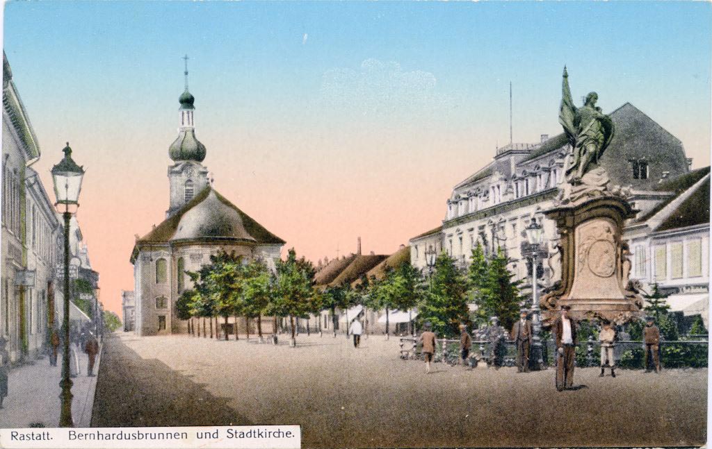 "Rastatt - Bernhardusbrunnen und Stadtkirche"