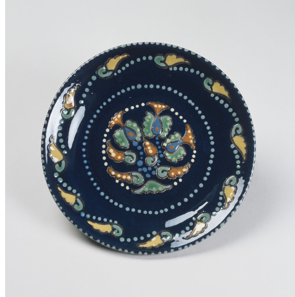 | Weitere Angaben zum Werk: | Irdengut [Material], Schamotte [Material], Schlickermalerei [Technik], bemalt [Technik], glasiert [Technik], überdreht [Technik], Bleiglasur [Technik], Kobaltglasur [Technik], Farbglasur [Technik], Höhe: 2.7 cm, Durchmesser: 14.0 cm |