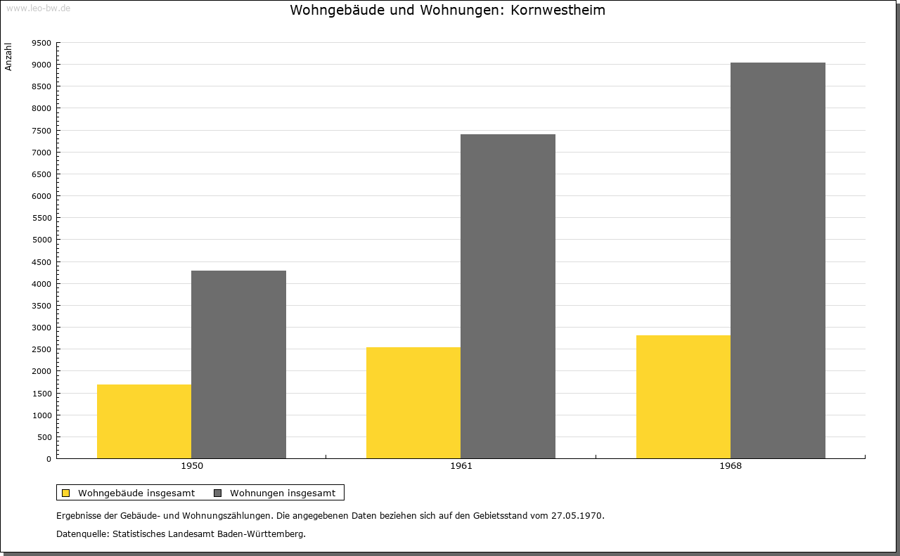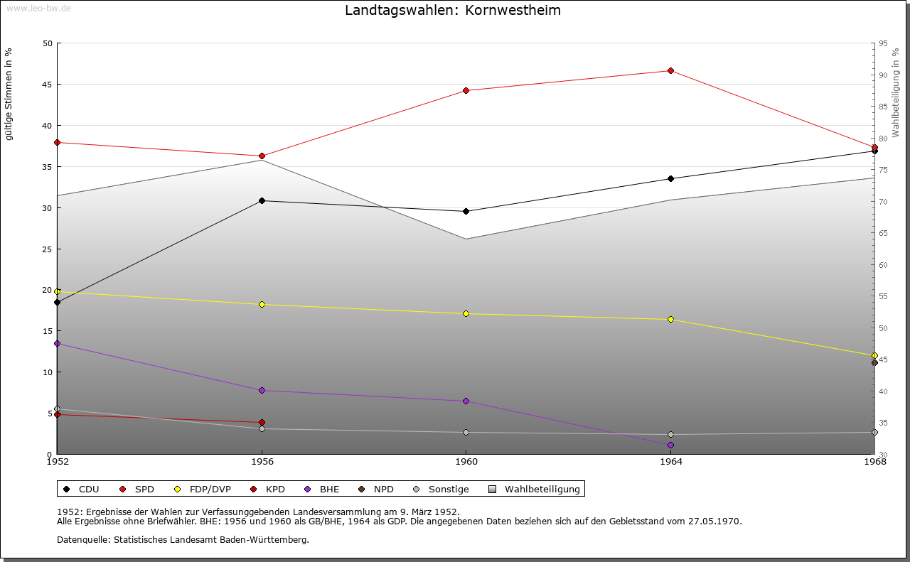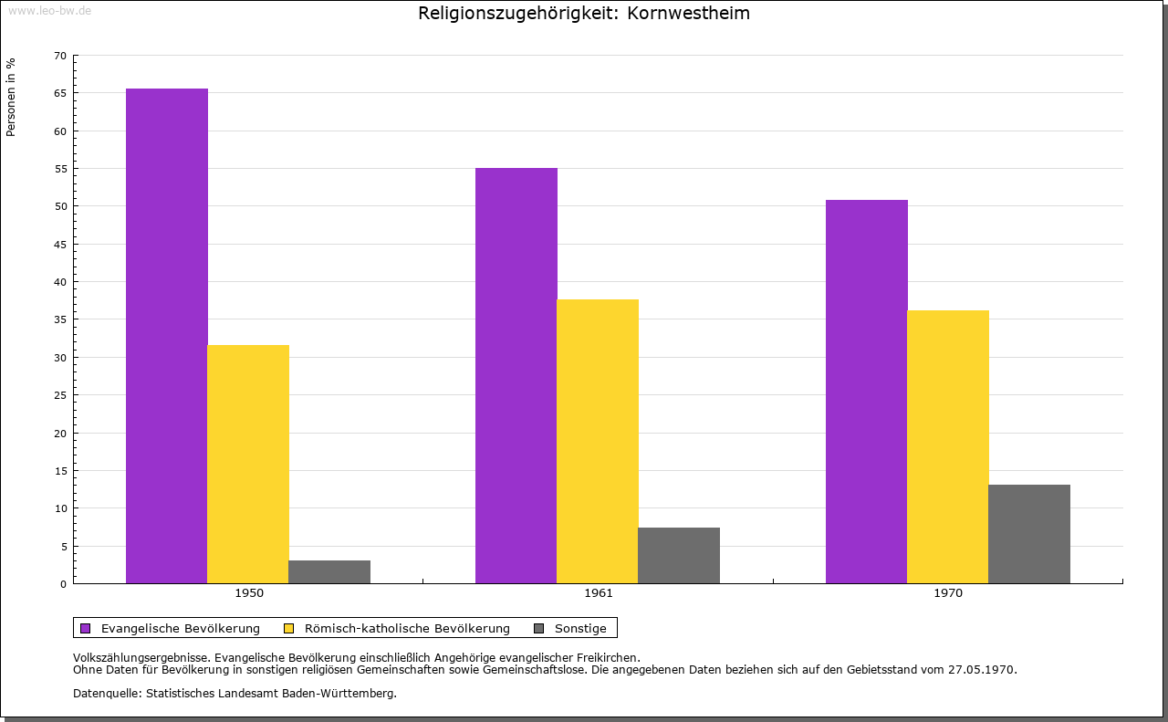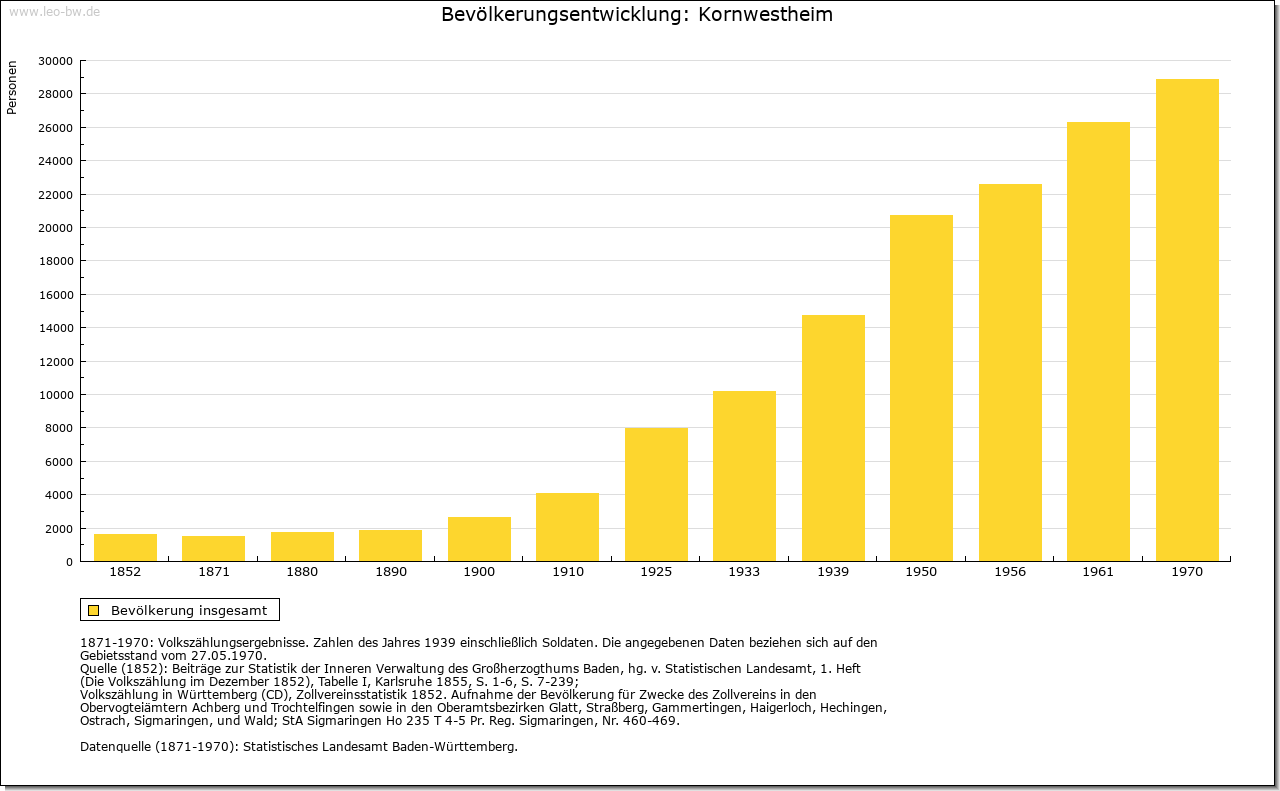 | Geschichte: | 780/81 (Codex Laureshamensis) Westheim, nicht ganz sicher zuzuweisen. Um 1080 (Kopialüberlieferung 16. Jahrhundert) Westheim, 2. Hälfte 14. Jahrhundert Schwaben-Westheim, 1417 Westheim im Glemsgau, 1472 Kornwestheim. Auf der Gemarkung Kornwestheim mehrere frühe Siedlungen (Reihengräberfriedhöfe beim alten Friedhof, am Westrand des Ortes, im Osten von Kornwestheim und im Südteil der Stadt. Plattengräber im Ortsbereich, in der Kirche St. Martin wohl Stiftergrab des 7. Jahrhunderts), von denen nur eine Bestand hatte. Von dem von Ende des 11. bis Ende des 13. Jahrhunderts bezeugten ursprünglich edelfreien Adel erhielt Kloster Hirsau um 1080 ansehnlichen Besitz. Der im 11. Jahrhundert in der Hand der Grafen von Calw befindliche Ort gelangte Ende des 12. Jahrhunderts an die Pfalzgrafen von Tübingen. Deren Nebenlinie, die Grafen von Asperg, veräußerte ihn 1303 an Württemberg. Dieses erwarb 1318 einige Höfe von Kloster Hirsau und 1340 von Kloster Lorch einen Hof. Auch verschiedene Adelsfamilien, so die von Blankenstein, von Venningen, von Schlettstadt und die von Kaltental, verfügten im 14./ 15. Jahrhundert über Besitzrechte. Kornwestheim gehörte zum Amt Cannstatt, seit 1719 zum Oberamt Ludwigsburg. Schwere Bevölkerungsverluste durch Seuchen im 30jährigen Krieg (1635 allein 335 Pestopfer). Im Zweiten Weltkrieg wurden bei Luftangriffen 162 Einwohner getötet, 160 Gebäude zerstört. Von 1770 bis 1781 wirkte hier der »Mechanikerpfarrer« Philipp Matthäus Hahn. Am 1.4.1931 wurde Kornwestheim Stadt, am 1.4.1956 Große Kreisstadt. |