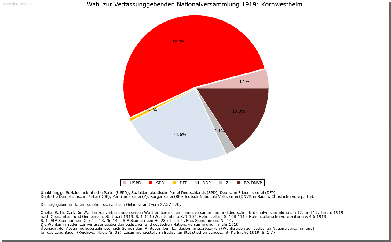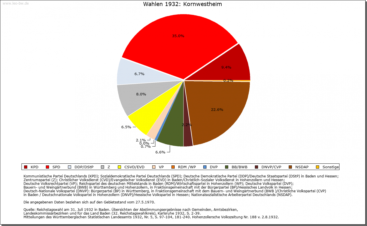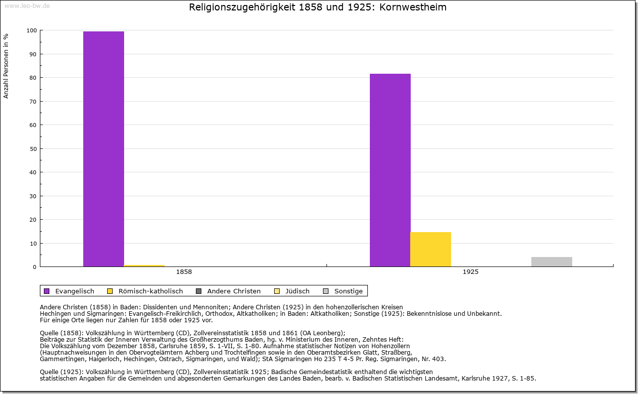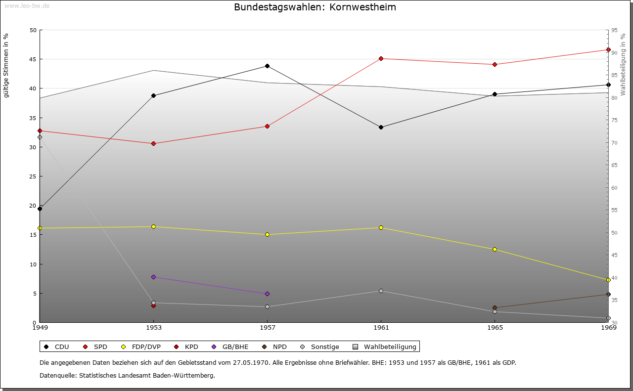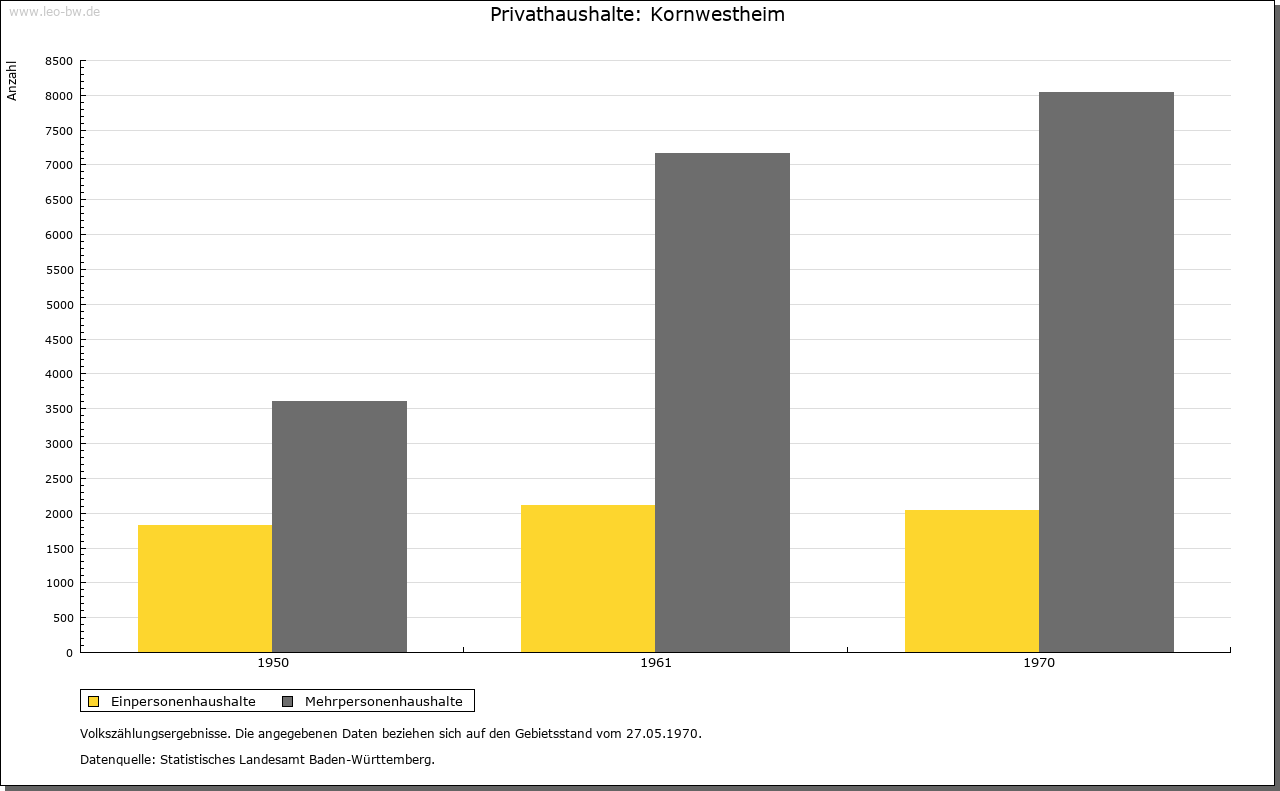 | Geschichte: | 780/81 (Codex Laureshamensis) Westheim, nicht ganz sicher zuzuweisen. Um 1080 (Kopialüberlieferung 16. Jahrhundert) Westheim, 2. Hälfte 14. Jahrhundert Schwaben-Westheim, 1417 Westheim im Glemsgau, 1472 Kornwestheim. Auf der Gemarkung Kornwestheim mehrere frühe Siedlungen (Reihengräberfriedhöfe beim alten Friedhof, am Westrand des Ortes, im Osten von Kornwestheim und im Südteil der Stadt. Plattengräber im Ortsbereich, in der Kirche St. Martin wohl Stiftergrab des 7. Jahrhunderts), von denen nur eine Bestand hatte. Von dem von Ende des 11. bis Ende des 13. Jahrhunderts bezeugten ursprünglich edelfreien Adel erhielt Kloster Hirsau um 1080 ansehnlichen Besitz. Der im 11. Jahrhundert in der Hand der Grafen von Calw befindliche Ort gelangte Ende des 12. Jahrhunderts an die Pfalzgrafen von Tübingen. Deren Nebenlinie, die Grafen von Asperg, veräußerte ihn 1303 an Württemberg. Dieses erwarb 1318 einige Höfe von Kloster Hirsau und 1340 von Kloster Lorch einen Hof. Auch verschiedene Adelsfamilien, so die von Blankenstein, von Venningen, von Schlettstadt und die von Kaltental, verfügten im 14./ 15. Jahrhundert über Besitzrechte. Kornwestheim gehörte zum Amt Cannstatt, seit 1719 zum Oberamt Ludwigsburg. Schwere Bevölkerungsverluste durch Seuchen im 30jährigen Krieg (1635 allein 335 Pestopfer). Im Zweiten Weltkrieg wurden bei Luftangriffen 162 Einwohner getötet, 160 Gebäude zerstört. Von 1770 bis 1781 wirkte hier der »Mechanikerpfarrer« Philipp Matthäus Hahn. Am 1.4.1931 wurde Kornwestheim Stadt, am 1.4.1956 Große Kreisstadt. |