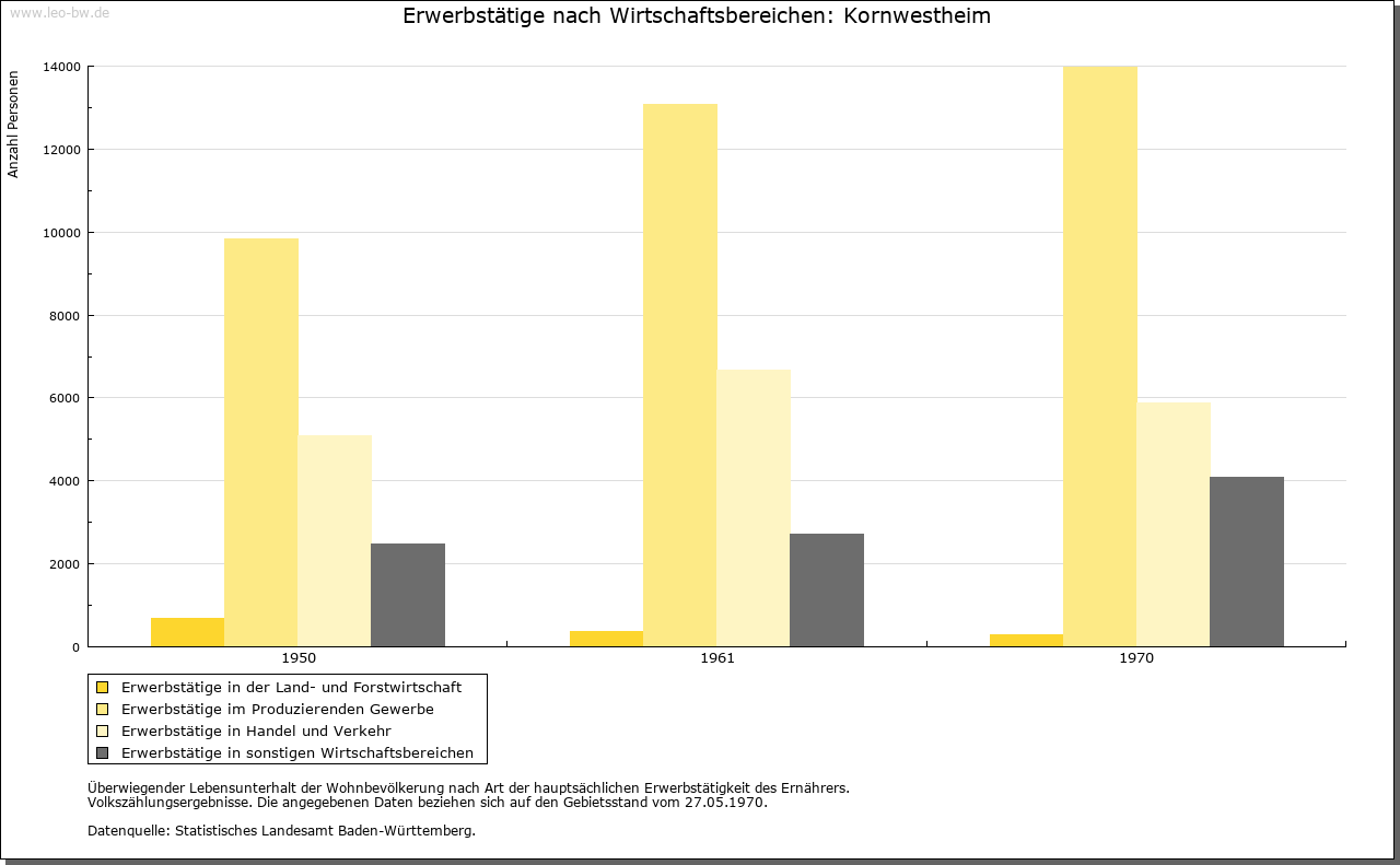 | Wirtschaft und Bevölkerung: | Das wohlhabende Bauerndorf wandelte sich dank seiner verkehrsgünstigen Lage seit dem Ende des 19. Jahrhunderts zu einer bedeutenden Industriegemeinde mit rasch wachsender Einwohnerschaft. 1846 Eisenbahnverbindung nach Stuttgart und Ludwigsburg, 1896 Eröffnung der Güterbahn nach Stuttgart-Untertürkheim, 1911-1918 Bau des Landesgüterbahnhofs. 1885 legte Jakob Sigle den Grundstein zu der großen Schuhfabrik, der Salamander AG. 1896 entstand die Eisengießerei und Maschinenfabrik Stotz. |
