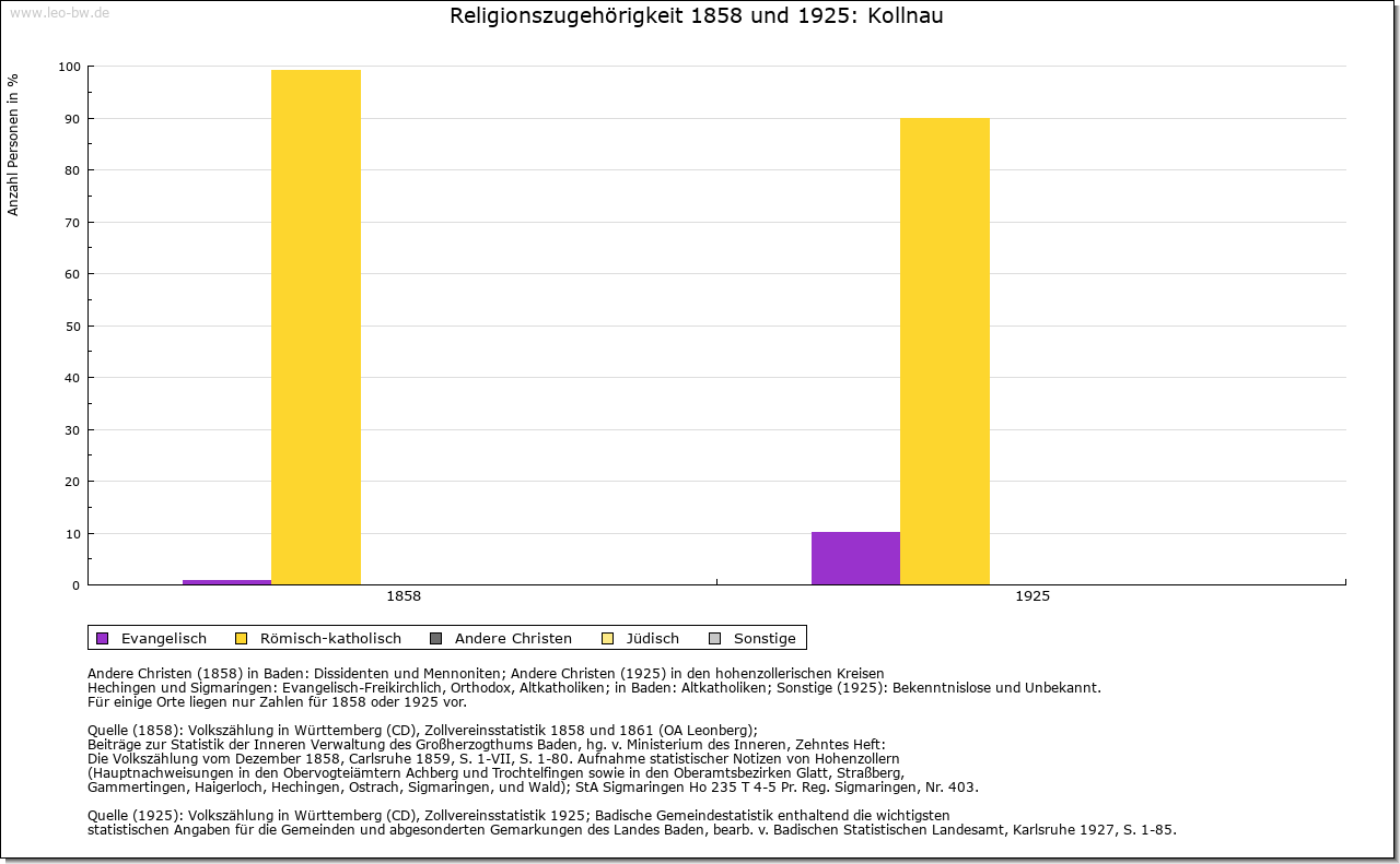 | Kirche und Schule: | Kollnau war früher Filiale von Waldkirch, seit 1915 selbständige Pfarrei; zum Sprengel neben Kollnau von Siensbach der Ortsteil Beim Rechen. Pfarrkirche St. Joseph von 1907/10, neubarock. Evangelische Pfarrei 1953 unter dem Namen Kollnau-Gutach errichtet. Der Sprengel umfaßt von der Stadt Waldkirch die Stadtteile Kollnau und Siensbach sowie die Gemeinde Simonswald, außerdem die Gemeinde Gutach im Breisgau. Evangelische Kirche in Kollnau von 1967. |