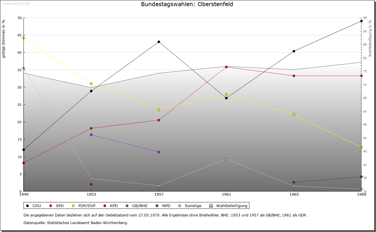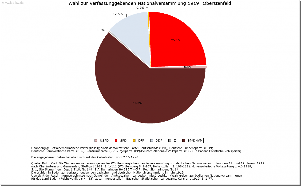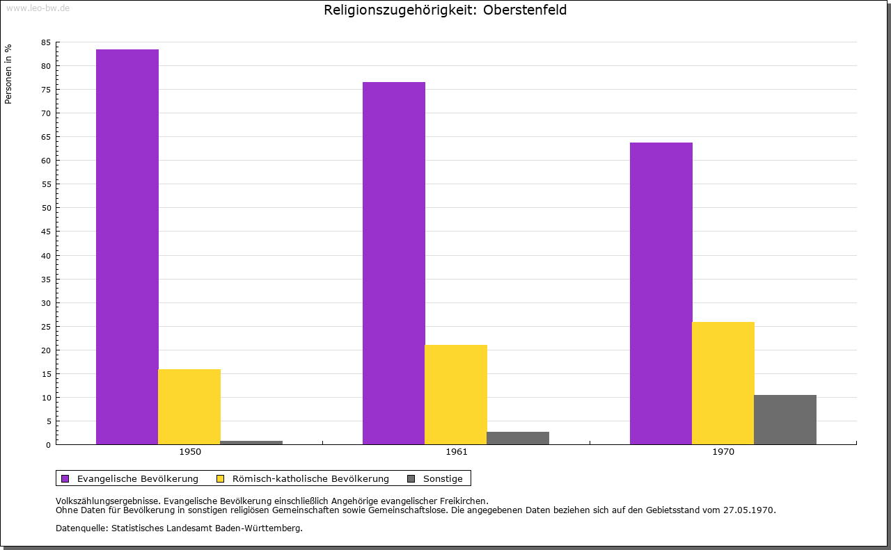 | Geschichte: | Um 1016 (Falsificatum 12./13. Jahrhundert) Obersten- und Obirstenuelt, 1244 Oberstenvelt. Siedlung des frühen Landesausbaus. Um 1016 Gründung des Stifts Oberstenfeld durch einen Grafen Adalhard und seinen Sohn Heinrich. Ob die beiden Stifter mit den edelfreien Herren von Heinriet, ihren Rechtsnachfolgern in Oberstenfeld, verwandt waren, lässt sich nicht ermitteln. Das Stift, das in Winzerhausen und anderen Orten begütert war sowie die Pfarreien Tiefenbach-Mundelsheim und Eberstadt (Landkreis Heilbronn) besaß, nahm im 14. Jahrhundert die Augustinerregel an. Seine Schirmvögte waren bis 1357 die Hummel von Lichtenberg, dann die Grafen von Württemberg. Herzog Ulrich wandelte es nach der Einführung der Reformation in ein evangelisches adliges Fräuleinstift um. Nach dem Schmalkaldischen Krieg schloss es sich dem Ritterkanton Kocher an, musste jedoch 1730 die württembergische Schirmherrschaft wieder anerkennen. Im Reichsdeputationshauptschluss fiel es an Württemberg. Kurfürst Friedrich setzte 1805 seine Tochter Katharina als Äbtissin ein. Die Zahl der Stiftsdamen bestimmte er auf zehn. 1818 und 1838 stiftete König Wilhelm I. noch eine Anzahl Präbenden für unbemittelte Fräulein aus dem ritterschaftlichen Adel. 1920 wurde das Stift aufgehoben. Das Dorf kam 1807 zum Oberamt Marbach, 1938 zum Landkreis Ludwigsburg. |