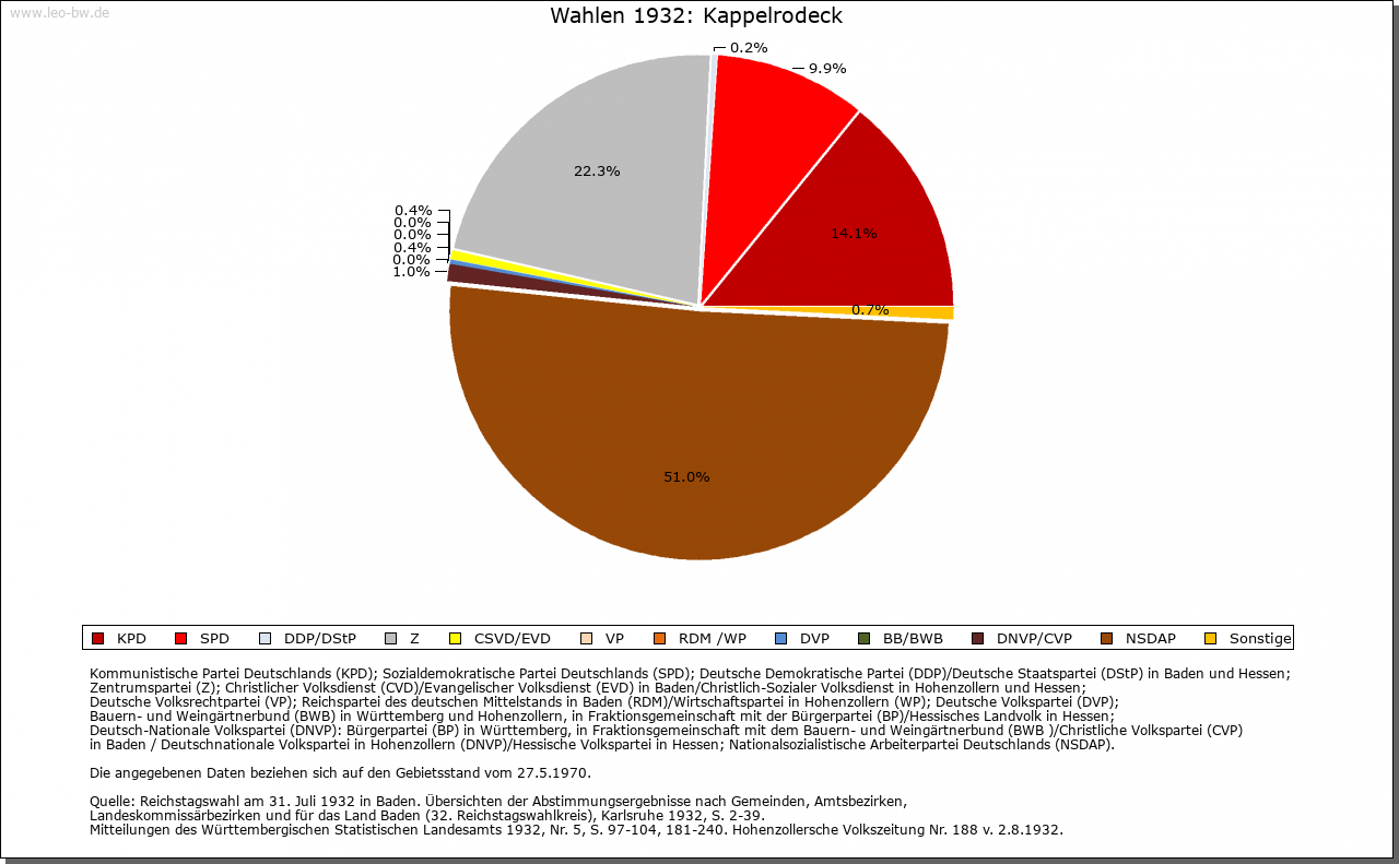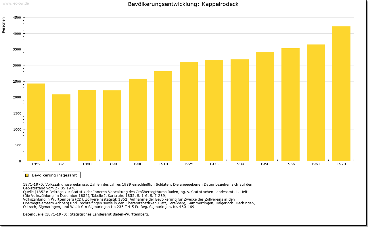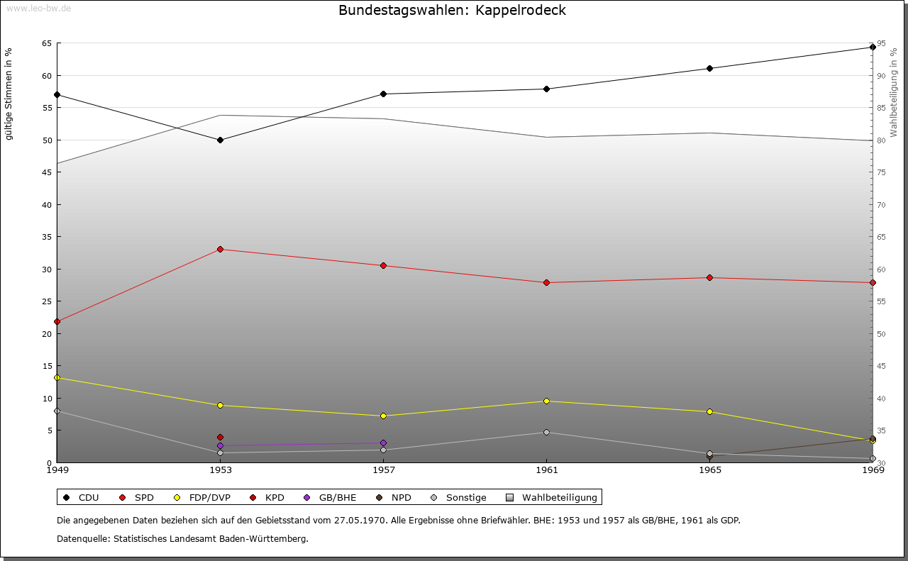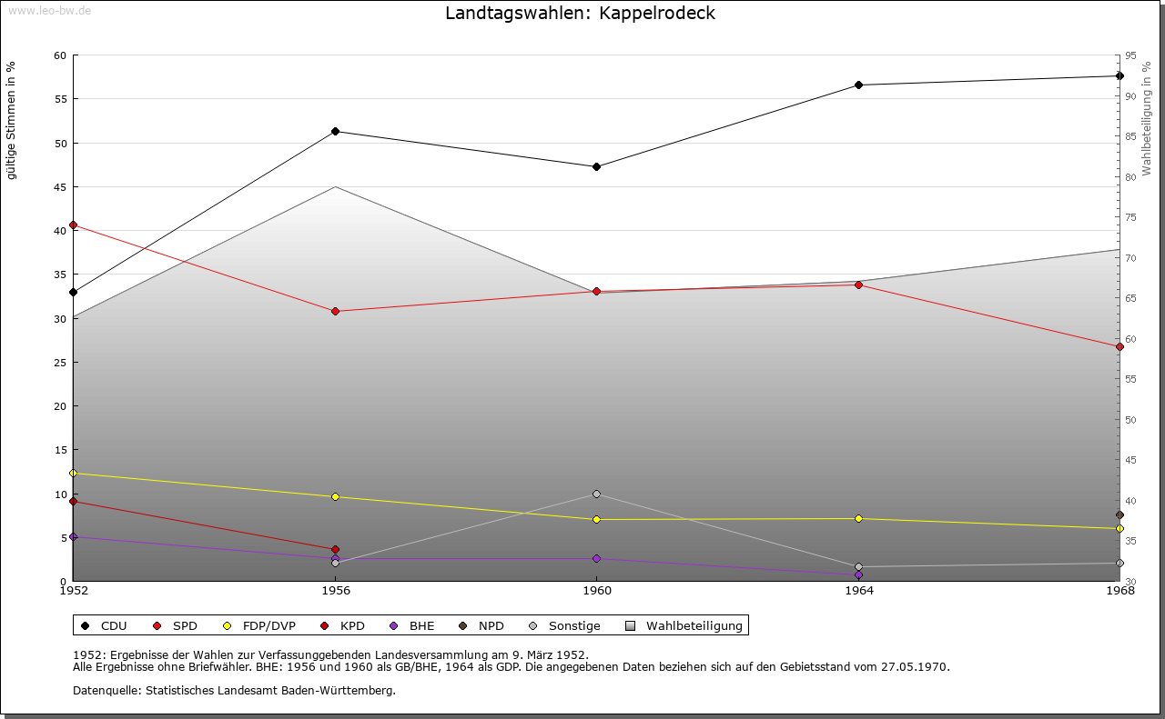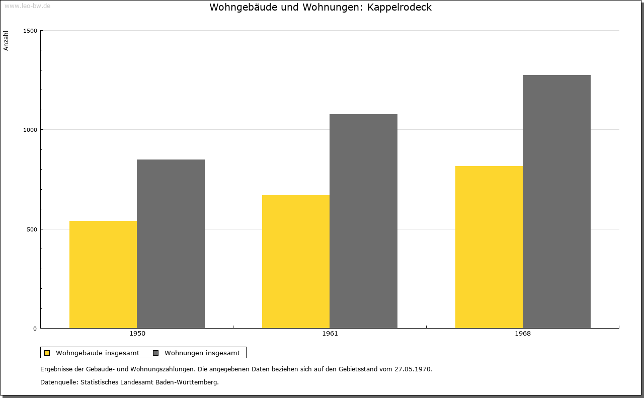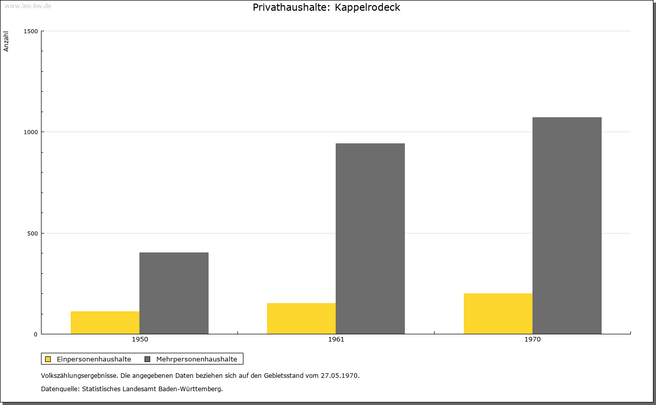 | Geschichte: | 1310 Capelle, 1356 Cappel bi Rodecke, 1533 Obercappel. Hochmittelalterliche Siedlung von Oberachern aus. 1318 verkaufte das Kloster St. Georgen seinen Dinghof zu Kappelrodeck mit allen Rechten und Patronat der Pfarrkirche Oberachern an den Bischof von Straßburg. Das zum St. Georgenhof in Oberkappel gehörende Hubgericht war wohl der Ausgangspunkt der straßburgischen Herrschaft. Kappelrodeck bildete ein eigenes Gericht der Herrschaft Oberkirch, deren Geschichte es teilte. In dieses Gericht gehörten Furschenbach, Ottenhofen mit Simmersbach und Unterwasser sowie Seebach, seit 1795 auch die kleine ehemalige Herrschaft Bosenstein (s. Ottenhofen Wpl. 10). Die südlich über Kappelrodeck gelegene Burg Rodeck wurde im 13. Jahrhundert durch die von Hohenrod (s. Verwaltungsraum Achern, Gemeinde Sasbachwalden) stammenden Röder erbaut, die sich erstmals 1297 von Rodecke nannten. 1379 wurde die Burg zum Teil an den Bischof von Straßburg, zum Teil an die Markgrafen von Baden verkauft, die vor 1419 auch die straßburgische Hälfte erwarben. Seit 1455 besaß wieder die Familie Röder von Rodeck das Schloß als Mannlehen der Markgrafen, nach ihrem Aussterben Anfang des 17. Jahrhunderts wechselnde Inhaber (vor allem die Herren von Neuenstein). Ende des 19. Jahrhunderts Umbau des nie zerstörten Schlosses durch den privaten Besitzer. Kappelrodeck fiel 1803 an Baden, Amt Achern, 1924 Bezirksamt, 1939 Landkreis Bühl, 1973 Ortenaukreis, 1974 wurde Waldulm mit Kappelrodeck vereinigt. |