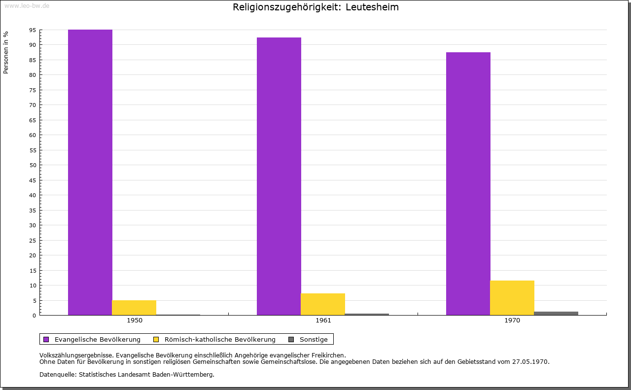 | Kirche und Schule: | Leutesheim, in dem 1434 eine Kirche erwähnt wird, war bis 1716 Filialkirche von Auenheim, dann eigene evangelische Pfarrei. Die vor der Reformation St. Margaretha geweihte Kirche wurde 1740 barock erweitert. Die Katholiken zur Pfarrei Hönau (Gemeinde Rheinau). |