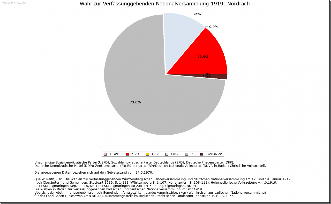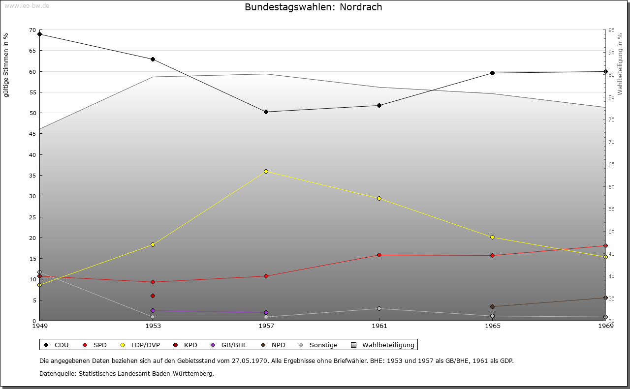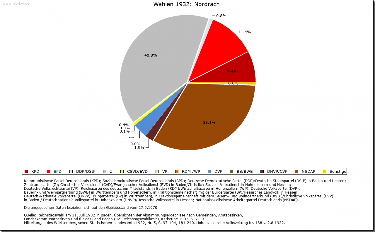 | Geschichte: | 1139 (Корialüberlieferung 13. Jahrhundert) Norderaha, das nördliche Wasser. Rodungssiedlung des Hochmittelalters im Gengenbacher Gebiet. Nordrach hat mit Zell gemeinsame Geschichte. Dem Abt von Gengenbach verblieb 1366 das Recht, den Schultheißen einzusetzen. Die Gemeinde Nordrach versuchte um 1662 die Unabhängigkeit von Zell zu erlangen, mußte aber 1670 die Zugehörigkeit zu den Landstäben der Reichsstadt wieder anerkennen. Erst nach der Übernahme durch Baden 1803 die Schottenhöfe mit Mühlstein und Nordrach-Fabrik, die unmittelbar gengenbachisch waren, nach Nordrach eingemeindet, letzteres aber 1823-1929 wieder als eigene Gemarkung abgesondert. Nordrach gehörte zum Вezirksamt Gengenbach, kam 1857 zum Вezirksamt Offenburg, 1936 zum Bezirksamt/Landkreis Wolfach. |