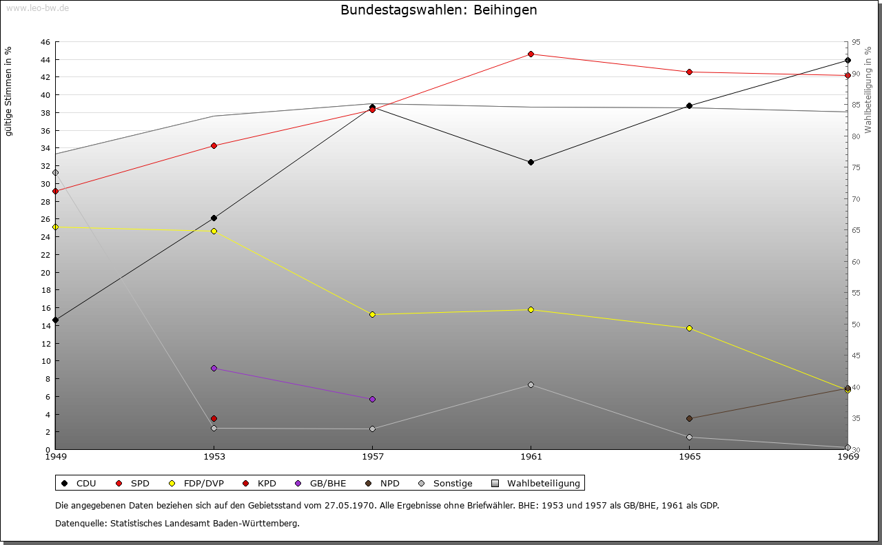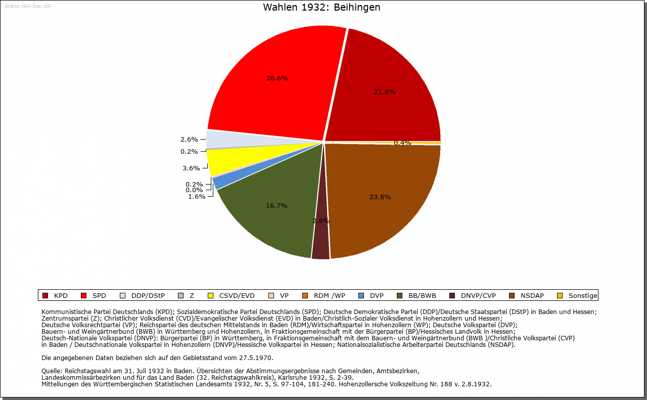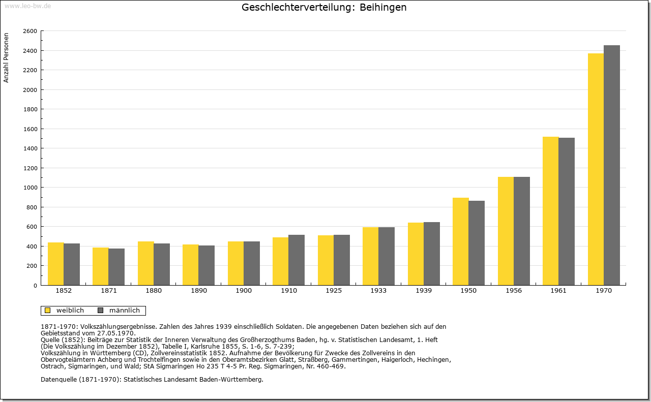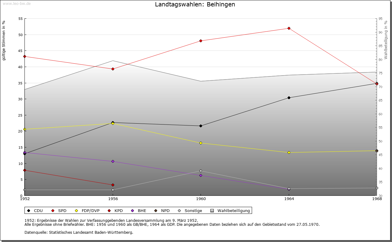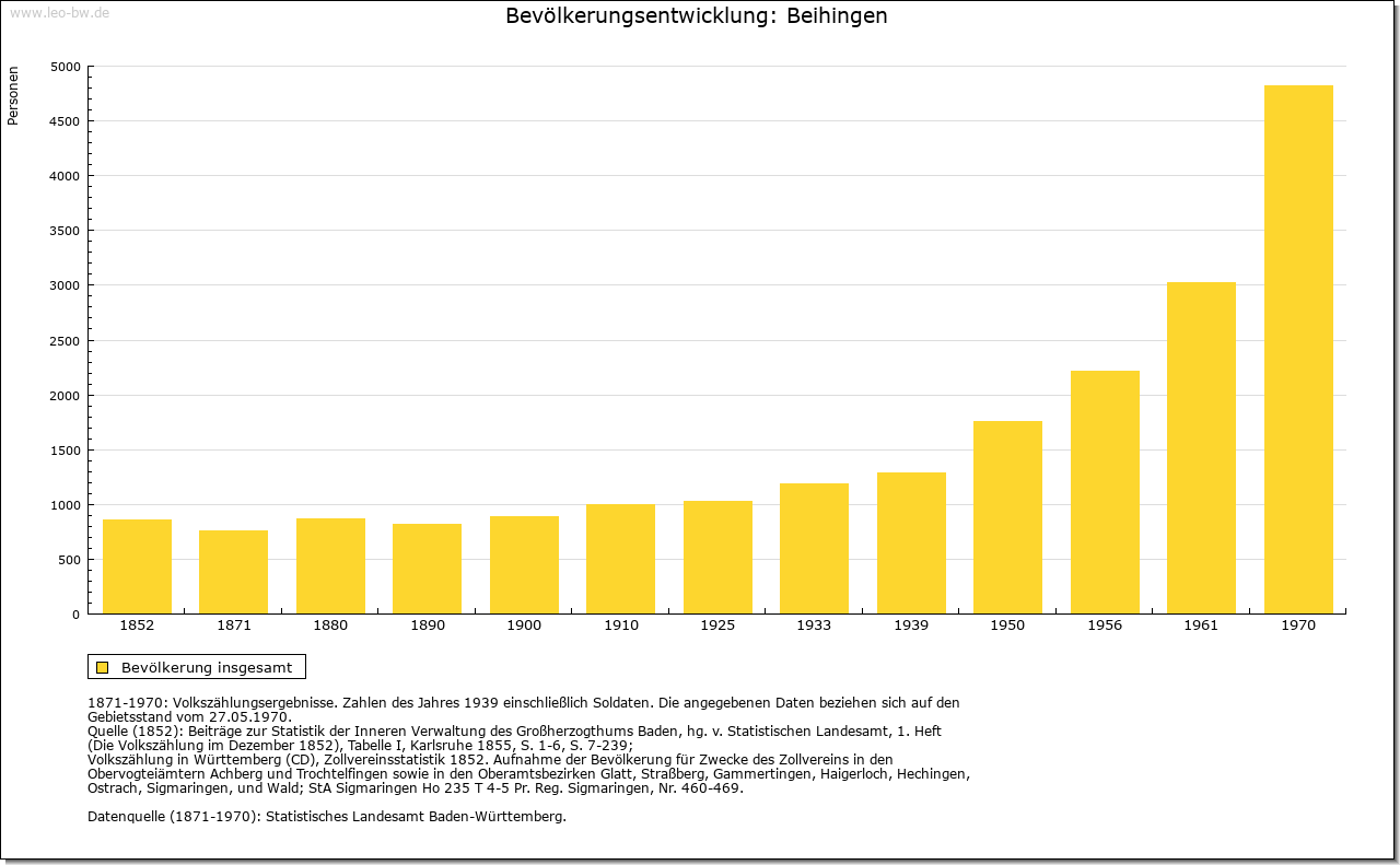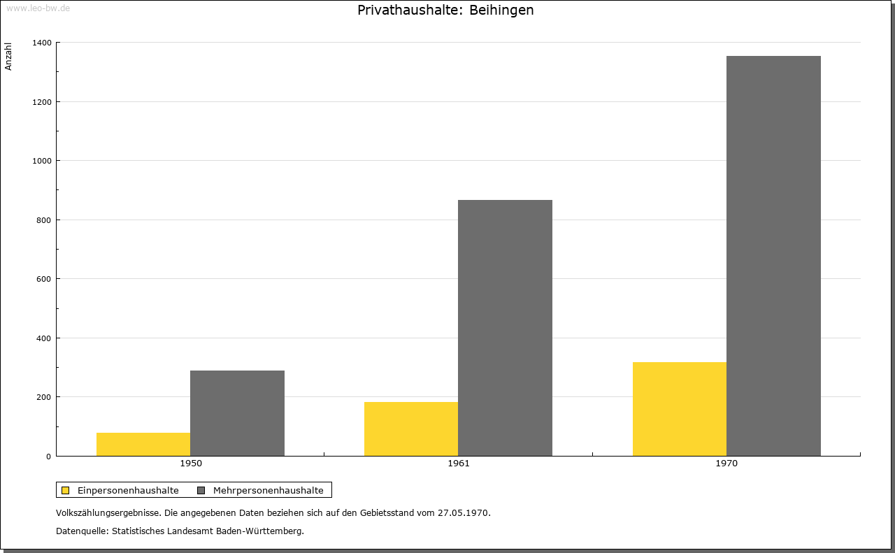 | Geschichte: | 844 (Kopialüberlieferung 12. Jahrhundert) villa Biginga, 972 Binga, 1257 Bihingin (Personenname); in neuerer Zeit (bis 1808) auch Neckarbeihingen. Siedlung der ältesten Schicht. Vereinzelte merowingerzeitliche Gräber im Friedhof und an der Straße nach Geisingen. 844 erhielt das Kloster Lorsch, 972 das Hochstift Speyer Besitz. Von den Grafen von Calw kam der Ort im Erbweg an die Grafen von Löwenstein und von Asperg (Pfalzgrafen von Tübingen). Lehensherrliche Rechte besaßen auch die Grafen von Vaihingen. Ortsadel in der 2. Hälfte des 13. Jahrhunderts bezeugt, z.T. identisch mit den von Oßweil. Der aspergische Teil von Beihingen (zwei Fünftel) gelangte mit der Grafschaft Asperg 1308 an Württemberg, dem um 1350 die Hälfte an Vogtei und Gericht sowie 21 Hofstätten gehörten. Württemberg übertrug 1338 seinen Anteil an die Nothaft von Hochberg, 1395 an die von Stammheim und nach deren Aussterben 1592 an die Schertlin von Burtenbach als Lehen. 1782 löste Herzog Carl Eugen von Württemberg dieses Lehen ab und verleibte es dem Kammerschreibereigut ein. Der größere Teil des Dorfes (drei Fünftel) war löwensteinisch und kam 1504 nach dem pfälzischen Krieg unter württembergische Lehenshoheit. Er war dem Ritterkanton Kocher inkorporiert. Seit 1505 hatten ihn als löwensteinisches Lehen die Nothaft inne, seit 1534 die von Freyberg, von denen ihn Hans Georg von Hallweil und Friedrich von Breitenbach erbten. 1673 und 1711 erwarben ihn die von Gemmingen-Horneck. 1805 fiel er an Württemberg. Seit Anfang des 19. Jahrhunderts bildet Beihingen einen Bestandteil des Oberamtes (Landkreis) Ludwigsburg. 1626 starben 207 Personen, ein Drittel der Einwohnerschaft, an der Pest. Hier ist geboren der volkstümliche Pfarrer und Pädagoge Johann Friedrich Flattich (1713-1797). |