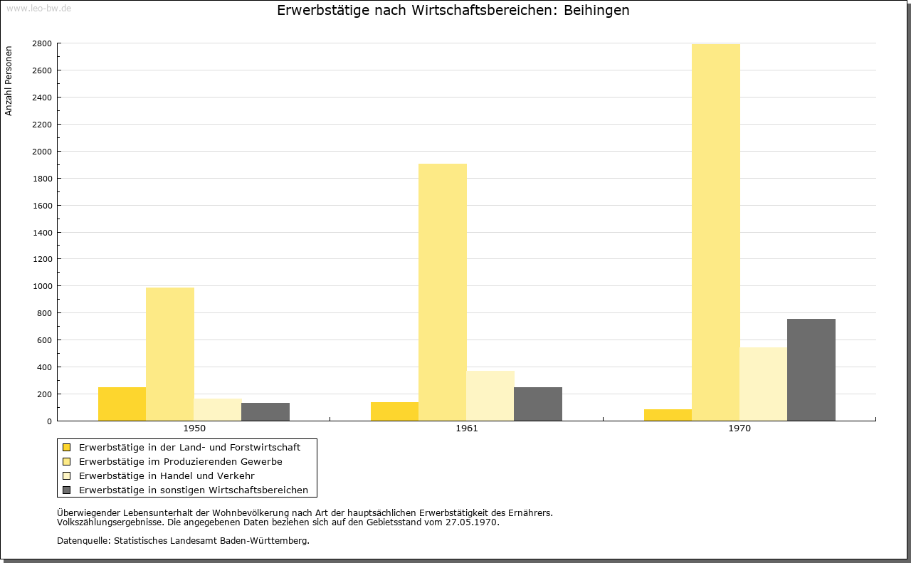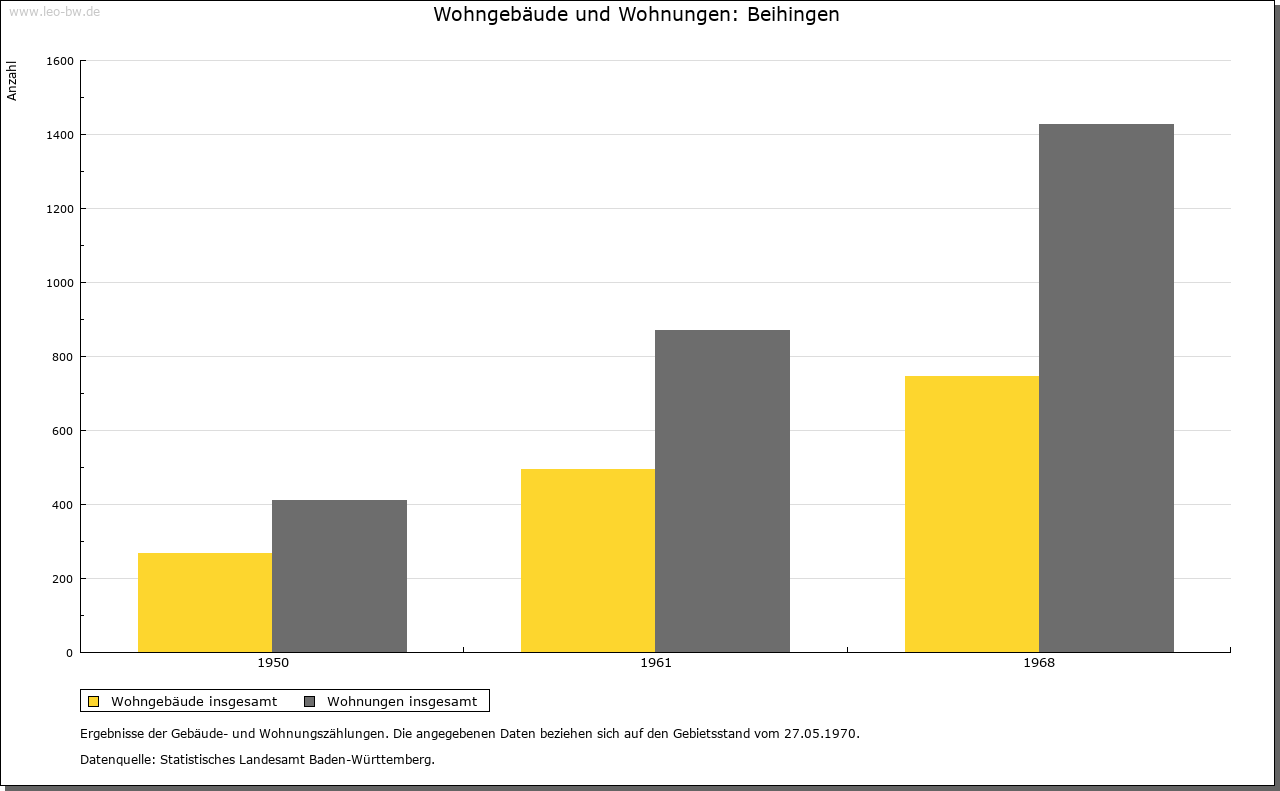 | Ortslage und Siedlung (bis 1970): | Links des Neckars aus der Talsohle am Steilhang aufsteigend das alte Dorf Beihingen, dessen Rathaus von 1614 stammt und das außer einem alten Schloss mit romanischen Resten noch ein »Neues« von 1573 besitzt. Durch Wohnsiedlungen hat sich der Ort nach dem Zweiten Weltkrieg baulich vergrößert und ist mit den anderen Gemeindeteilen zusammengewachsen. Außer der Landsiedlung (1963/64) östlich des neuen Ortszentrums entstanden die Wohngebiete »Fuchsäcker-Klinge« und »Hohlweg« (1972). In der Neckartalaue am östlichen Ortsrand liegt das Industriegebiet »Neckar«, am südlichen das Gewerbegebiet »Ludwigsburger Straße«, beide 1965 begonnen. |