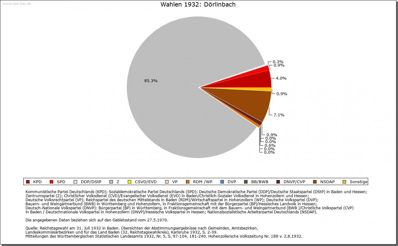 | Geschichte: | 1132 (Корialüberlieferung 16. Jahrhundert) Derlinbach, 1225 Derlebach, von Personenname. Hochmittelalterlicher Ausbausiedlung wahrscheinlich des Klosters Ettenheimmünster, dessen 1225 belegter Dinghof Mittelpunkt des Ortes war. Die Kastvogtei trugen, wie über das Kloster, die Geroldsecker von Straßburg zu Lehen, während die niederen Gerichtsrechte beim Kloster lagen. Nach dem Aussterben der Geroldsecker 1634 zog Straßburg die Vogtei an sich und behauptete sie gegen den Widerstand des Klosters (1740 bestätigt). Landeshoheit bis 1803 bei Straßburg, Klosteramt Ettenheimmünster. 1803 an Baden, 1809-1924 Amt Ettenheim, dann Bezirksamt, 1939 Landkreis Lahr. Dörlinbach gehörte zur Ettenheimer Waldgenossenschaft und erhielt 1807 seinen Waldanteil. |