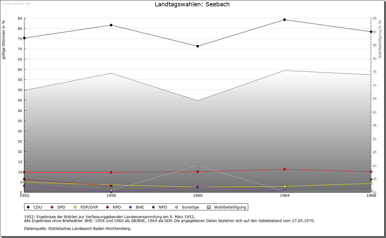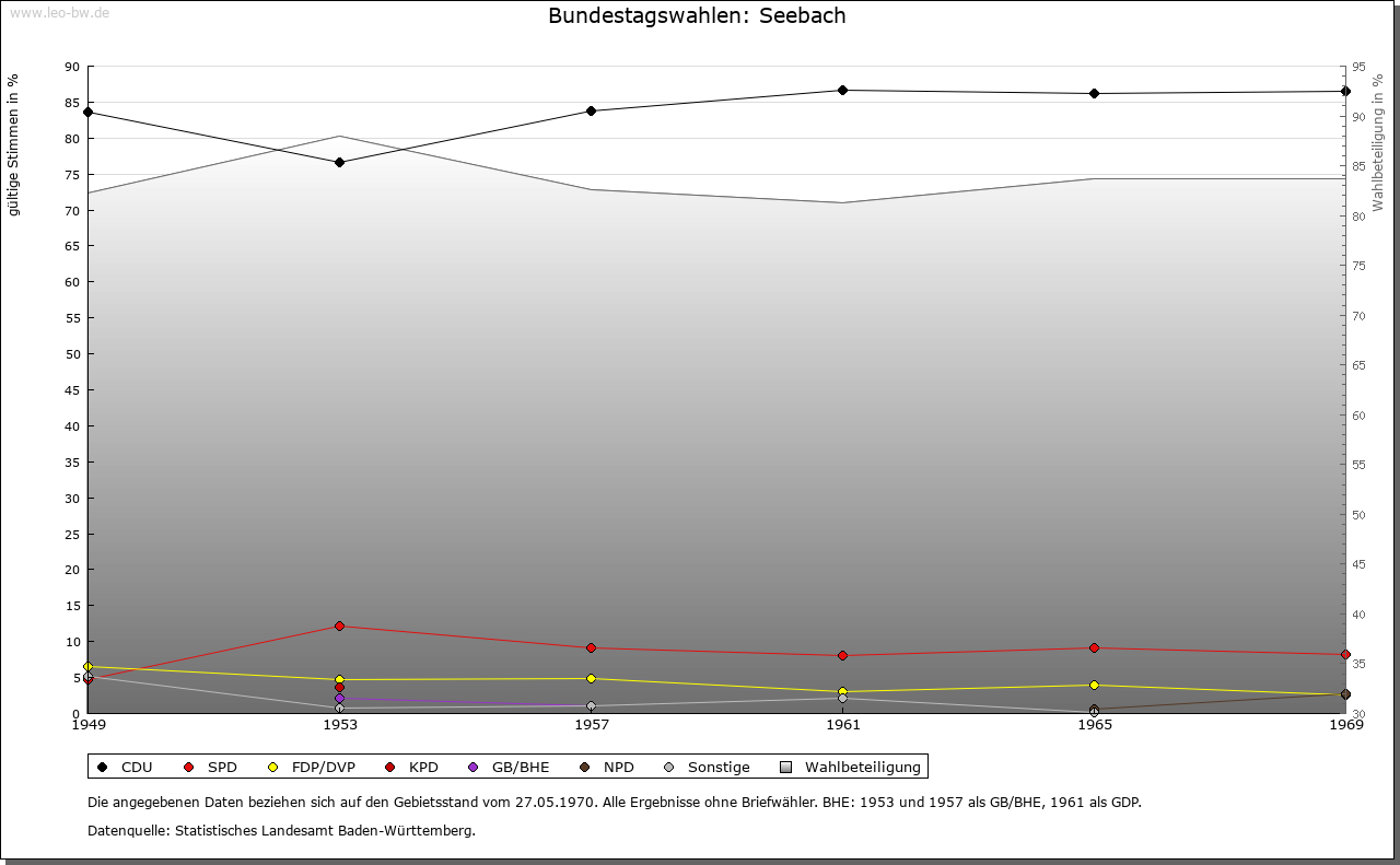 | Geschichte: | 1347 Sebach, nach dem vom Mummelsee herabkommenden Bach genannt. Späte Ausbau-Siedlung im hinteren Achertal. Vorder- und Hinterseebach unterschieden. Zur straßburgischen Herrschaft Oberkirch, Gericht Kappelrodeck gehörig. 1803 an Baden, Amtszugehörigkeit wie Kappelrodeck. |