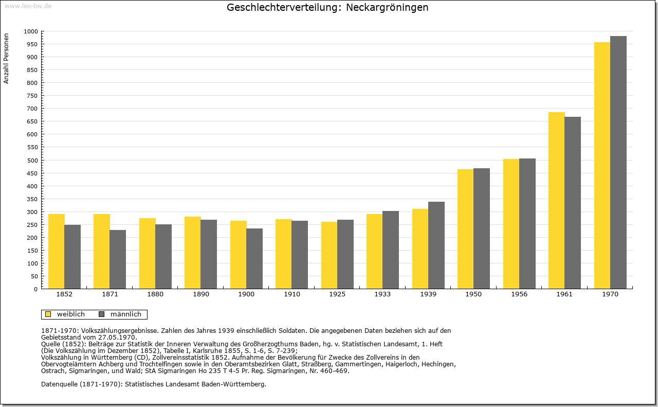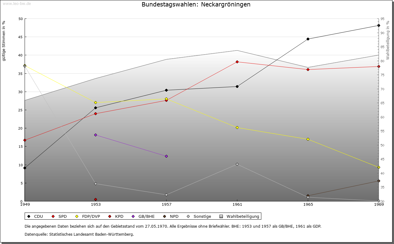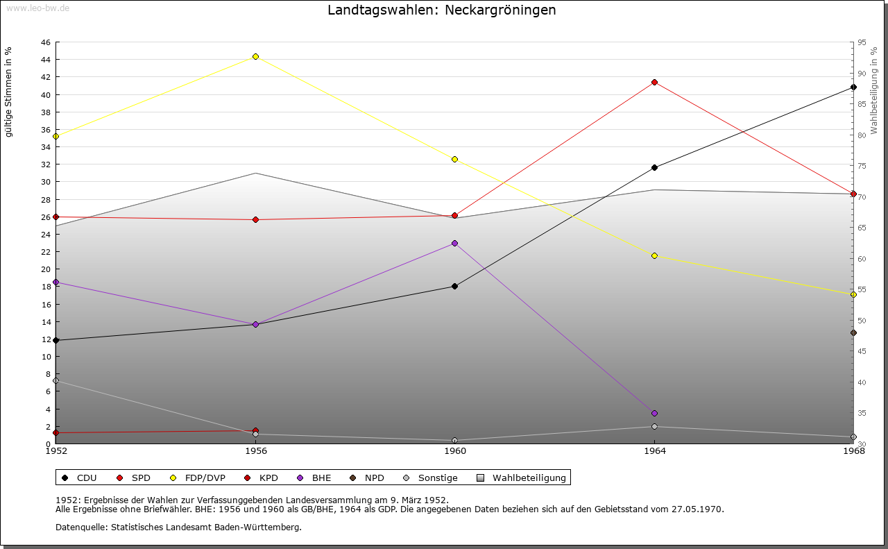 | Geschichte: | 779 (Kopialüberlieferung 9. Jahrhundert) Gruoninga, 806 Gruoninchheim in pago Neckargowe, 1275 Gruoingen, 1279 Nekkergruningen (im Unterschied zu Markgröningen). Siedlung der ältesten Schicht. Zwei merowingerzeitliche Bestattungsplätze im Südwesten bzw. Nordwesten des Orts. 779 erhielt Kloster Fulda durch Graf Kunibert, 806 Kloster Lorsch Besitz, 1279 Kloster Bebenhausen ansehnliche Einkünfte. Neckargröningen gelangte wohl mit Waiblingen in der 1. Hälfte des 13. Jahrhunderts an Württemberg. Im 14. und 15. Jahrhundert mehrfach verpfändet an Georg und Wilhelm von Kaltental (1307), an die Schenken von Limpurg (bis 1434) und an Hans von Bernhausen (1464). Das Dorf bildete lange mit Neckarrems eine Gemeinde. Bereits 1442 hier eine Neckarfähre erwähnt. Die 1735 erbaute überdachte Holzbrücke 1930 abgebrochen. Das Dorf gehörte vom Mittelalter bis zum Jahr 1938 mit einer kurzen Unterbrechung im 18. Jahrhundert (Oberamt Ludwigsburg) zum Oberamt (Amt) Waiblingen. |