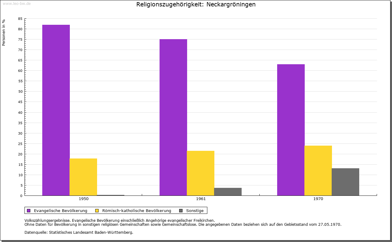 | Kirche und Schule: | Die dem Hl. Martin geweihte Pfarrkirche, deren Nordturm und netzgewölbter Chor aus spätgotischer Zeit stammen, erstmals 1275 erwähnt. Das Kirchenpatronat hatten 1339 die Herren von Lichtenstein, seit 1412 die von Dürnau inne. Von letzteren kamen Kirche und Kirchensatz 1438 an das Stift Stuttgart, dem die Kirche im folgenden Jahr inkorporiert wurde. 1732-1738 wirkte in Neckargröningen als Ortsgeistlicher der geistliche Liederdichter Philipp Friedrich Hiller (1699-1769). Katholiken nach Aldingen eingepfarrt. |