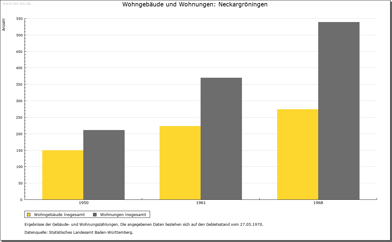 | Ortslage und Siedlung (bis 1970): | Auf der linken Seite des Neckars am flachen Hang wuchs der Ort, in dessen dörflichem Kern fränkische Gehöfte und Fachwerkhäuser erhalten sind, nach dem Zweiten Weltkrieg durch die Neubaugebiete »Leintal-Viehweg« (1961) und »Landäcker« (1974) vorwiegend im Nordwesten. Industrieanlagen bestehen seit 1973 nordöstlich im Gebiet »Schießtal«. |