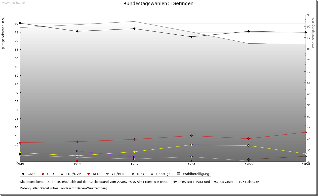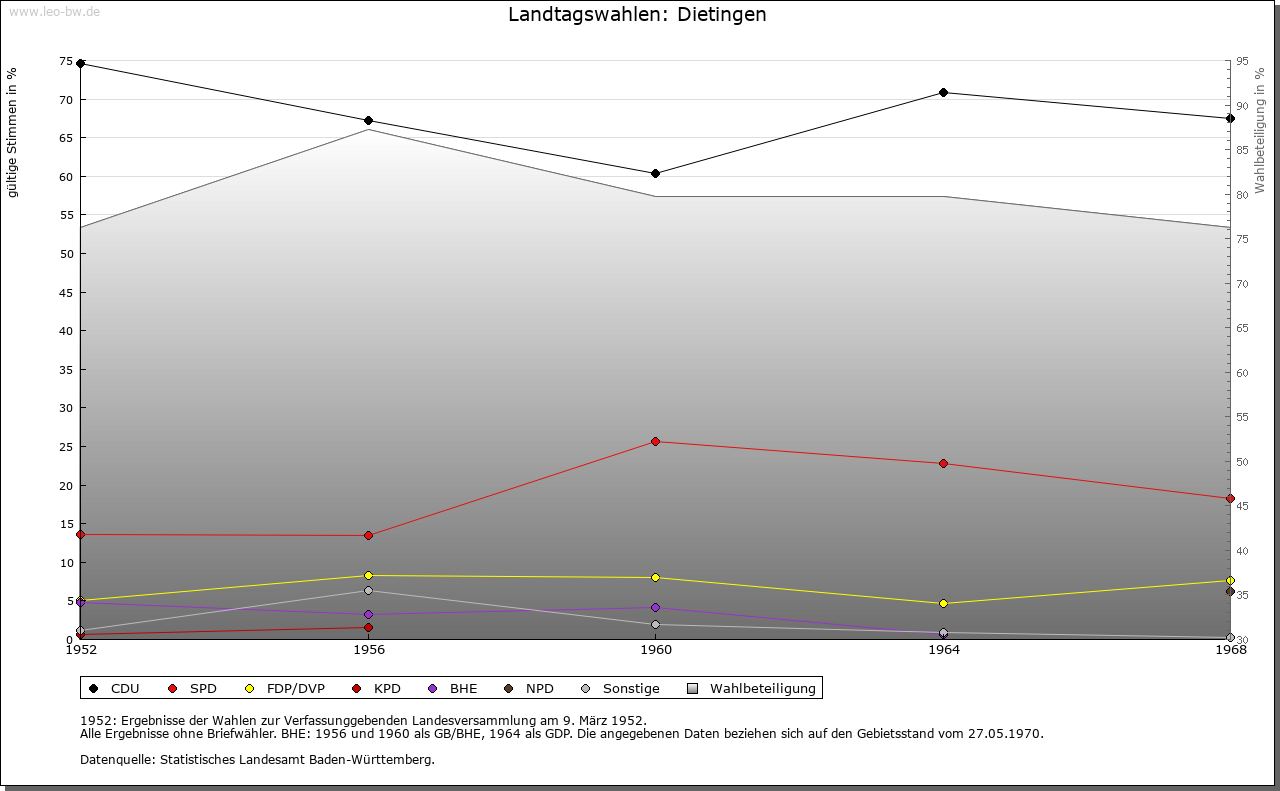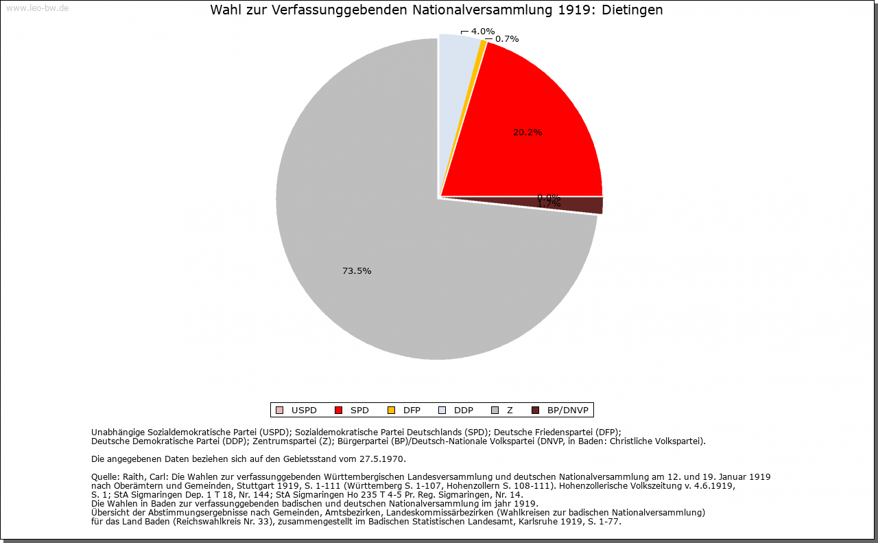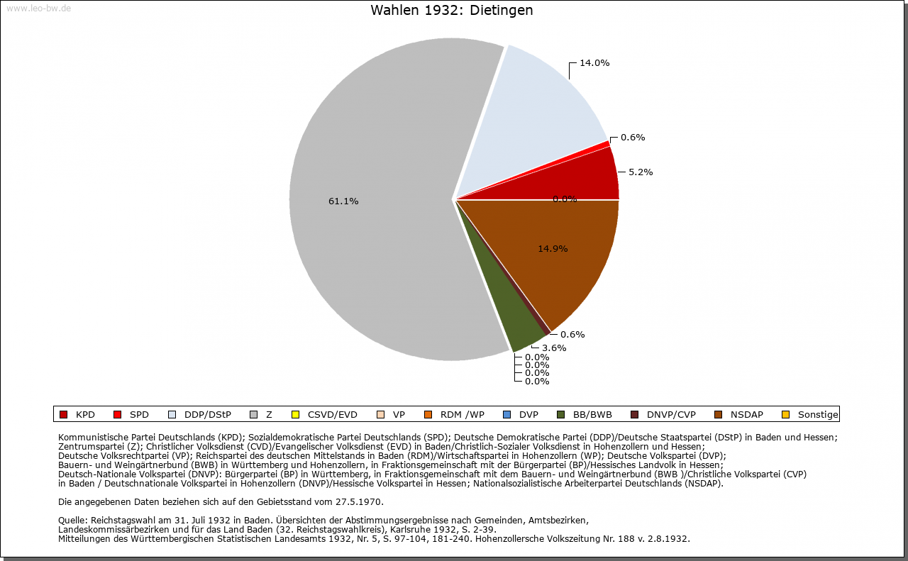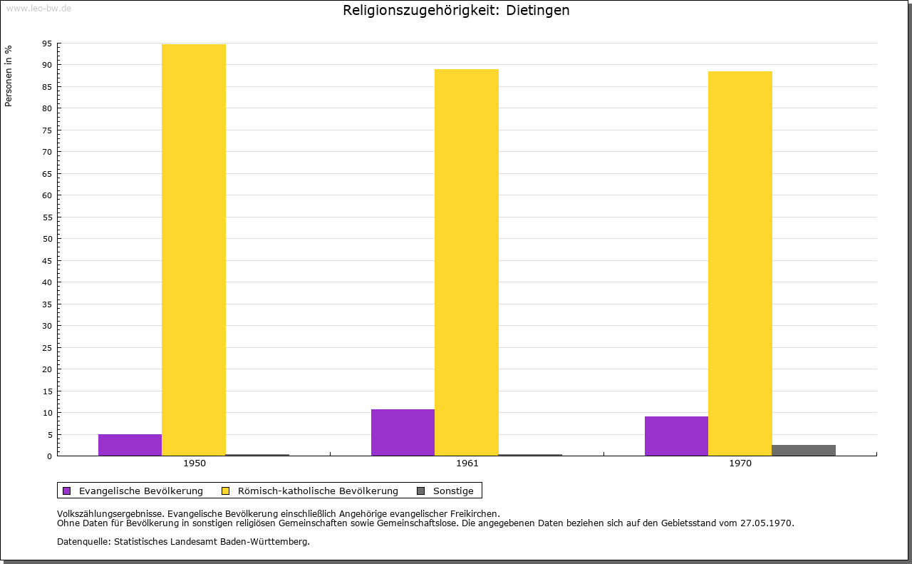 | Geschichte: | Erstmals erwähnt wird Dietingen 786: Graf Gerold schenkte damals Güter in »Deotingun« an das Kloster St. Gallen. 792 erwarb der Konstanzer Bischof Besitz im Ort, 882 konnte dieser durch Tausch weiter vermehrt werden. Nach wie vor bezog St. Gallen um 1200 Einkünfte (den Zehnten) aus Dietingen. 1275 bestätigte Papst Gregor X. auch dem Rottweiler Spital Güter in Dietingen. Im 14. Jahrhundert war der Zehnte im Besitz der Fürstenberger, die ihn wiederholt zu Lehen ausgaben. Bereits 1327 besaß Kloster Rottenmünster sechs Höfe und ein kleines Lehen; zwischen 1336 und 1427 konnten drei weitere Höfe erworben werden. Noch 1736 besaß das Kloster neun Höfe und zwei Einzelstücke in Dietingen, veräußerte aber bis 1767 einen Teil dieser Lehen. Seit dem 14. Jahrhundert hatten verschiedene Familien der Rottweiler Oberschicht Besitz in Dietingen. Im 18. Jahrhundert gehörten Lehen dem Rottweiler Spital, den Dominikanerinnen, Dominikanern, Jesuiten, Heiligkreuz, dem Rottweiler Siechenhaus von Allerheiligen, dem Kastenamt und der Rottweiler Stipendienverwaltung, der Johanniterkomturei, dem Kloster Rottenmünster (fast ein Drittel aller Lehensgüter im Dorf) und dem Spital in Villingen. 1361 übertrug Ritter Reinher von Rüti seiner Tochter Margarete anlässlich ihrer Ehe mit Burkhard von Neuneck Dietingen gemeinsam mit der Neckarburg und einem Teil des darunter liegenden Weilers sowie je einer Hälfte von Hohenstein und Irslingen. 1411 verkaufte Margarete den gesamten Besitz an Graf Hermann von Sulz, der ihn umgehend an die Stadt Rottweil weiterveräußerte. Seit der Rottweiler Verwaltungsreform von 1545/46 gehörte Dietingen zur Rottweiler Obervogtei. An der Spitze der Gemeinde stand ein Vogt (1482), der jährlich durch alle männlichen Einwohner gewählt wurde. Zusammen mit dem Untervogt und etwa sieben vom Rottweiler Obervogteiamt bestellten Richtern bildete der Vogt das Dorfgericht. Umstritten ist die Existenz eines Dietinger Ortsadels im Mittelalter. 1179, 1180 und 1187 wird als Zeuge für die Zähringer Heinrich von Dietingen erwähnt. Weitere Belege fehlen. Vom Ende des 13. Jahrhunderts bis ins 16. Jahrhundert taucht in Rottweil eine Familie »Dietinger« auf, die über größeren Besitz in der näheren Umgebung, nicht aber in Dietingen selbst verfügte. Die Burg Hohenstein auf der östlichen Hochfläche des Neckartals, erstmals 1271 genannt, war ursprünglich entweder im Besitz der Grafen von Sulz oder der Herzöge von Urslingen. Später war die Burg im Besitz des Geschlechts von Rüti und ging, gemeinsam mit Dietingen an die Stadt Rottweil über. Im 17. und 18. Jahrhundert war sie im Besitz Rottweiler Bürger, seit 1839 samt Hofgut Eigentum der Grafen von Bissingen-Nippenburg. 1923 wurde das neue Schloss erbaut, 1975 als unbewegliches Kulturdenkmal ins Denkmalbuch eingetragen, 1977 an den Wohnungsbauunternehmer Arnulf Gutheil verkauft. Das Hofgut Tierstein südwestlich von Dietingen an einem steilen, felsigen Neckarabhang, gehörte zu einer im 12. Jahrhundert hier stehenden Fliehburg. Aus dem Besitz der Familie Rüti kam es in die Hände der Familien von Neuneck und Hohenberg, später zu Rottweil. Nach der Zerstörung 1631 durch die Schweden wurde es wieder aufgebaut, die neue Kapelle aber Anfang des 19. Jahrhunderts abgebrochen. Bis 1848 war es in österreichischem Besitz, danach in privater Hand. Dietingen gehörte zum Obervogteiamt der Stadt Rottweil. 1803 fiel es an Württemberg, Stadtoberamt Rottweil, 1806/08 Oberamt Rottweil. |