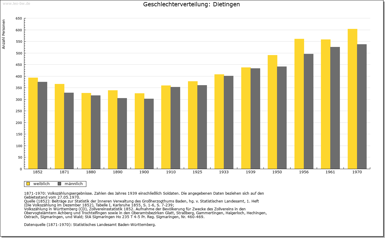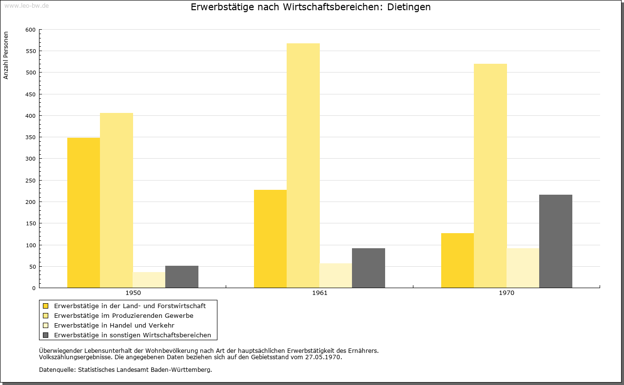 | Wirtschaft und Bevölkerung: | Die Bevölkerung bestand aus Bauern und Taglöhnern. Die Bauern nahmen dabei kaum ein Drittel ein, hatten aber mitunter sehr große Höfe, in der Regel nicht unter 50 Jauchert Acker. Der größte Bauer besaß 1737 über 238 Jauchert, sieben weitere Bauern verfügten über 100 Jauchert, zehn Bauern über 50–100 Jauchert, die 23 Taglöhner hatten weniger als einen Jauchert Landbesitz. Nach 1783 wurden auch die Taglöhner zu Fronfuhren für die Reichsstadt herangezogen. 1611 fielen der großen Pest 45 Erwachsene und 37 Kinder zum Opfer. Trotzdem zählte 1615 die Dietinger Bevölkerung 53 Wehrpflichtige (circa 225 Einwohner). Einen herben Einbruch brachte der 30jährige Krieg. Zwischen 1632 und 1634 starben, noch vor der großen Pestwelle von 1635, 125 Erwachsene. 1675 wurden nur noch 28 Wehrpflichtige in Dietingen gezählt. Zwischen 1659 und 1700 erfolgte eine starke Zuwanderung. 1737 werden 76 Besitzer von Grund und Boden aufgeführt, 1782 waren es 90. 1802 wurden in Dietingen 128 Steuerzahler (circa 540 Einwohner) gezählt. Wirtschaftlich scheint bereits im Mittelalter der reiche Waldbestand besonders bedeutend gewesen zu sein. Eine Rolle spielte unter anderem die Flößerei nach Sulz. Dem Erwerb dienten außerdem Viehzucht und Getreideanbau. Handwerk war den Untertanen der Rottweiler Landschaft untersagt. Erst 1698 erhielt Dietingen nach Streitigkeiten mit der Stadt durch eine kaiserliche Kommission einen Schneider. Wirtschaften und Mühlen (Getreidemühle im Wettebachtal, Ölmühle im Ort) waren von Reglementierung ausgenommen, doch mussten die Wirte der Stadt Anerkennungszinsen sowie eine Getränkesteuer (Umgeld) bezahlen. Im 18. Jahrhundert genehmigte Rottweil weitere Handwerker. Langanhaltende Streitigkeiten um die Dietinger Allmende gab es mit der Reichsstadt im ausgehenden 17. und beginnenden 18. Jahrhundert. |