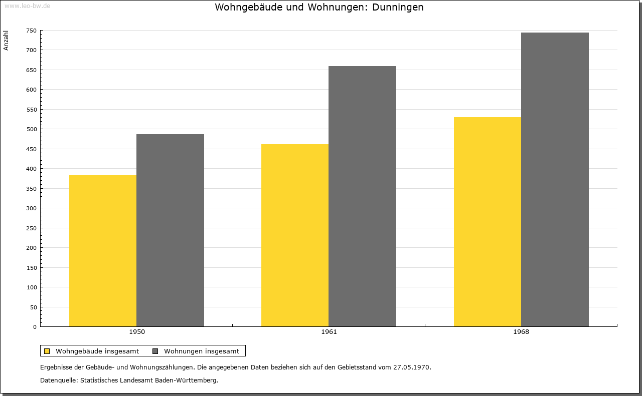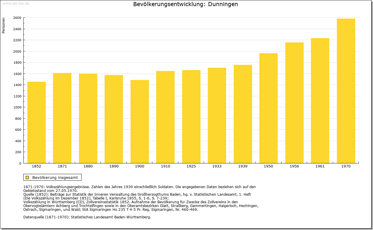 Ortslage und Siedlung (bis 1970): | Auf Dunninger Gemarkung, im Händelbrunner Harzwald sowie im Heckenwald, finden sich Grabhügel der Hallstattzeit, römische Siedlungsspuren werden im Bereich der späteren Heilig-Kreuz-Kapelle vermutet. Der Zeit um 610/20 beziehungsweise 620/30 werden zwei reich ausgestattete Frauengräber zugeordnet, die 1965/68 bei Bauarbeiten im Untergrund der Martinskirche entdeckt wurden. Die beiden Frauen werden von der archäologischen Forschung als Angehörige einer auf einem örtlichen Herrenhof ansässigen alemannischen Führungsschicht gedeutet, die sodann um 630/40 oberhalb der Gräber die erste, noch aus Holz gefertigte Kirche Dunningens errichtete. Mit diesen archäologischen Funden, der frühen urkundlichen Nennung von Ort und Kirche 786, der außerordentlich großen Markung, der Ortsnamensendung auf -ingen und nicht zuletzt dem Martins-Patrozinium der einen weiten Umkreis erfassenden Mutterpfarrei gilt Dunningen als zentraler Ort der ältesten alemannischen Siedlungsschicht. In der frühen Neuzeit präsentiert sich das auf hügeligem Hochland zwischen Neckartal und Schwarzwald gelegene Dunningen als großes Dorf mit einem dicht bebauten Kern und im 18. Jahrhundert entstehenden straßendorfartigen Siedlungserweiterungen nach Norden und Westen. Der alte Baubestand wird bei verheerenden Bränden 1736 und 1786 großteils zerstört. Neben der Dorfsiedlung umfasst die Gemarkung vor den Aussiedlungen des 20. Jahrhunderts den nordwestlich gelegenen Weiler Auf der Stampfe, den an Sulgen grenzenden Hof Gifizenmoos sowie den Frohn- oder Berghof, der ursprünglich möglicherweise in Verbindung mit der Burg Neuburgberg an der Eschach steht und 1739 als Lehensgut der Rottweiler Heilig-Kreuz-Bruderschaft 212 Jauchert aufweist. Archäologische Befunde und teilweise auch urkundliche Quellen belegen drei mittelalterliche Burgen: Die den Herren von Kirneck zugeordnete Burg im Ort (»Ziegelhaus«), in unmittelbarer Nachbarschaft der Kirche, die 1465 an die Zimmern und 1523 an die Rottweiler Bruderschaft übergeht und auf der Rottweiler Pürschgerichtskarte von 1564 noch markant in der Ortsmitte zu erkennen ist. Sodann die Neuburgberg oder Burg im Moose in der Eschachniederung, die 1412 von Hans von Burgberg an Konrad von Rammingen übergeht oder 1415 von Johann von Zimmern, genannt der Lapp, erworben wird. Von der südlich des Ortes, oberhalb des Eschachtals gelegenen Birnburg (Bürnburg) ist kaum mehr als ein Ringwall überliefert. Dunningen weist eine straßendorfartige Siedlungserweiterung nach Norden und Westen auf, im Südosten und Nordosten ausgedehntes, planmäßig angelegtes Neubaugebiet mit etwa rechtwinkligem Straßennetz. |