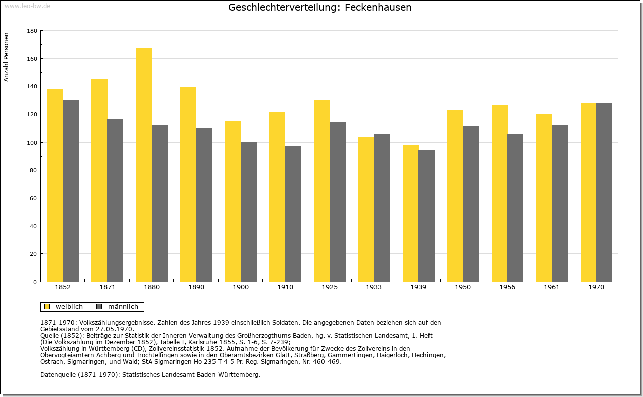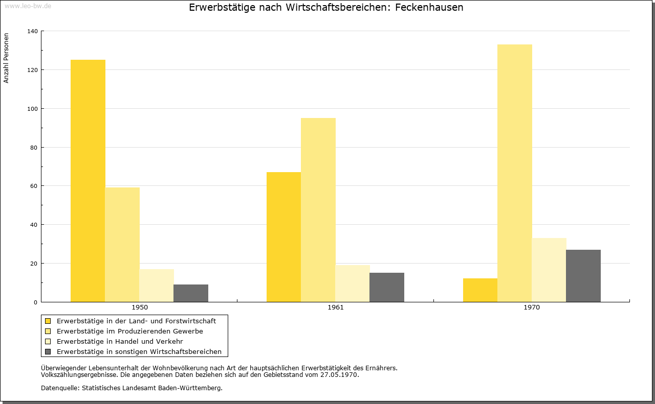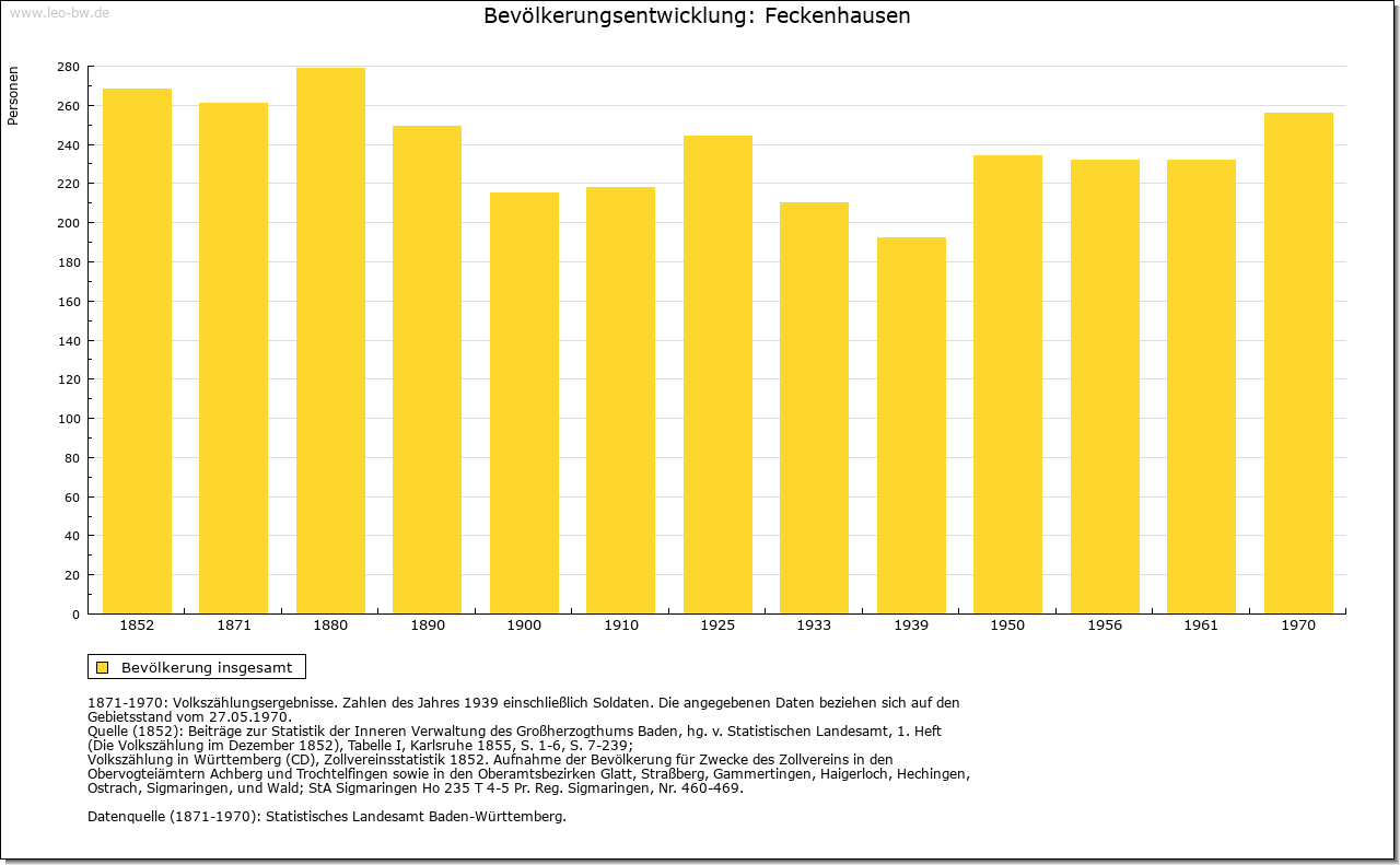 | Wirtschaft und Bevölkerung: | Während man 1615 noch 13 Wehrpflichtige zählte, waren es 1675 lediglich fünf. 1692 lebten in Feckenhausen drei Bauern und fünf oder sechs Tagelöhner. In der Folgezeit erhöhte sich dann langsam die Zahl der Häusler. 1740/41 werden 14 Steuerzahler in Feckenhausen genannt, 1802 waren es dann 19, so dass mit einer Bevölkerung von 63 beziehungsweise 86 Personen gerechnet werden kann. Als es dem Spital 1579 und 1580/81 gelang, zwei große Höfe zu erwerben, richtete man einen ersten Teilbauhof ein. Dieser wurde auf eine festgelegte Anzahl von Jahren verliehen, wobei der Inhaber jeweils ein Drittel der Erträge abzuliefern hatte. 1612 wurde dieser Hof halbiert und an zwei Maier ausgegeben. Als 1673 ein weiteres großes Anwesen in den Besitz des Spitals kam, wurde dieses gleichfalls zum Drittel an einen Bauern verliehen. Einen kleineren Hof, den die Spitalpfleger 1786 erwarben, ließen sie in gleicher Weiser bewirtschaften. 1789 gehörten zu den drei Drittelhöfen mit jeweils rund 100 Jauchert, zum vierten, kleineren rund 55 Jauchert. Hinzu kamen zwölf Häuser ohne und zwei mit geringem Grundbesitz, so dass mit insgesamt 14 Taglöhnern zu rechnen ist. Von rund 214 Jauchert Allmende waren rund 57 Jauchert an Tagelöhner, 33 Jauchert an die vier Maier vergeben. Lediglich rund 121 Jauchert standen für Weidezwecke zur Verfügung. Hinzu kamen 199 Jauchert Waldungen auf der Dorfmarkung. Ein eigenständiges Dorfhandwerk hat die nahe Reichsstadt stets erfolgreich verhindert, so dass die Häusler nur als Knechte in der Landwirtschaft ihren Lebensunterhalt verdienen konnten. 1698 wurde Feckenhausen lediglich ein Schneider zugestanden. 1581 kamen bei der Steingewinnung Mineraleinschlüsse zu Tage, die man für Silber hielt. Der Rottweiler Rat bemühte sich daraufhin erfolgreich bei den kaiserlichen Behörden um eine Steuerbefreiung für die Aufbaujahre des geplanten Bergwerks. Das Unternehmen musste schließlich aufgegeben werden, nachdem erkannt worden war, dass es sich bei dem fraglichen Material nicht um das erhoffte Silber gehandelt hat. |