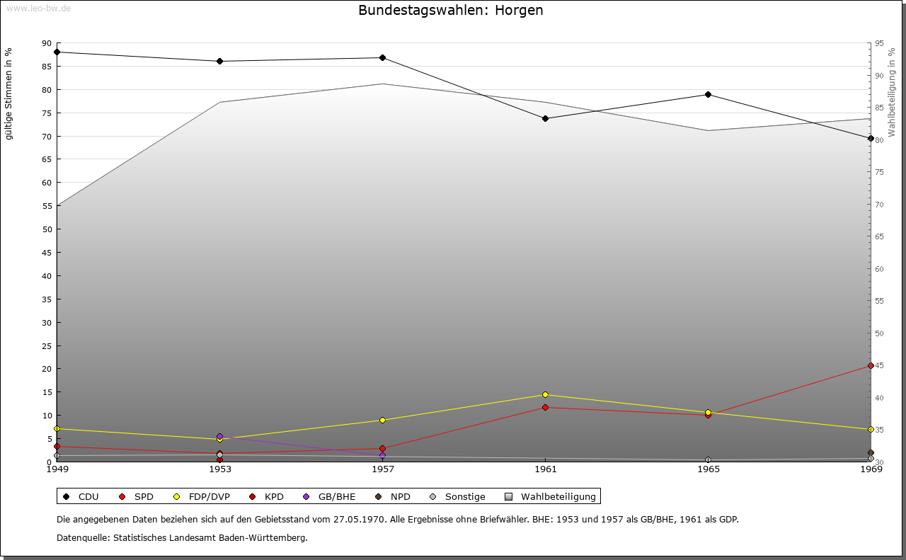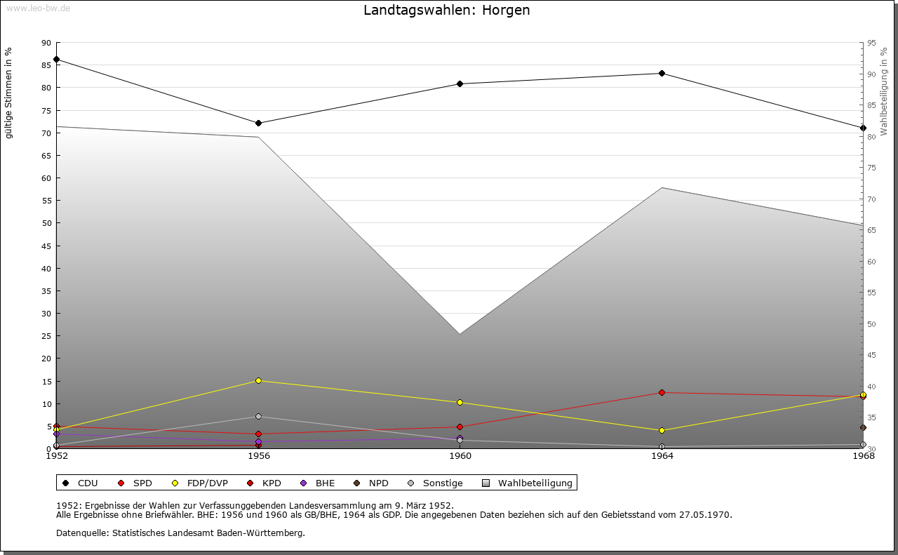 | Ortslage und Siedlung (bis 1970): | Der Name wird vom althochdeutschen und mittelhochdeutschen »hor«, entspricht Sumpfboden, Sumpf, abgeleitet. Der wohl älteste Teil der Siedlung befand sich auf dem heutigen Kirchberg beziehungsweise an dessen Fuße. Mit 969Hektar Land verfügte Horgen über eine der größten Markungen im Kreis Rottweil, gefolgt von Zimmern mit 935 Hektar. 1585 wurden Grenzstreitigkeiten zwischen Flözlingen und Horgen positiv entschieden. 1634 brannte der Ort fast gänzlich ab. Zwei Ortsteile von Horgen am gegenüberliegenden Hang, mit dem Hauptort durch zwei Brücken verbunden. Neubauten im Nordwesten. |