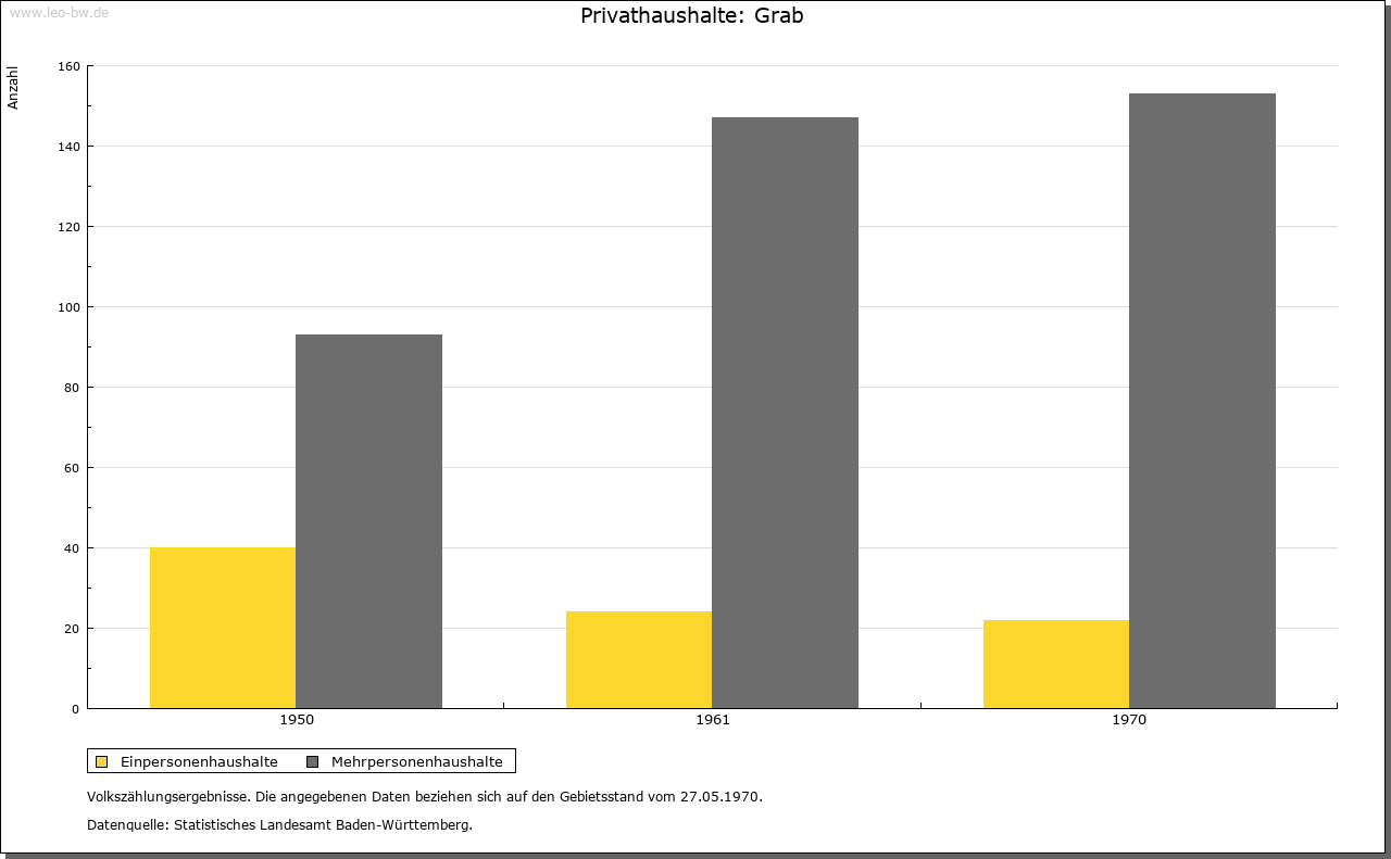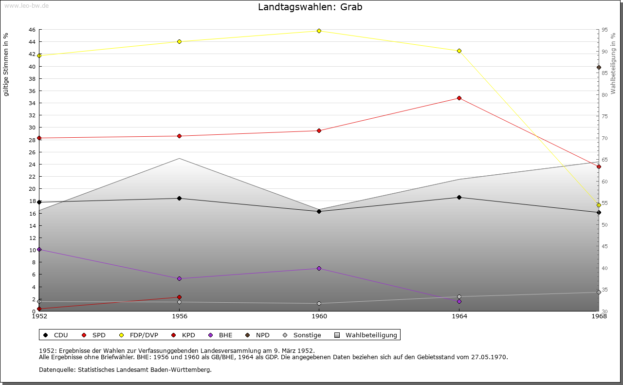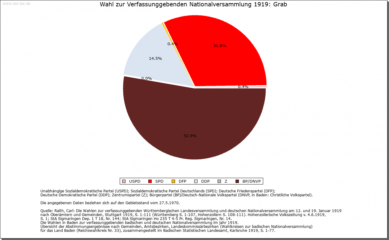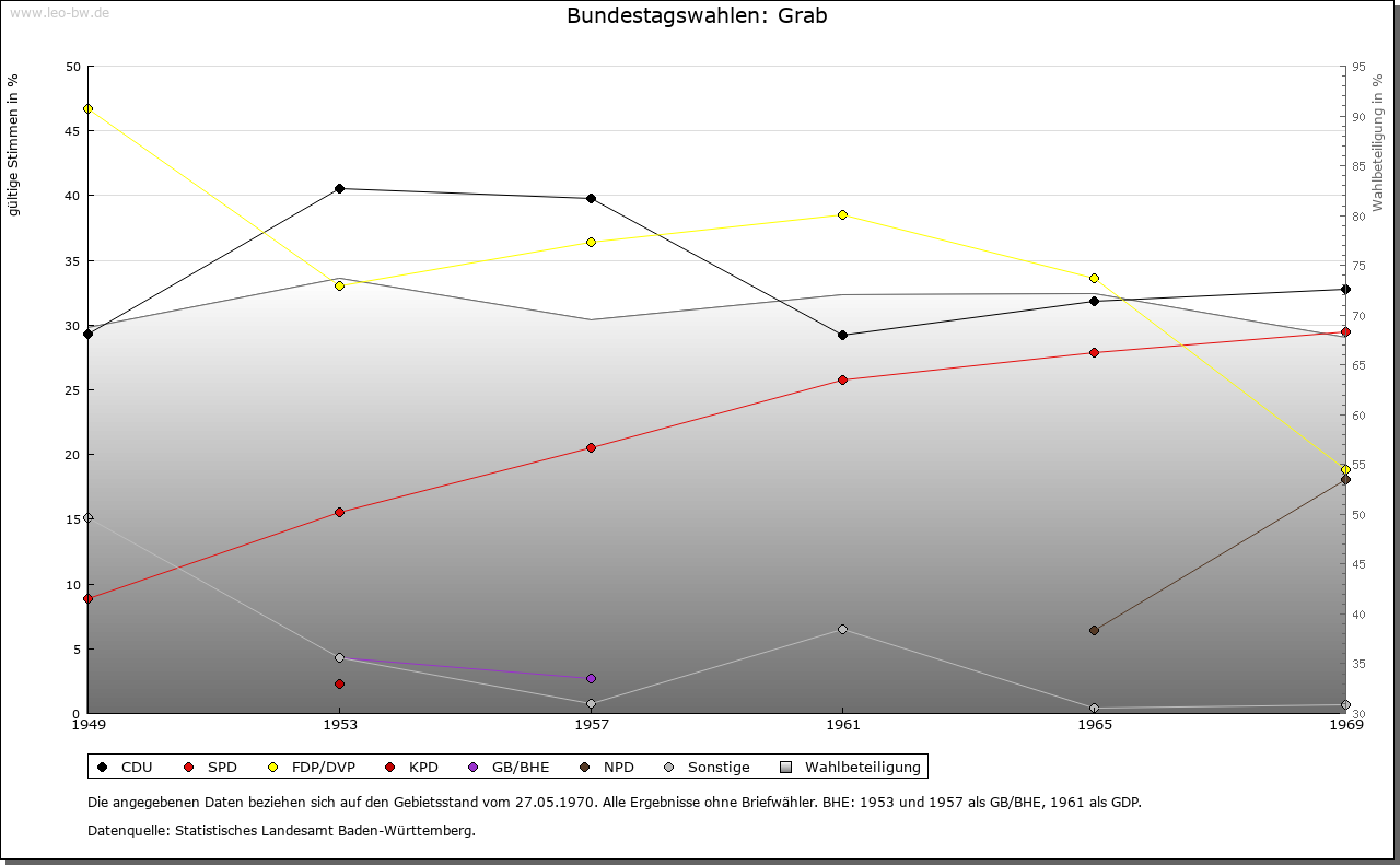 | Geschichte: | 1471 Graab (= Graben, d.h. Limes). Mit den meisten der heutigen Ortsteile ehemals weinsbergisch, wurde Grab vermutlich mit Böhringsweiler 1330 an Hohenlohe verkauft, kam 1471 an Kurpfalz, 1504 an Württemberg und zählte bis Anfang 19. Jahrhundert zu dem 1504 eingerichteten Oberamt Weinsberg (Böhringsweiler Stab). Die politische Gemeinde wurde 1848 aus Parzellen von Murrhardt (Grab, Mannenweiler, Morbach, Schönbronn, Schöntalhäfle) und Sulzbach an der Murr (Hohenbrach und Trauzenbach) gebildet. Sie gehörte zum Oberamt, seit 1938 Landkreis Backnang. |