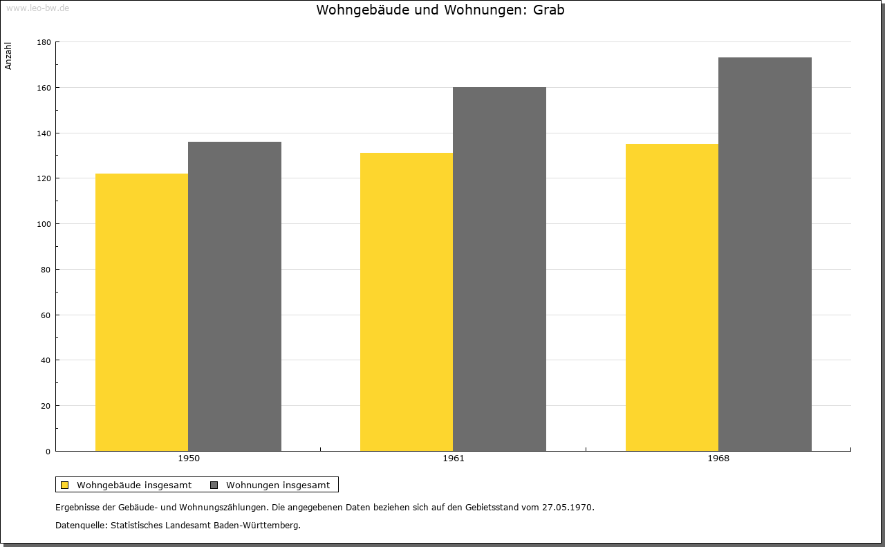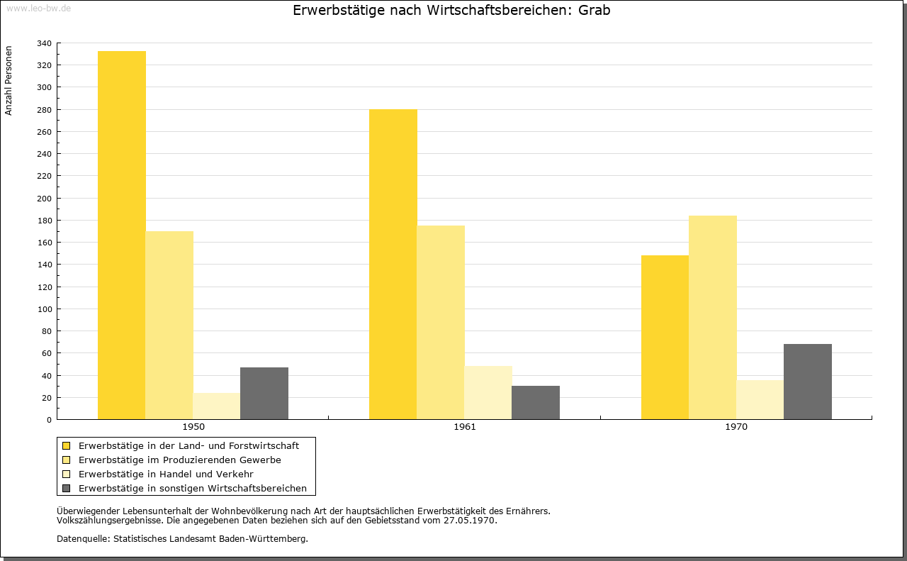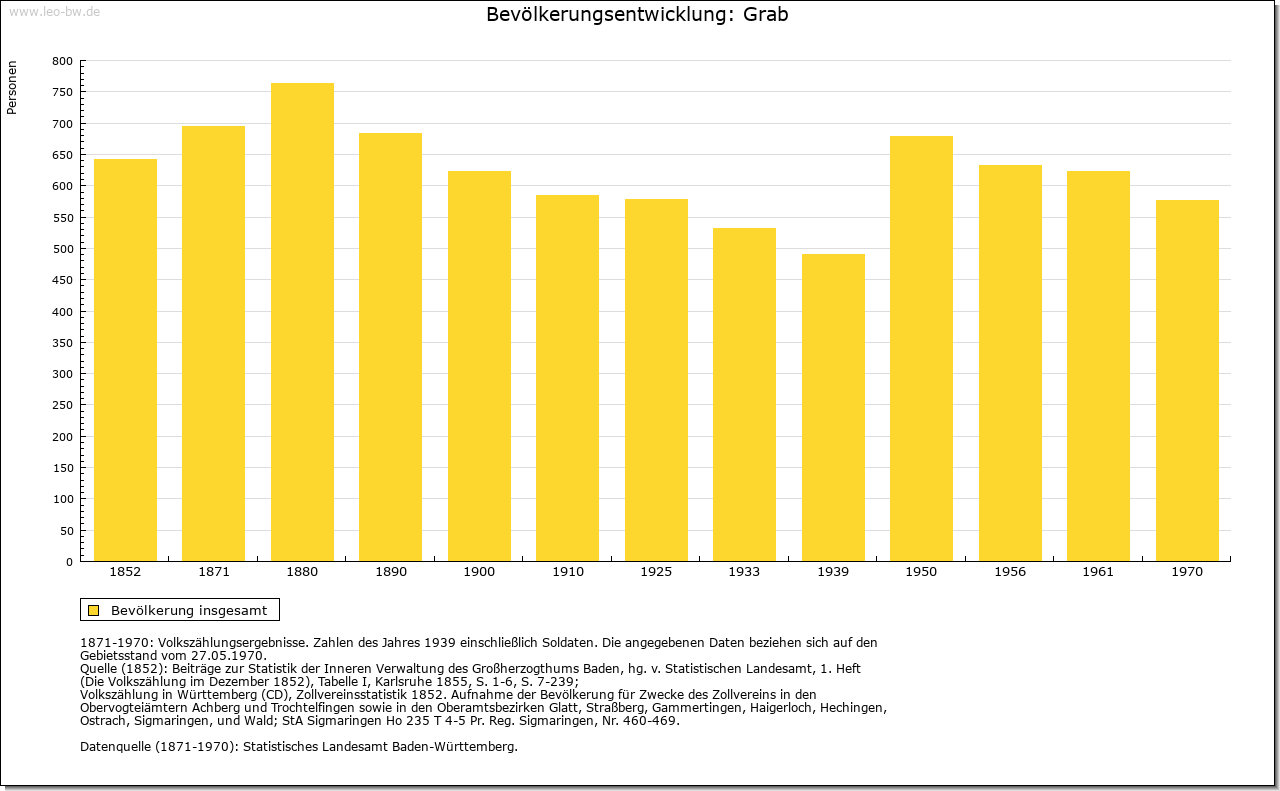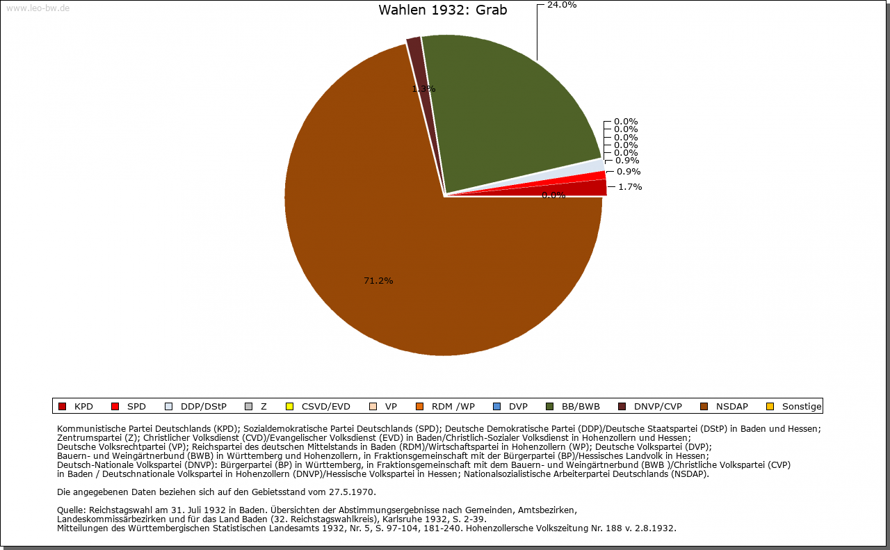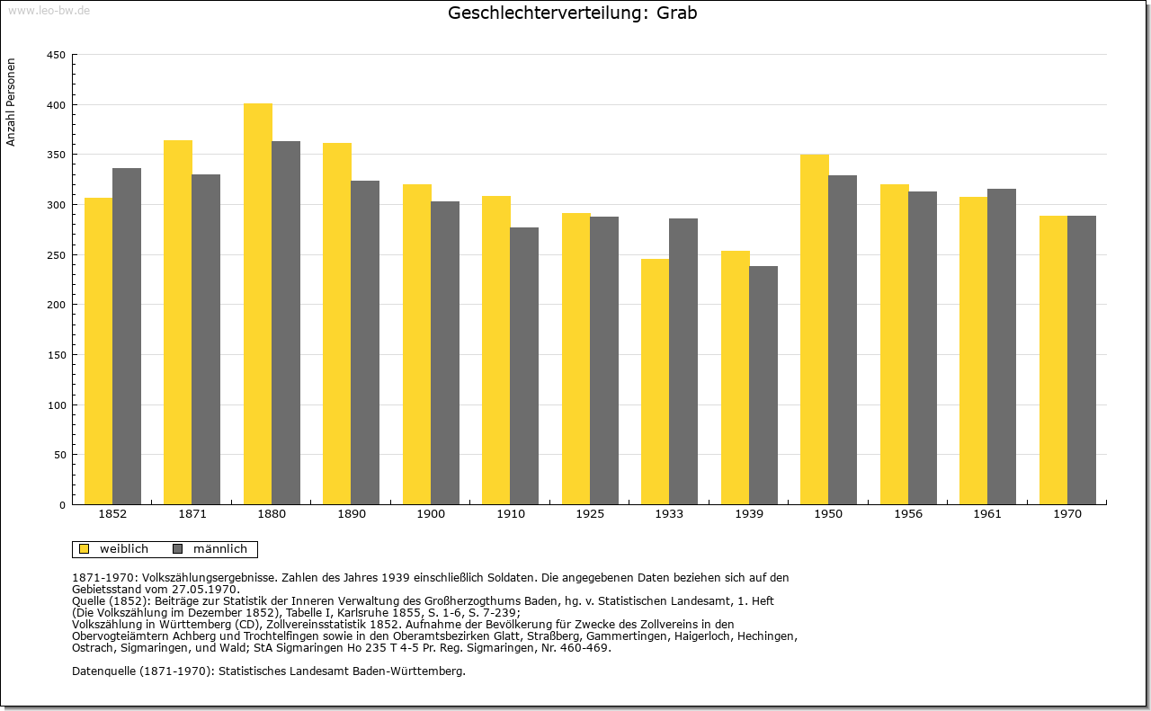 | Geschichte: | 1471 Graab (= Graben, d.h. Limes). Mit den meisten der heutigen Ortsteile ehemals weinsbergisch, wurde Grab vermutlich mit Böhringsweiler 1330 an Hohenlohe verkauft, kam 1471 an Kurpfalz, 1504 an Württemberg und zählte bis Anfang 19. Jahrhundert zu dem 1504 eingerichteten Oberamt Weinsberg (Böhringsweiler Stab). Die politische Gemeinde wurde 1848 aus Parzellen von Murrhardt (Grab, Mannenweiler, Morbach, Schönbronn, Schöntalhäfle) und Sulzbach an der Murr (Hohenbrach und Trauzenbach) gebildet. Sie gehörte zum Oberamt, seit 1938 Landkreis Backnang. |