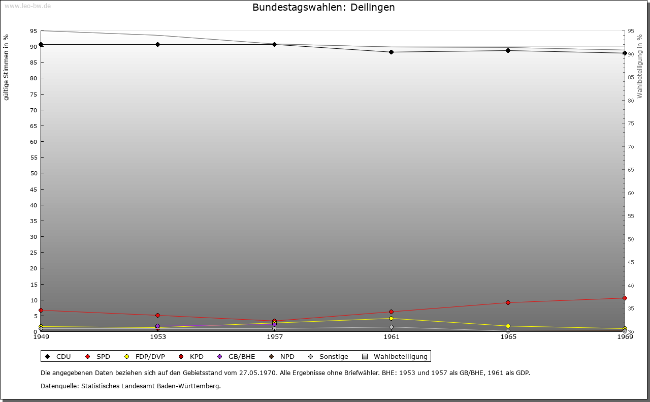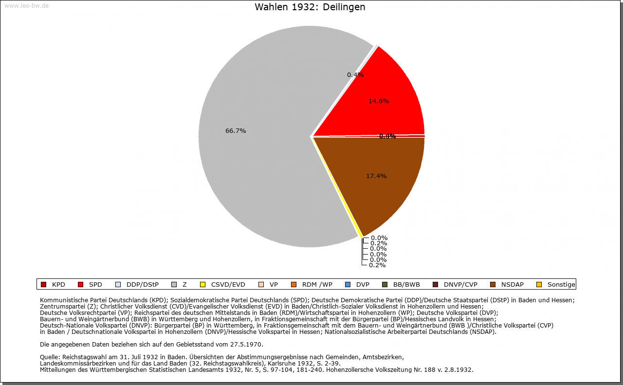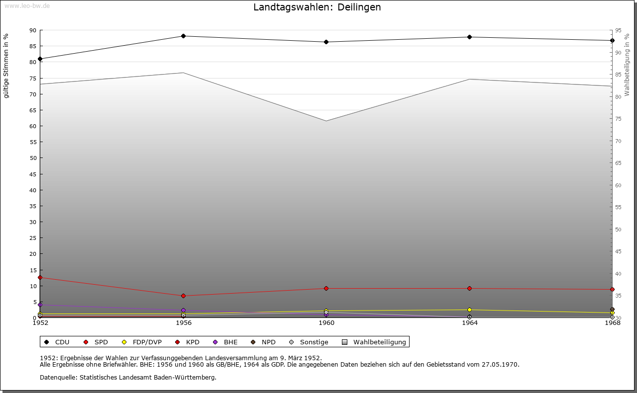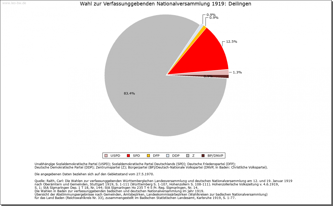 | Geschichte: | 786 Tulingas, von Personenname. Die frühe Gründung des Ortes wird durch Reihengräberfunde bestätigt. Bei den frühesten Nennungen Schenkungen an das Kloster St. Gallen. Später scheint der Ort zur Herrschaft Hohenberg gehört zu haben, obwohl Besitz der Grafen von Hohenberg nur 1348, 1371, 1384 und 1387 am Ort nachzuweisen ist. Neben Rottweiler Patrizierfamilien waren Adelige begütert, doch kamen ihre Besitzungen im Laufe der Zeit an das seit 1324 im Ort als Grundherr erscheinende Kloster Rottenmünster. Seit dem Übergang der Grafscht Hohenberg an Osterreich (1381) gehörte Deilingen zu Oberhohenberg. Alle Rechte im Ort standen bis zum Übergang an Württemberg 1805 Österreich zu. Deilingen gehörte von 1806-1938 zum Oberamt Spaichingen und ab 1938 zum Landkreis Tuttlingen. |