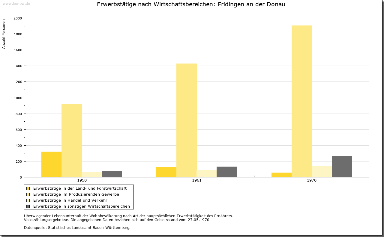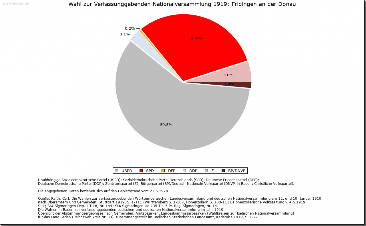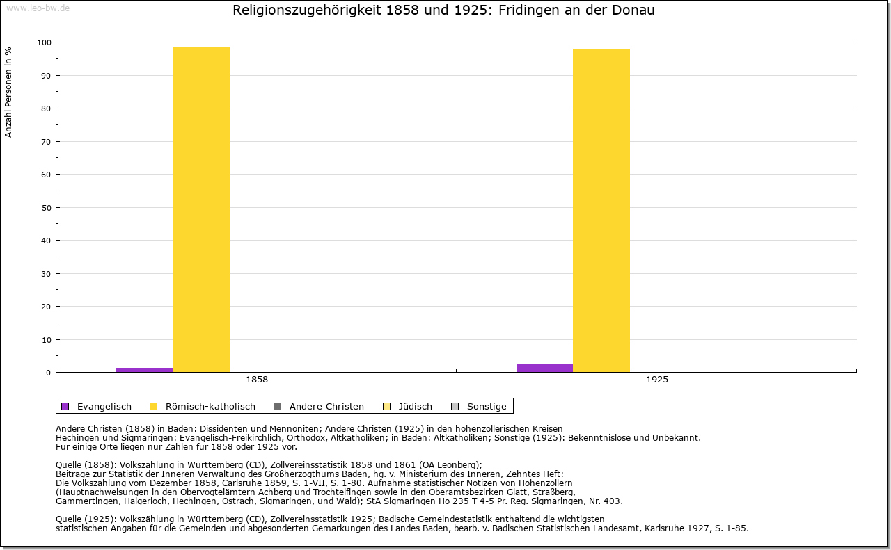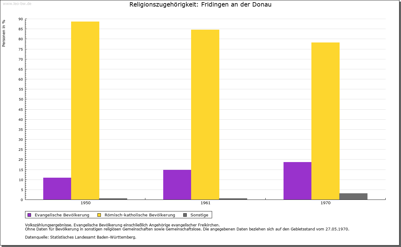 | Kirche und Schule: | Die Kirche am Ort bestand bereits 850. Ein Pleban und ein Vikar 1275 erwähnt. Die St. Martin geweihte Stadtpfarrkirche wurde 1851-1853 neu gebaut, 1953 renoviert. Die Evangelischen waren im 19. Jahrhundert nach Neuhausen ob Eck eingepfarrt, heute nach Mühlheim. Die Katholiken der Ortsteile Bronnen mit Schloßhof und Jägerhaus gehören zur Pfarrei Beuron (Landkreis und Verwaltungsraum Sigmaringen). St. Anna-Kapelle auf dem rechten Donauufer an der Straße nach Mühlheim mit gotischen Bauelementen, wahrscheinlich um die Mitte des 18. Jahrhundert umgebaut. Noch um 1500 waren Bärenthal und Kolbingen Filialgemeinden von Fridlingen. |