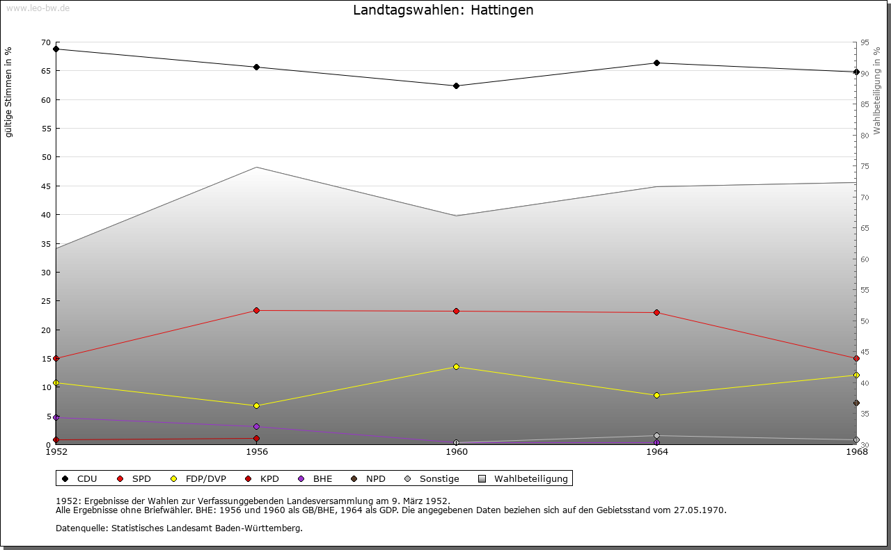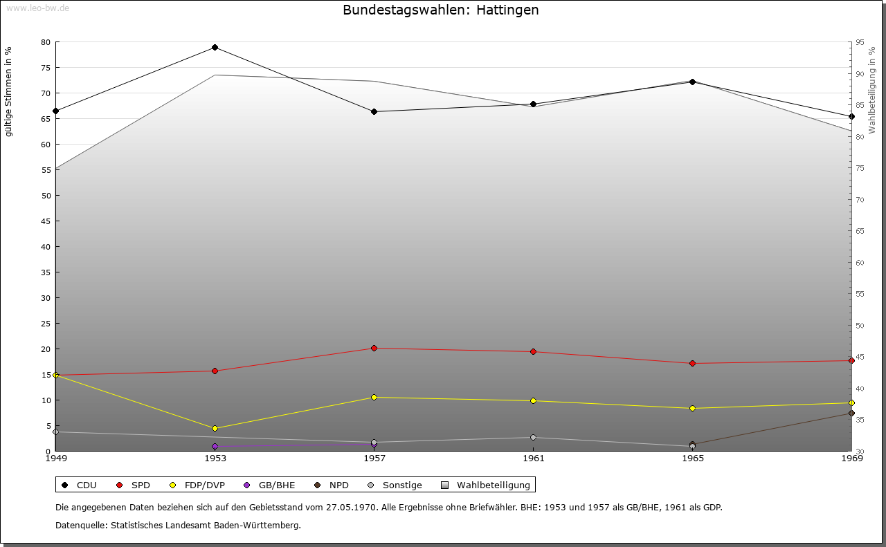 | Geschichte: | Ende des 10. Jahrhunderts (Корialüberlieferung 16. Jahrhundert). Hattingen, von Personenname. Der Name und Plattengräber nahe beim Ort weisen Hattingen der ältesten Siedlungsschicht zu. Bei der Erstnennung schenkte Herzog Berthold den Ort an Reichenau. 1277 Errichtung des reichenauischen Vogtsamts Möhringen-Hattingen. Die Vögte von Hattingen, 1263 bis 1491 bezeugt, gleichen Geschlechts wie die von Möhringen, waren reichenauische Ministerialen. Als Zubehör der Herrschaft Hewen wie Emmingen ab Egg 1398 an Österreich, 1405 an die von Lupfen und über die von Pappenheim 1639 an Fürstenberg. 1806 Baden, 1807 Amt Engen, 1936 Bezirksamt/Landkreis Donaueschingen, 1973 Landkreis Tuttlingen. |