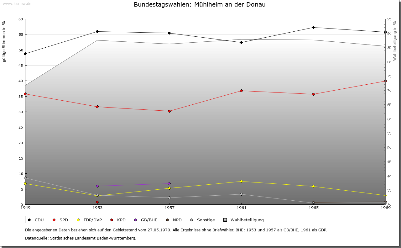| Geschichte: | 843 Muleheim, wohl von den Mühlen im Wulfbachtal. Reihengräber belegen frühe Besiedlung beim Wohnplatz Altstadt, Benennung nach den Mühlen kaum vor dem 7./8. Jahrhundert möglich, vielleicht nachträglich umbenannt. Reichenau soll 790 Schenkungen am Ort erhalten haben, Besitz des Klosters wird 843 erwähnt. Schenkungen an Kloster Petershausen zwischen 980 und 996, an Kloster Salem 1218. Als Reichenauer Lehen scheint der Ort früh an die Grafen von Zollern gelangt zu sein. Diese gründeten in der ersten Hälfte des 13. Jahrhundert auf der rechten Seite der Donau südlich an das bereits vorhandene Schloß anschließend als Hauptort der gleichnamigen Herrschaft die 1241 als burgum erstmals erwähnte Stadt, für die 1266 ein Schultheiß genannt wurde. Die einst mit Mauern umgebene Stadtanlage erstreckt sich etwa in Nord-Süd-Richtung auf einem Bergausläufer über dem Tal mit in gleicher Richtung laufender Hauptstraße und zwei Parallelstraßen, die von schmalen Quergäßchen durchschnitten werden. Zwei Tore schützten den nördlichen und südlichen Zugang zur Stadt. Das Rathaus anscheinend bald nach 1409 erbaut und 1762 erneuert. Stadt und Herrschaft wurden 1303 an das Btm Konstanz verpfändet, von Graf Friedrich von Zollern 1391 an Konrad von Weitingen verkauft und von dessen Neffen 1409 an die Herren von Enzberg veräußert. Die Herrschaft umfaßte Mühlheim, Irndorf, Nendingen, Stetten, Bronnen, Kraftstein, Böttingen, Königsheim, Mahlstetten, Allenspach, Worndorf, Aggenhausen und Buchheim. Sie steuerte zum Ritterkanton Hegau, Osterreich forderte aber für Hohenberg in den meisten Orten der Herrschaft die Landeshoheit und die hohe Jurisdiktion. Ein 1544 zwischen Österreich und den Herren von Enzberg geschlossener Vertrag beließ den letzteren u.a. die hohe Obrigkeit über Mühlheim und Zubehör auf dem rechten Donauufer, ferner die hohe Obrigkeit über Altmühlheim, das Dorf Stetten und über die dazugehörigen Mühlen. An der Stelle der alten Burg wurde 1751-1753 in der Nordwestecke der Stadt nach Plänen Bagnatos das stattliche Schloß der Freiherren von Enzberg errichtet. Während des 30jährigen Krieges hatte die Stadt soviel zu leiden, daß sie 1633 nur noch 10 Einwohner hatte. Ein größerer Stadtbrand richtete 1890 Schaden an. Mit der Mediatisierung 1805/06 fiel die Herrschaft an Württemberg, die Mühlheim dem Oberamt Tuttlingen zuteilte. Seit 1938 gehört die Stadt zum Landkreis Tuttlingen. |