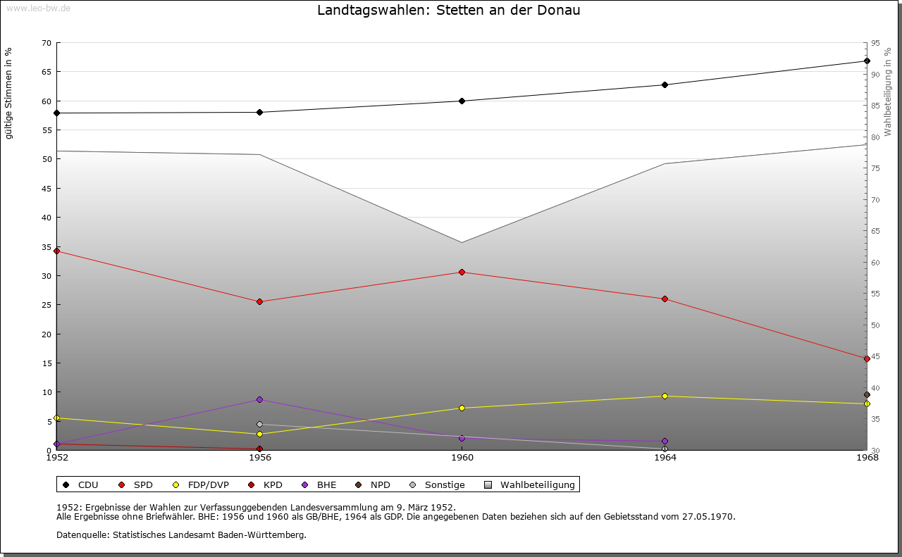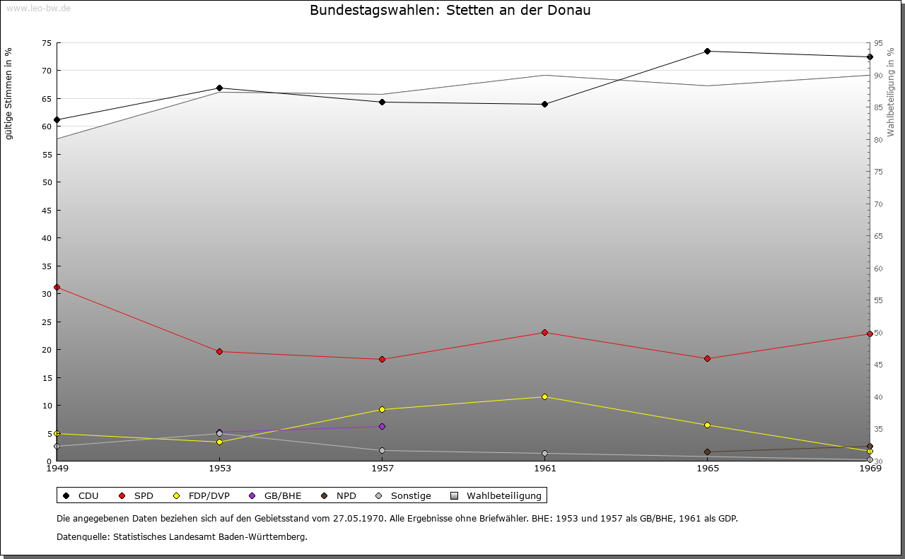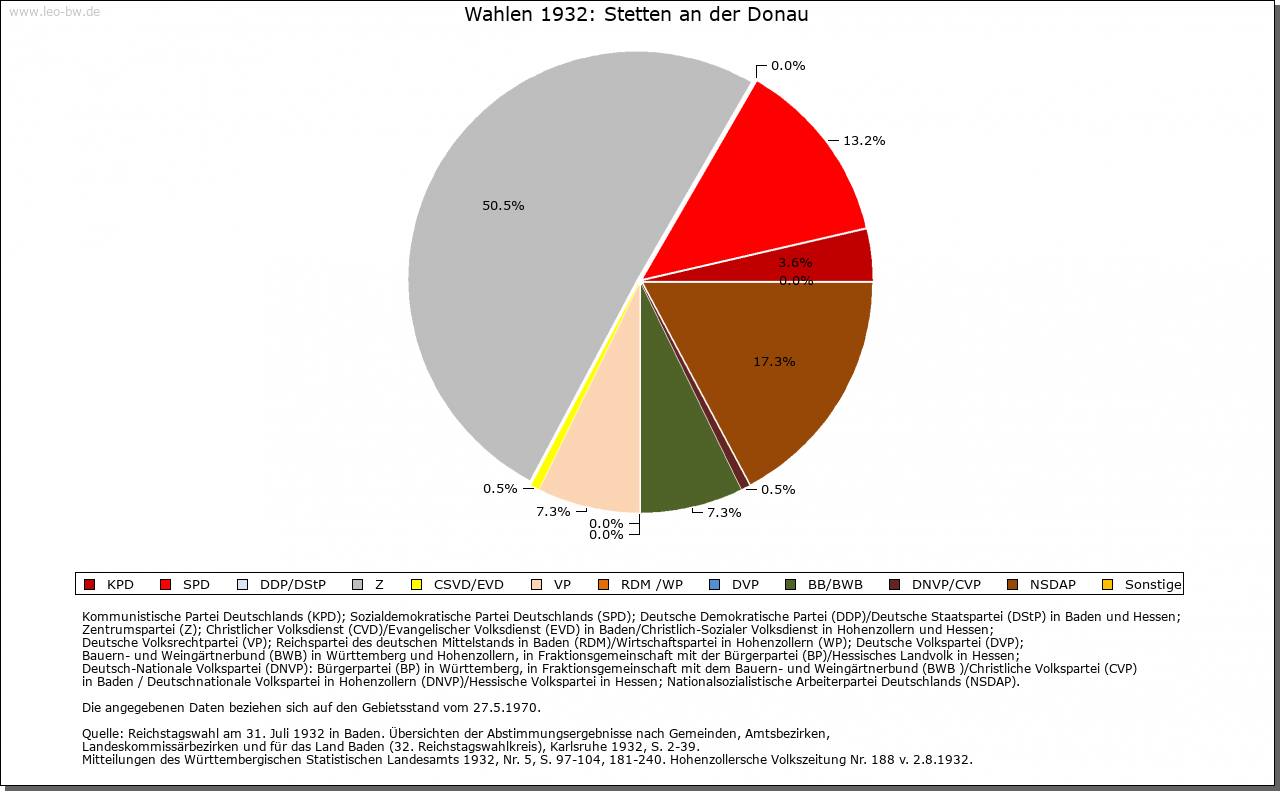 | Geschichte: | Ende des 10. Jahrhunderts Stetin, 1409 Stetten by Mülheim. Reihengräber in unmittelbarer Umgebung. Kloster Petershausen erhielt zwischen 980 und 996 in St. von seinem Gründer, Bischof Gebhard II., Besitz. Auch Kloster Allerheiligen bei Schaffhausen war am Ort begütert, und die Grafen von Fürstenberg hatten hier 1409 ein Lehengut. St. gehörte zur Herrschaft Mühlheim und teilte deren Schicksal. Seit 1409 besaßen die Herren von Enzberg den Ort als Allod, in dem ihnen alle Rechte zustanden. Infolge des Konkurses der Familie kam der Ort 1653 an das Kloster Zwiefalten und gelangte erst 1775 wieder zurück. Durch sie gehörte Stetten zum Ritterkanton Hegau, fiel aber bereits 1805/1806 an Württemberg und gehörte 1806-1938 zum Oberamt, seit 1938 Landkreis Tuttlingen. |