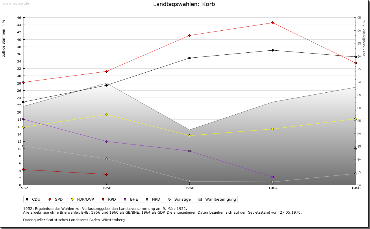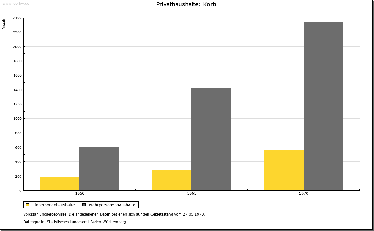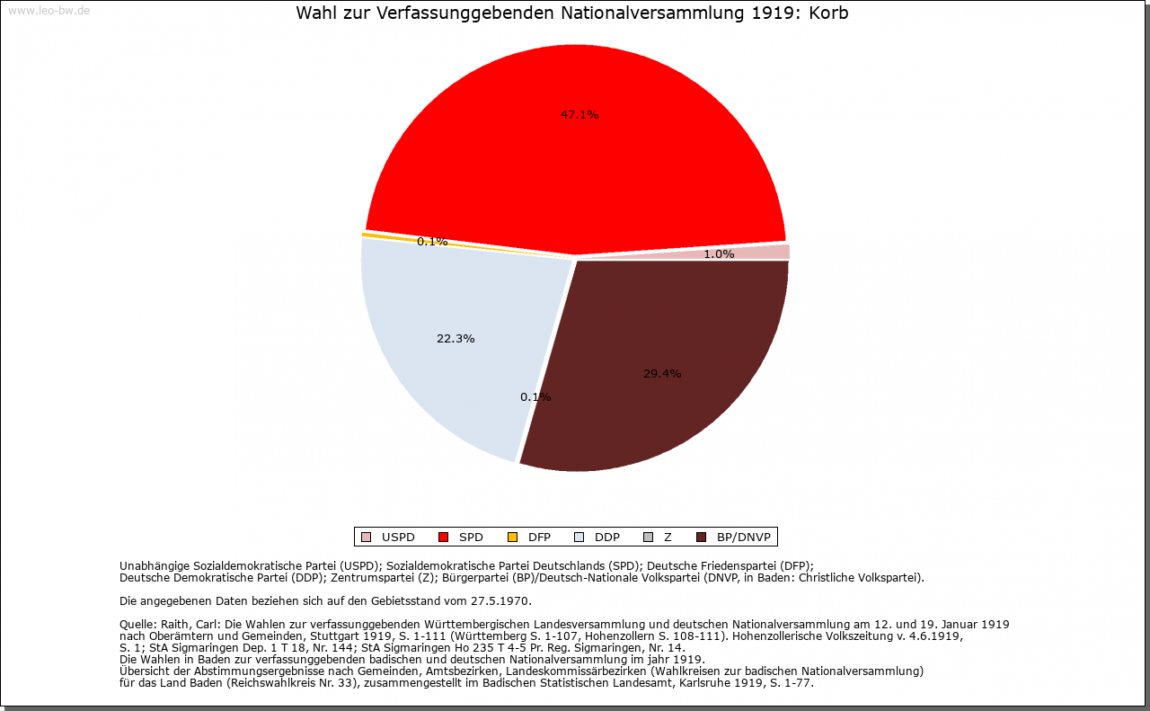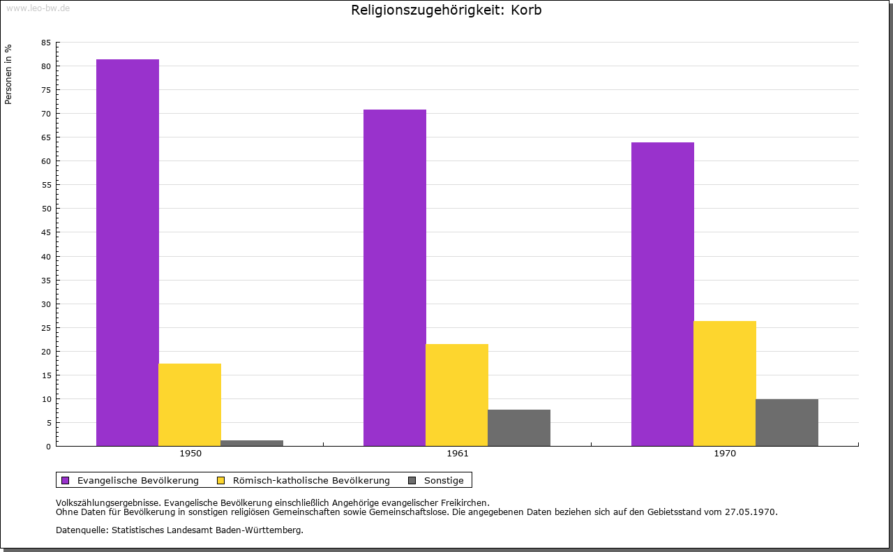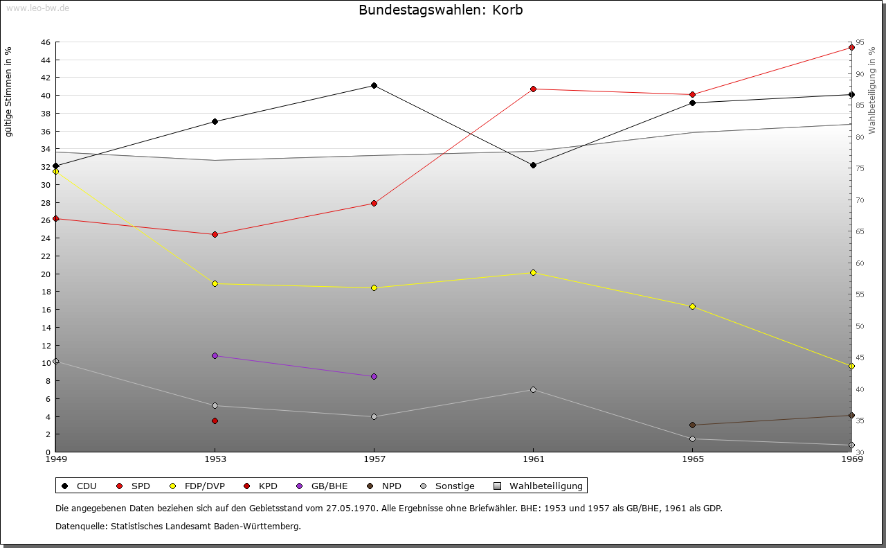 | Geschichte: | 1270 Korbe (von gehorwe = schwerer Boden?), örtlicher Adel ist nicht nachzuweisen, doch scheint das heutige Rathaus nach Bauart und Bauzeit – ein Mauerstück heißt heute noch »Burg« – ein Adelssitz gewesen zu sein, der wohl den von Hochdorf (am Neckar) gehörte; 1336 Albrecht der Korber von Hochdorf. Württemberg hatte 1350 nur über einen Teil des Orts die Gerichtsherrschaft und noch 1389 gehörte der halbe Ort dem Esslinger Bürger Konrad Raiser. Korb zählte zum Amt, später Oberamt, seit 1938 Landkreis Waiblingen. Personen: Jakob Friedrich Weißhaar, 1775-1834, Präsident der 2. württembergischen Kammer 1819-1831. |