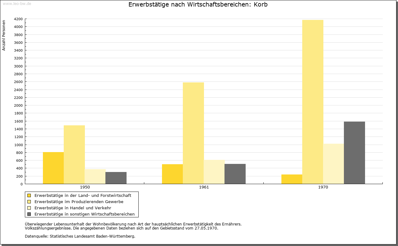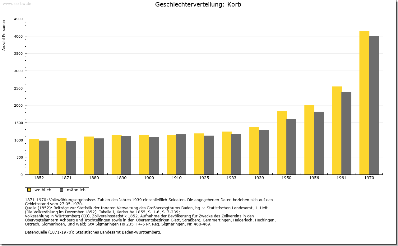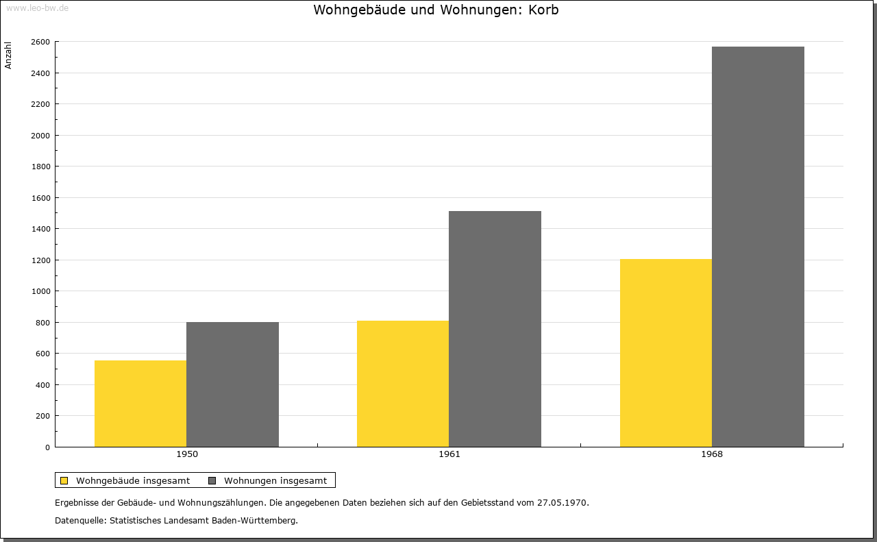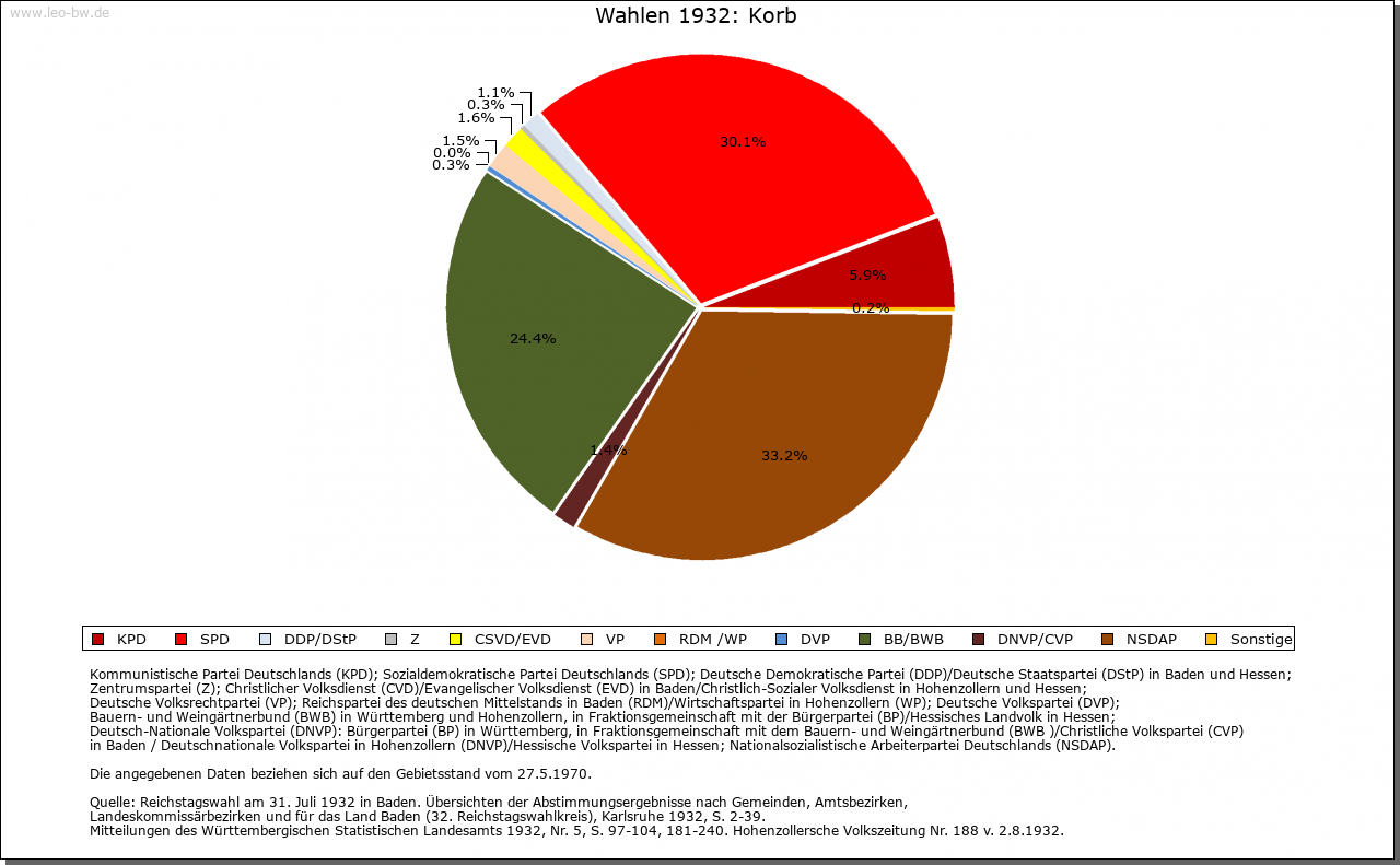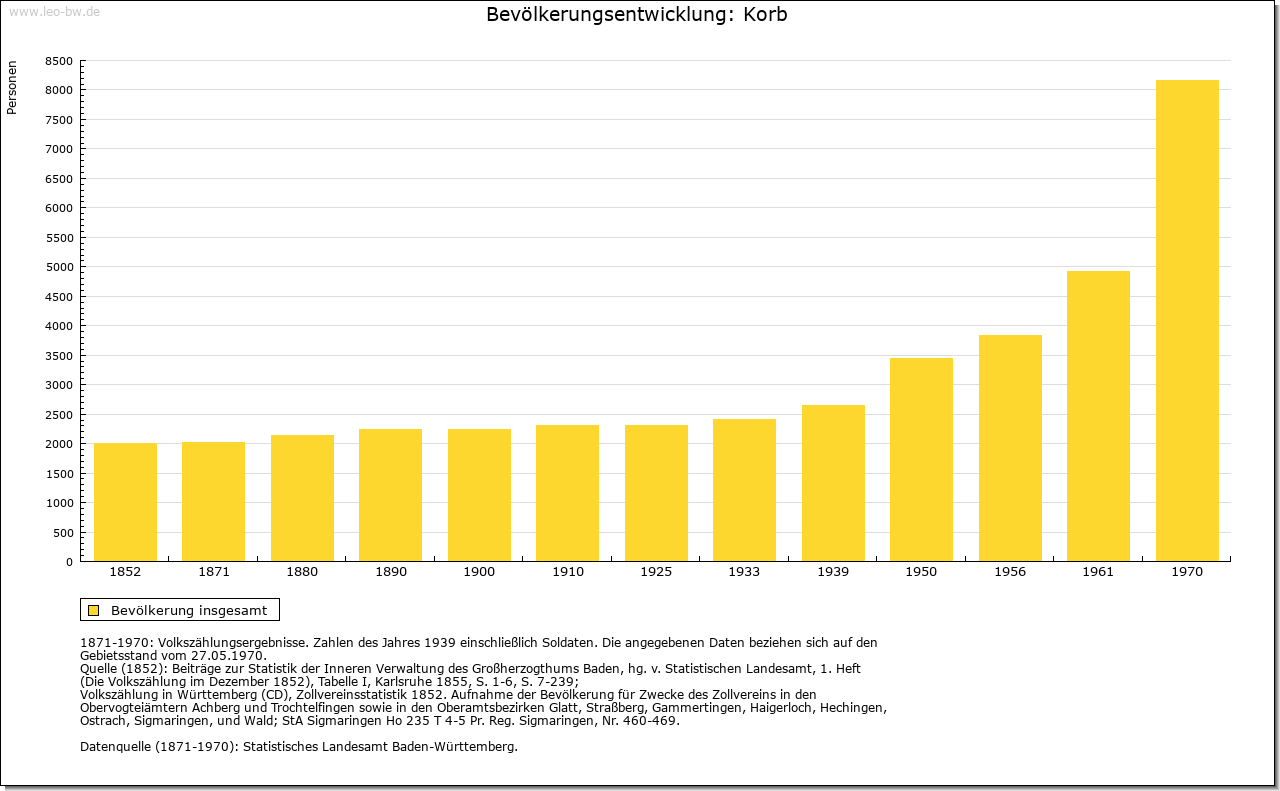 | Geschichte: | 1270 Korbe (von gehorwe = schwerer Boden?), örtlicher Adel ist nicht nachzuweisen, doch scheint das heutige Rathaus nach Bauart und Bauzeit – ein Mauerstück heißt heute noch »Burg« – ein Adelssitz gewesen zu sein, der wohl den von Hochdorf (am Neckar) gehörte; 1336 Albrecht der Korber von Hochdorf. Württemberg hatte 1350 nur über einen Teil des Orts die Gerichtsherrschaft und noch 1389 gehörte der halbe Ort dem Esslinger Bürger Konrad Raiser. Korb zählte zum Amt, später Oberamt, seit 1938 Landkreis Waiblingen. Personen: Jakob Friedrich Weißhaar, 1775-1834, Präsident der 2. württembergischen Kammer 1819-1831. |