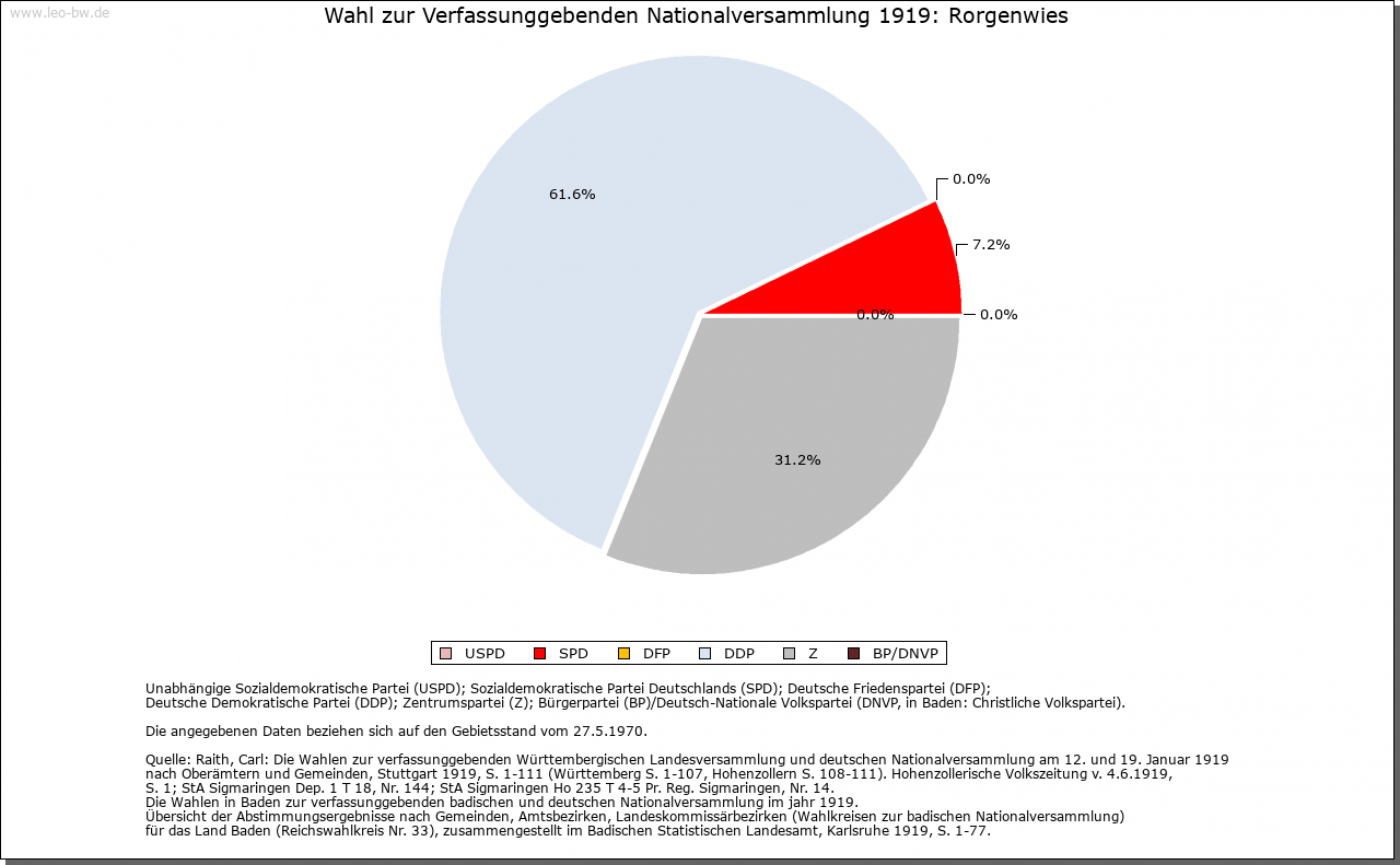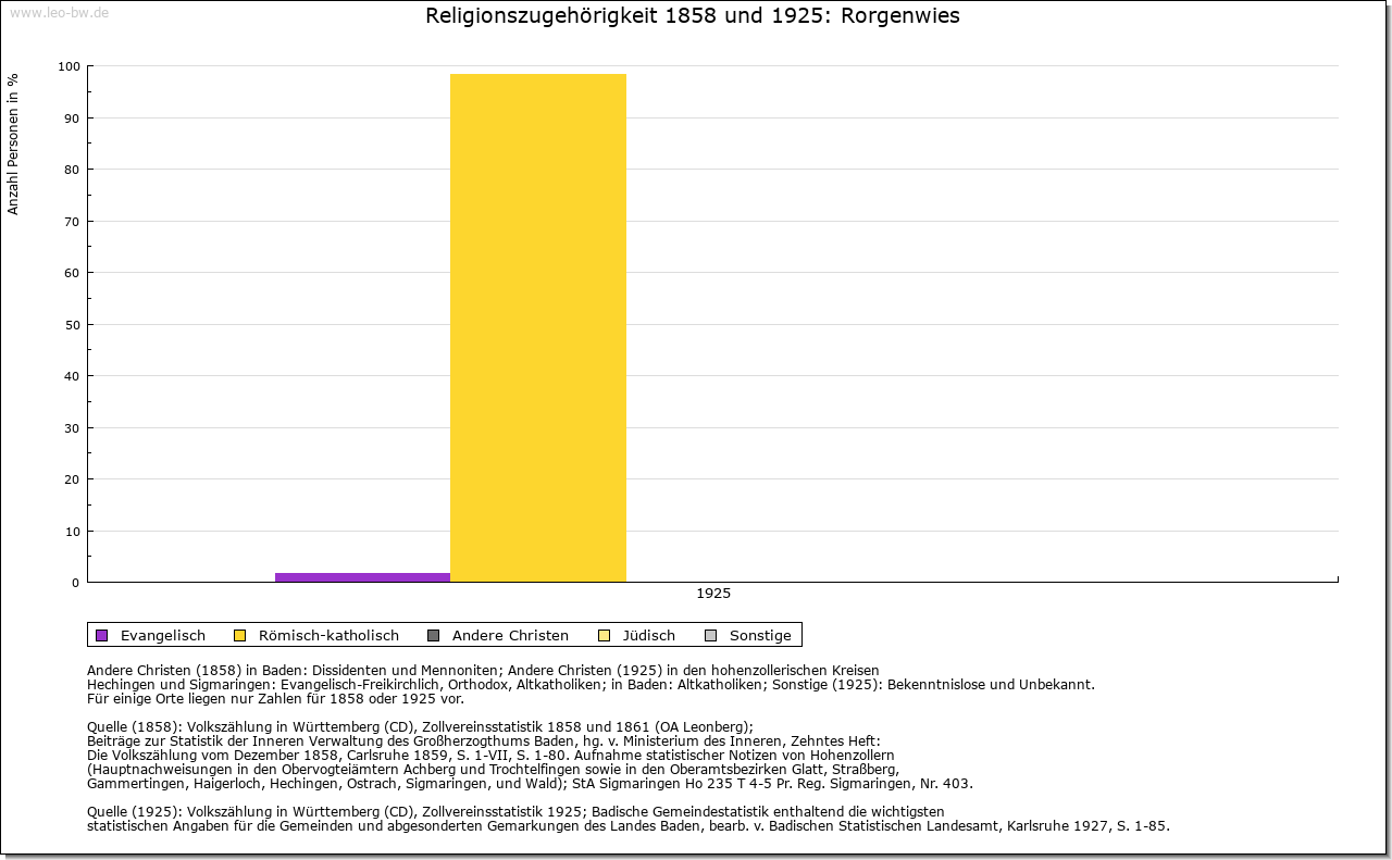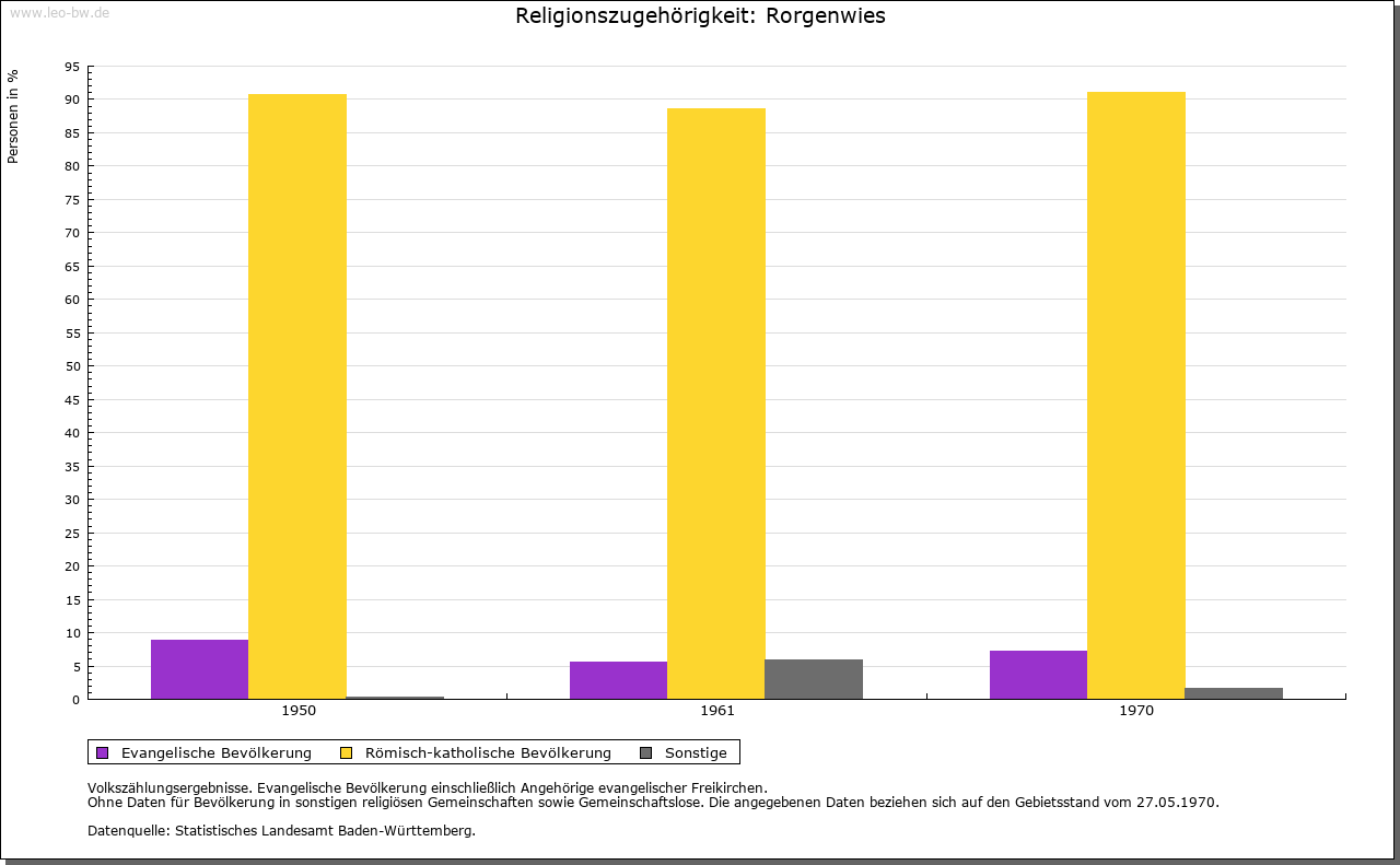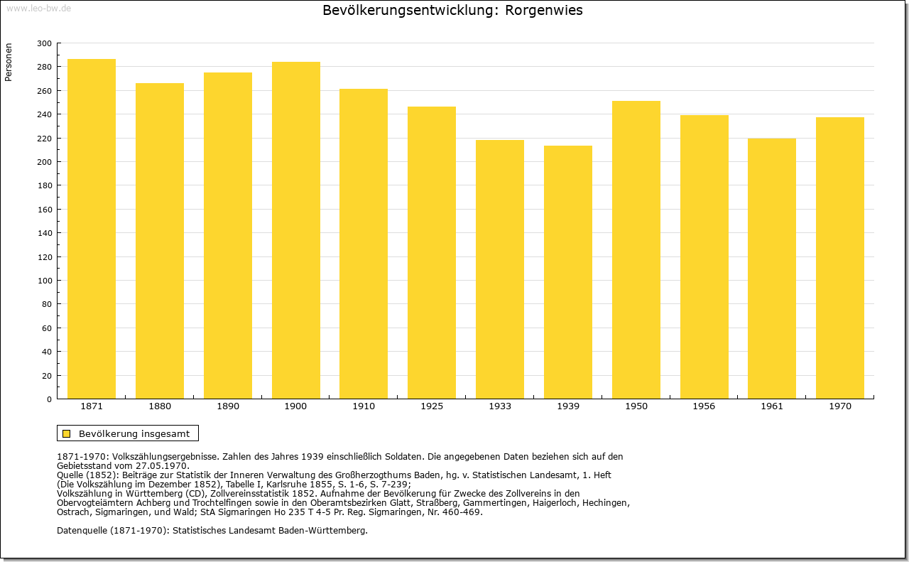 | Geschichte: | Um 1150 (Корialüberlieferung 12. Jahrhundert) Rorigenwise, 1179 Rorgunwise, wohl Wiese mit Röhricht. Früher Besitz des Klosters Allerheiligen in Schaffhausen. Sämtliche Rechte bei der Landgrafschaft Nellenburg, Niedergericht seit 1749 Familie Gagg von Löwenberg. Rorgenwies kam 1806 an Württemberg, 1810 an Baden und gehörte 1810-1972 zum Amt/Landkreis Stockach. Rorgenwies gehörte bis 1862 zu Heudorf im Hegau. |