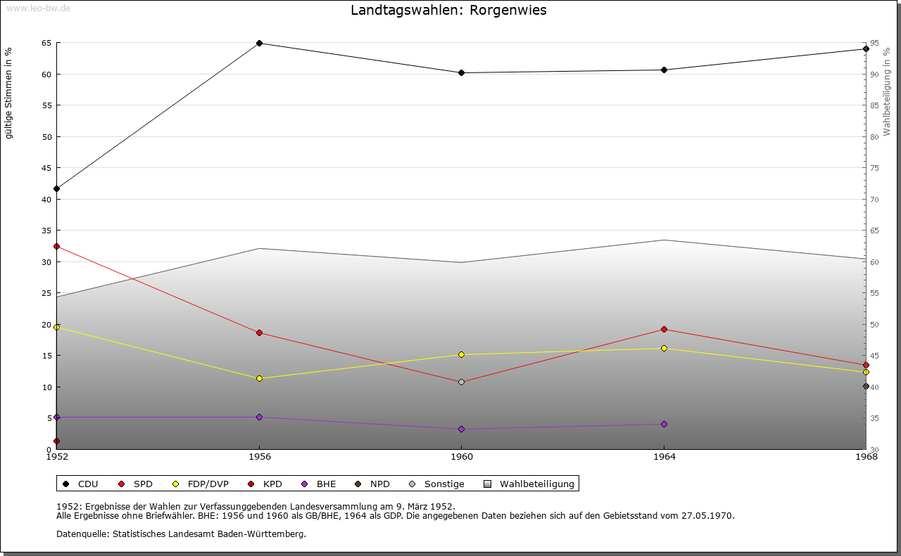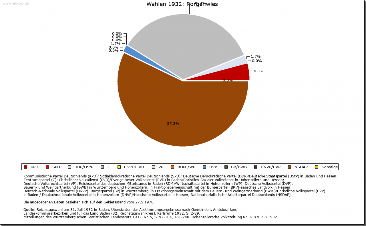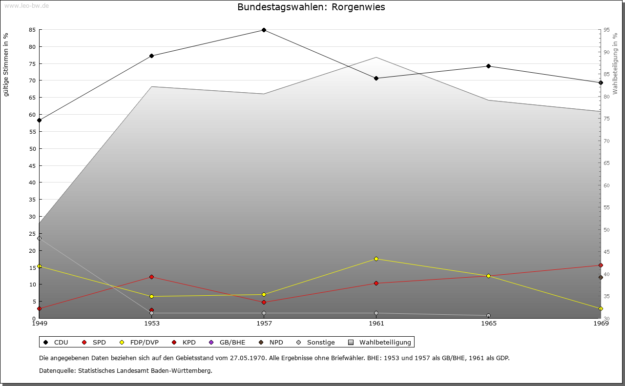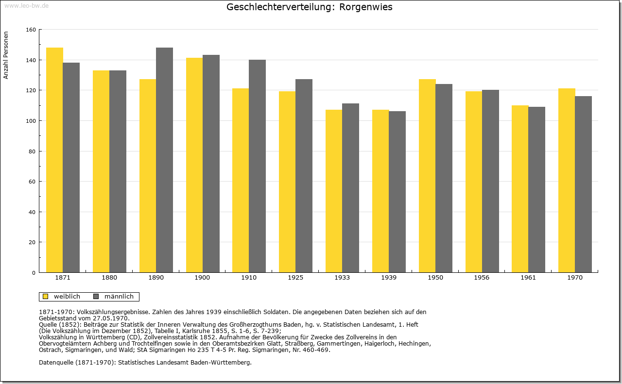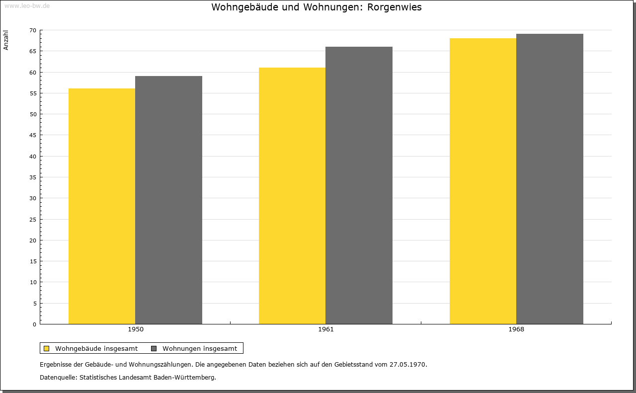 | Geschichte: | Um 1150 (Корialüberlieferung 12. Jahrhundert) Rorigenwise, 1179 Rorgunwise, wohl Wiese mit Röhricht. Früher Besitz des Klosters Allerheiligen in Schaffhausen. Sämtliche Rechte bei der Landgrafschaft Nellenburg, Niedergericht seit 1749 Familie Gagg von Löwenberg. Rorgenwies kam 1806 an Württemberg, 1810 an Baden und gehörte 1810-1972 zum Amt/Landkreis Stockach. Rorgenwies gehörte bis 1862 zu Heudorf im Hegau. |