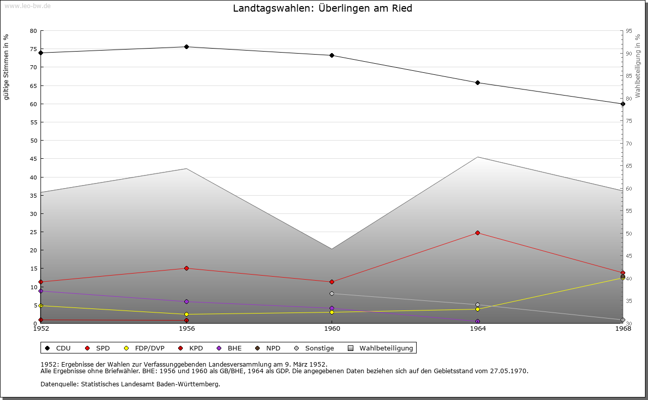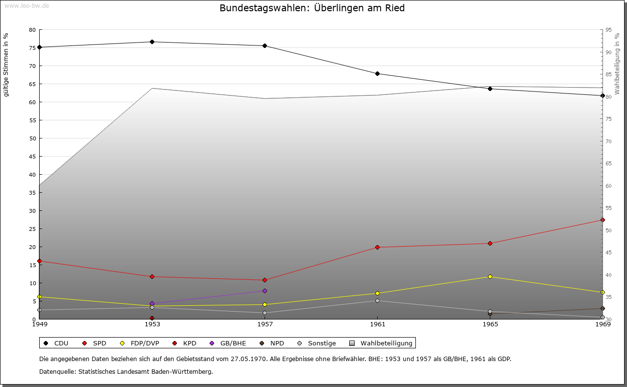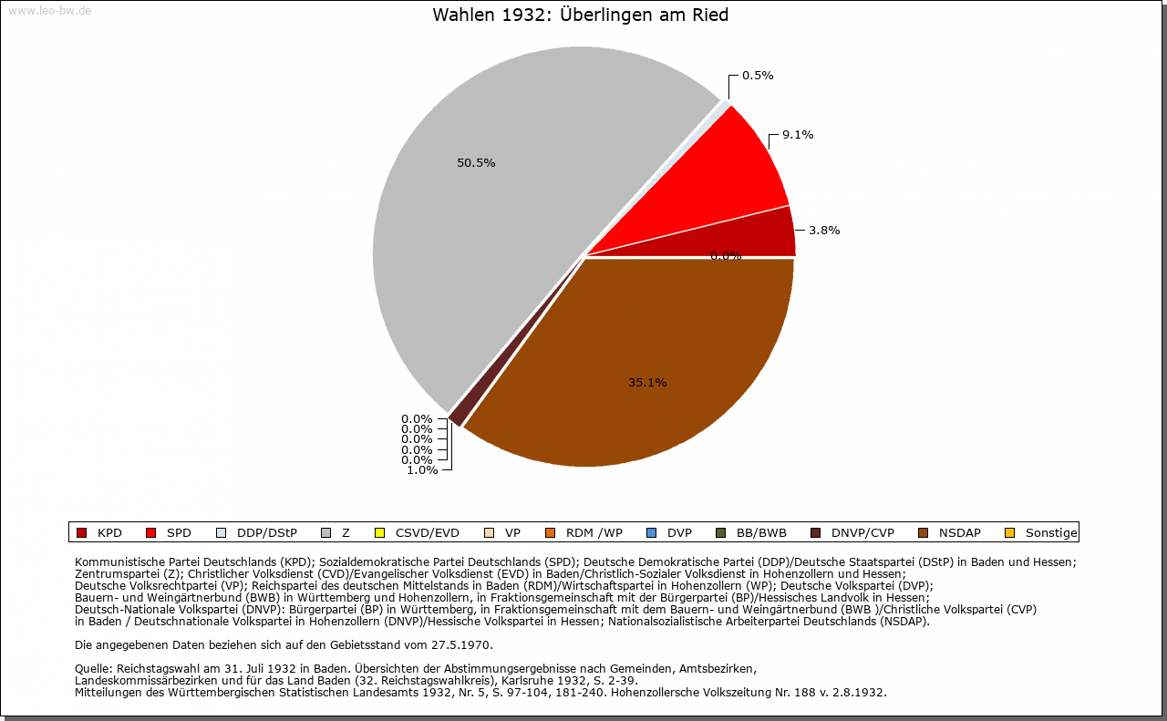 | Geschichte: | 1256 Überlingen, Anfang des 14. Jahrhunderts Überlingen im Ryete. Vermutlich merowingerzeitliche Siedlung, da entsprechende Grabfunde vorhegen. Früher Besitz des Klosters Reichenau, gehörte an dessen Ammannamt der Stadt Radolfzell und um 1300 mit der Stadt zum habsburgischen Amt Aach. Kam mit dem Ammannamt 1538 an die Stadt Radolfzell, die das dortige Niedergericht bereits seit dem 14. Jahrhundert pfandweise innegehabt hatte. Seither unter österreichischer Landesherrschaft, Blutbann bei der Landgrafschaft Nellenburg. Anfall an Württemberg 1805, 1810 an Baden, unterstand 1810-1872 dem Bezirksamt Radolfzell und kam dann zum Bezirksamt/Landkreis Konstanz. |