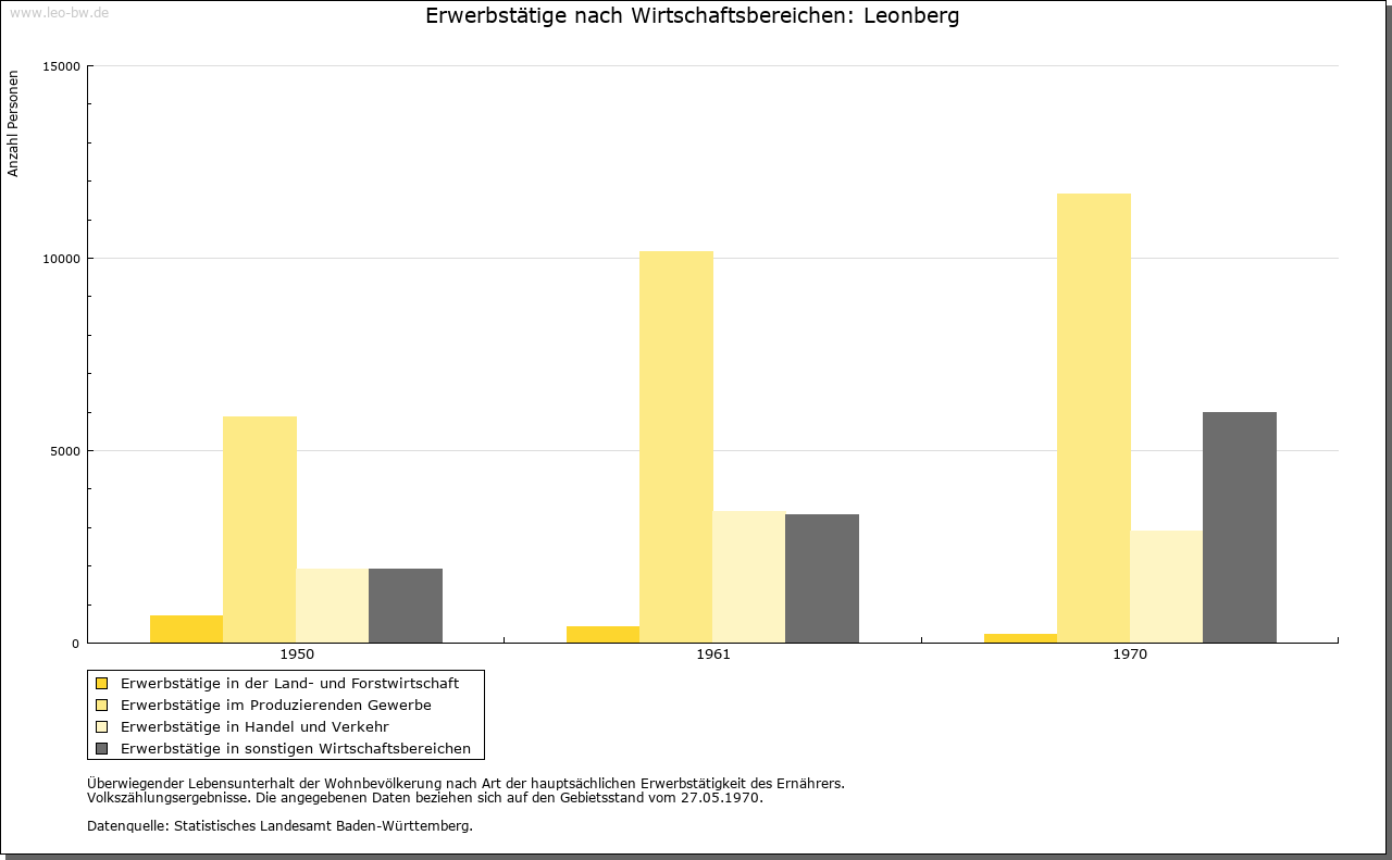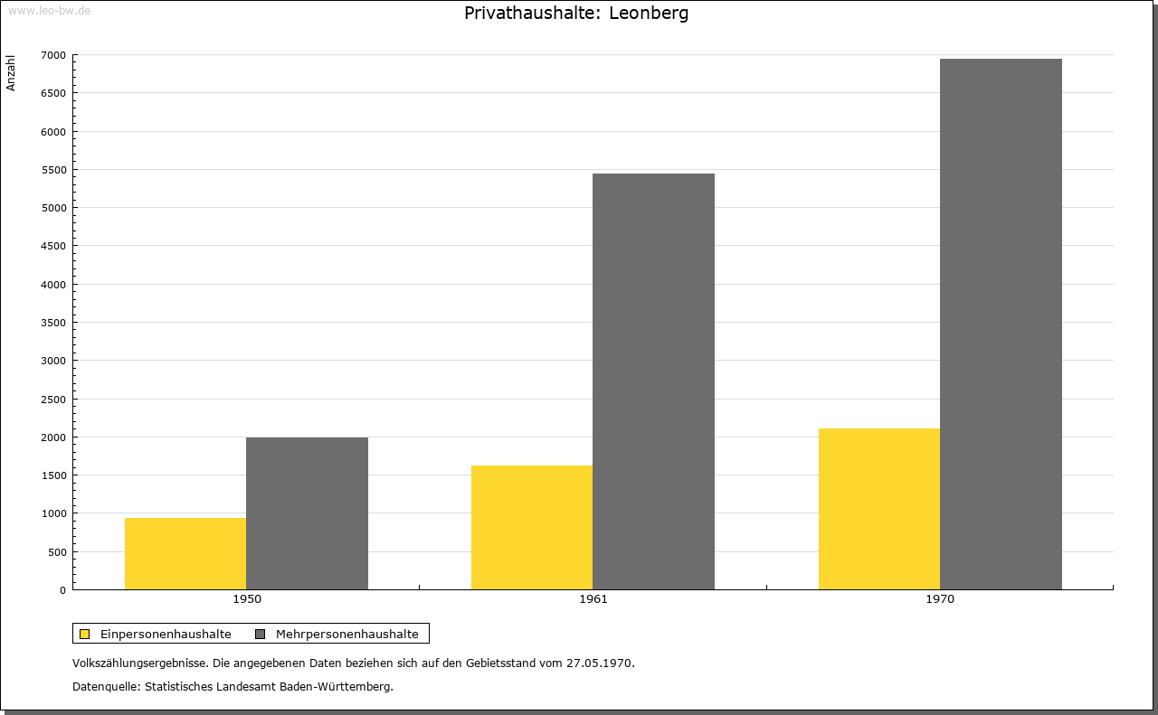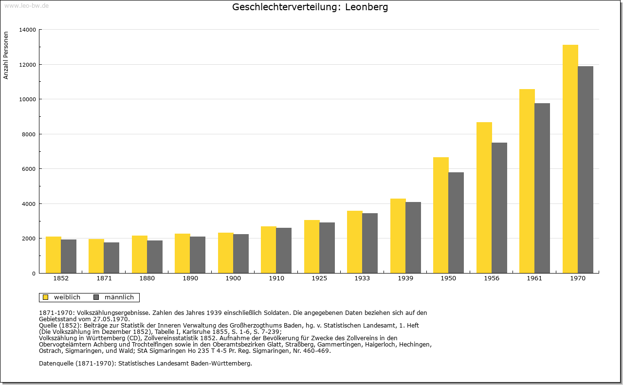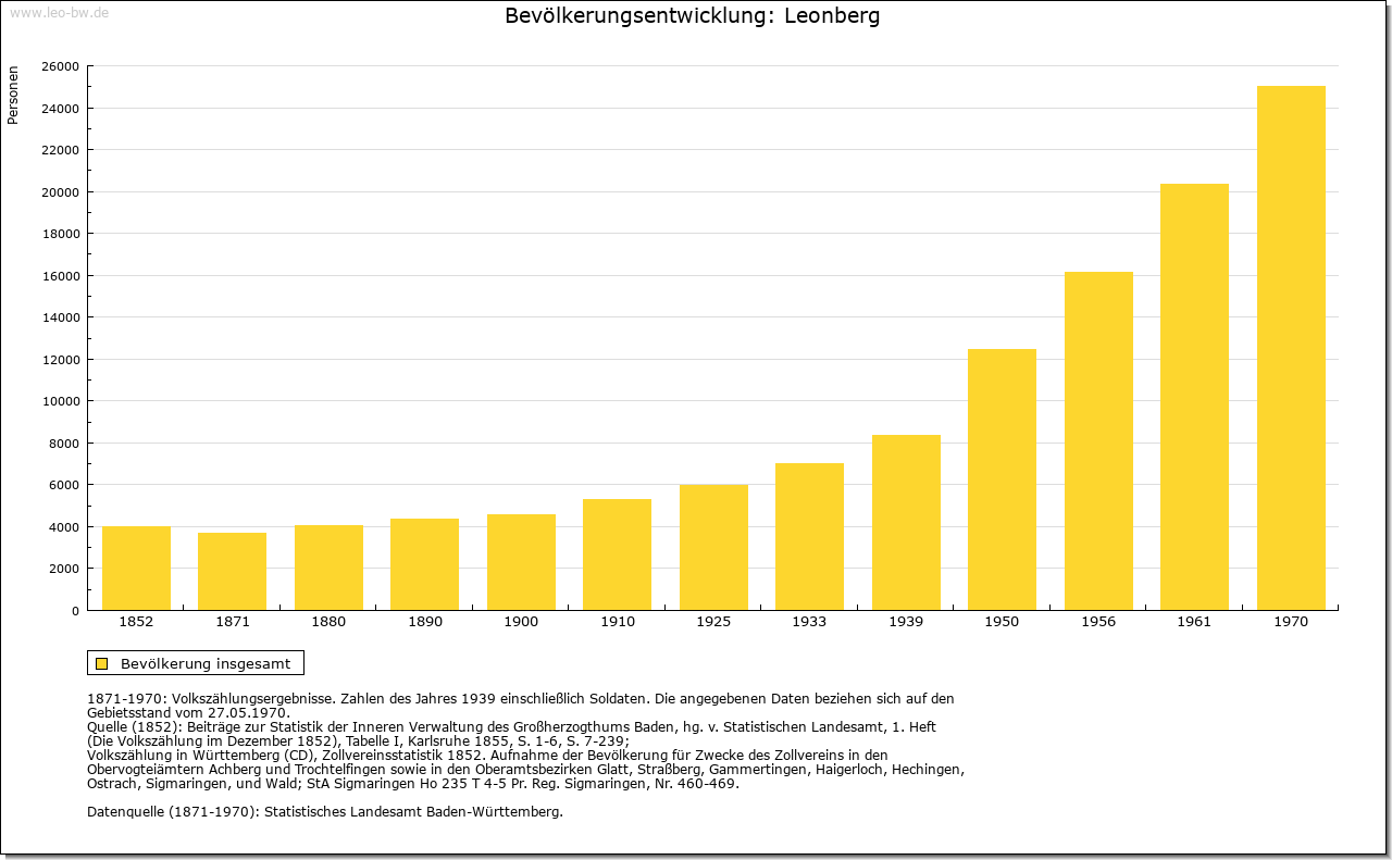 | Ortslage und Siedlung (bis 1970): | Die Altstadt liegt über dem rechten Hang des hier bereits im Hauptmuschelkalk verlaufenden Glemstals in Spornlage. Den nach drei Seiten steil abfallenden Engelberg, ursprünglich Endelberg, einen westlichen Ausläufer der Glemswald- Randhöhen, krönt ein Aussichtsturm. Der Umriss der burgartig über dem Glemstal sich erhebenden Altstadt bildet, den Geländeformen angepasst, ein etwas verschobenes Rechteck. Das Straßennetz in Gitterform besteht aus drei parallel laufenden, durch steil ansteigende Querstraßen verbundenen Hauptstraßen und keilförmigem Marktplatz als Erweiterung der Hauptverkehrsstraße zwischen Oberem und Unterem Tor. Beherrscht wird der Marktplatz vom Rathaus, einem monumentalen Fachwerkbau. Älteste Ortserweiterung des 19./20. Jahrhunderts nach Nordosten gegen den Engelberg, nach Südwesten zum Bahnhof und nach Norden (Silberberghalde). Seit 1936 Anlage der Gartenstadt. Nach dem Zweiten Weltkrieg umfangreiche neue Wohnsiedlungen, namentlich im Norden der Gemarkung aus den Jahren 1952/69 (»Leonberger Heide«, Seestraße, »Burghalde«, »Engelberg«, Haldengebiet, »Im Wengen«) und im Osten seit 1976 (Einsteinstraße). Die meisten der Neubaugebiete bestehen aus Ein-, Zweifamilien- und Reihenhäusern. Der neue Stadtteil »Ramtel« entstand östlich der Autobahn an der Gerlinger Gemarkungsgrenze. Das Industriegelände befindet sich hauptsächlich auf der einstigen Gemarkung Eltingen (1949 bzw. 1971) und im Südosten von Leonberg (1961). |