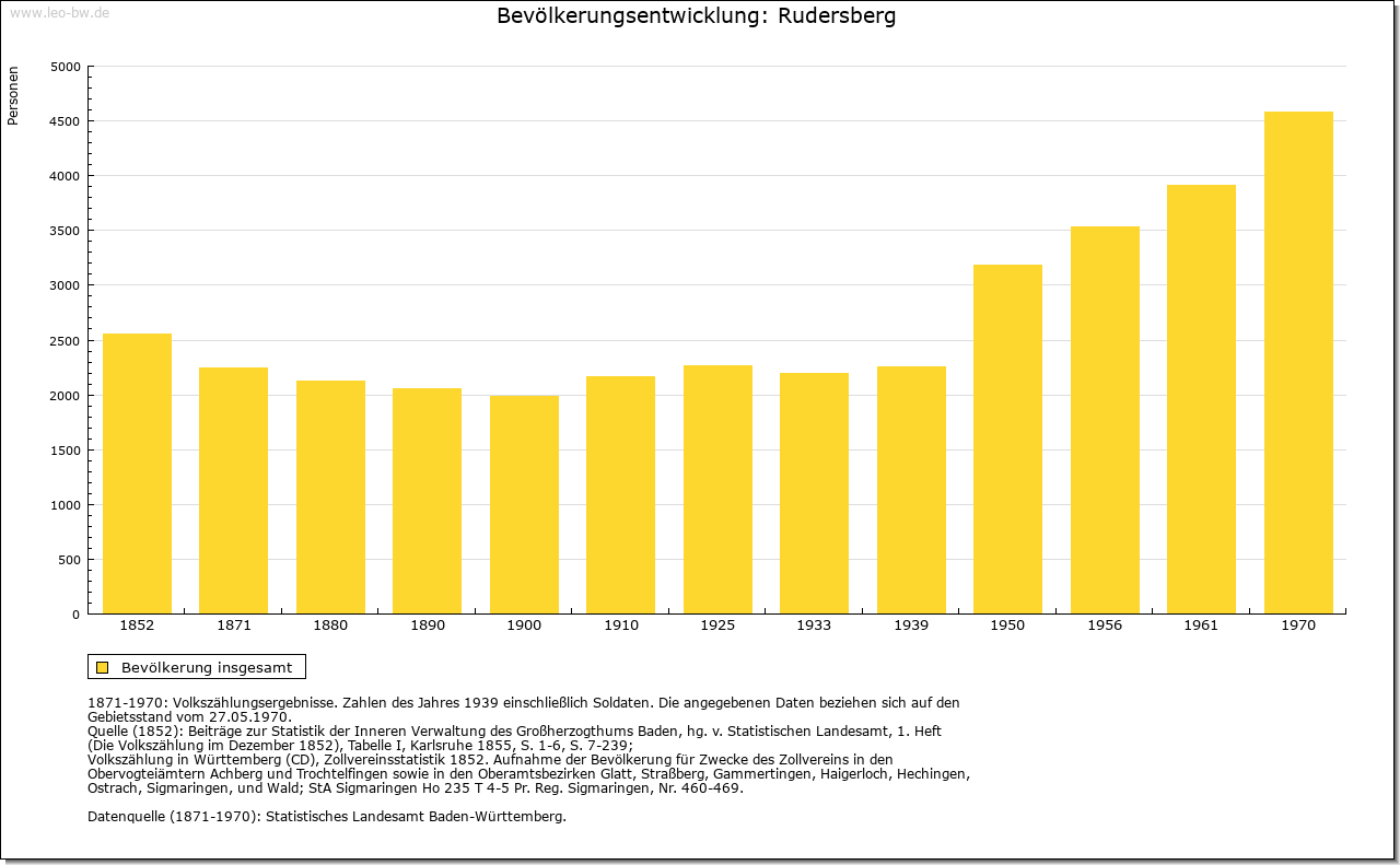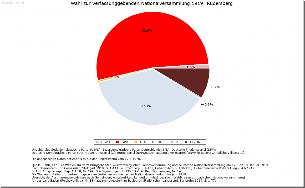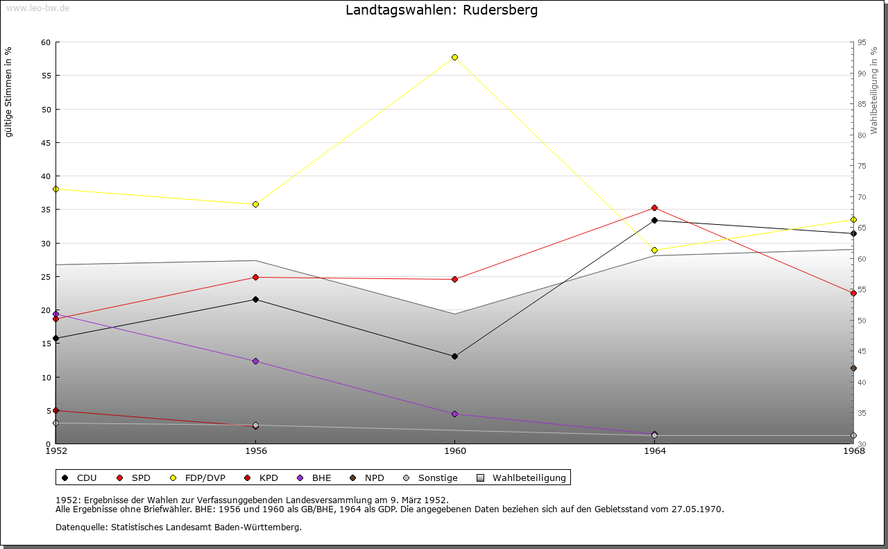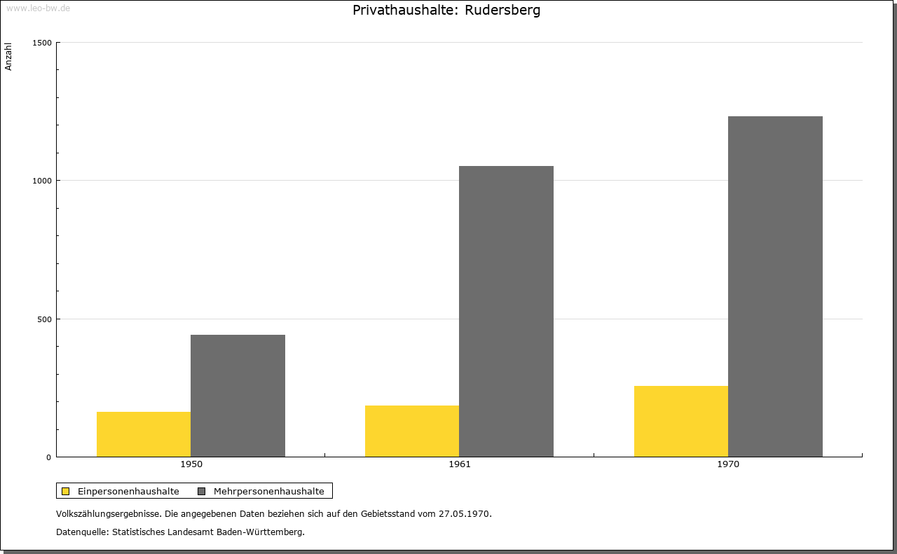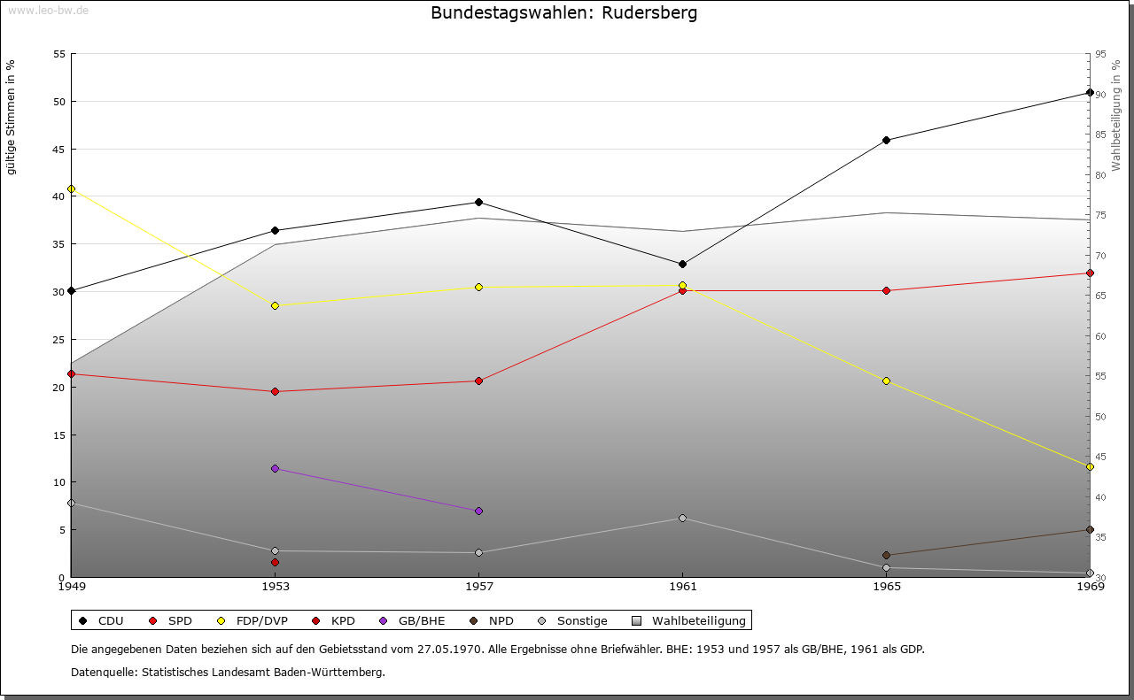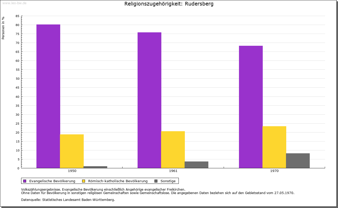 | Geschichte: | 1245 (Kopialüberliferung 15. Jahrhundert) Rudelsperg und Rudolf(e)sperg (Personenname). Wohl in der jüngeren Ausbauzeit von der Backnanger Bucht her besiedelt. Gehörte zur Herrschaft Waldenstein und kam mit ihr Mitte 13. Jahrhundert an Württemberg. Dem Stift Backnang wurde 1245 Besitz in Rudersberg bestätigt. Nach 1450 wurden die Orte der Herrschaft Waldenstein zum Amt Rudersberg zusammengefasst. 1810 wurde das Unteramt Rudersberg des Oberamtes Schorndorf dem Oberamt Lorch zugeteilt, 1819 aufgehoben und dem Oberamt Welzheim einverleibt; 1938 zum Landkreis Waiblingen. |