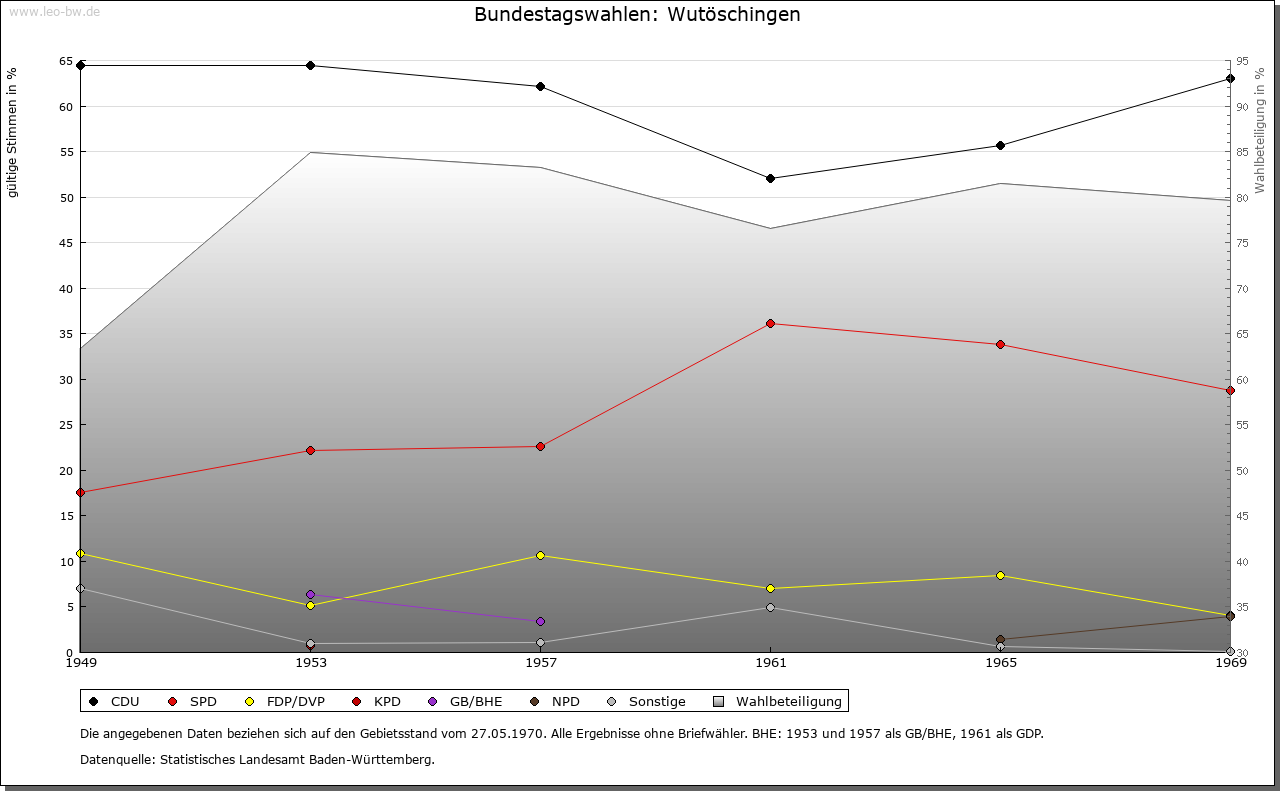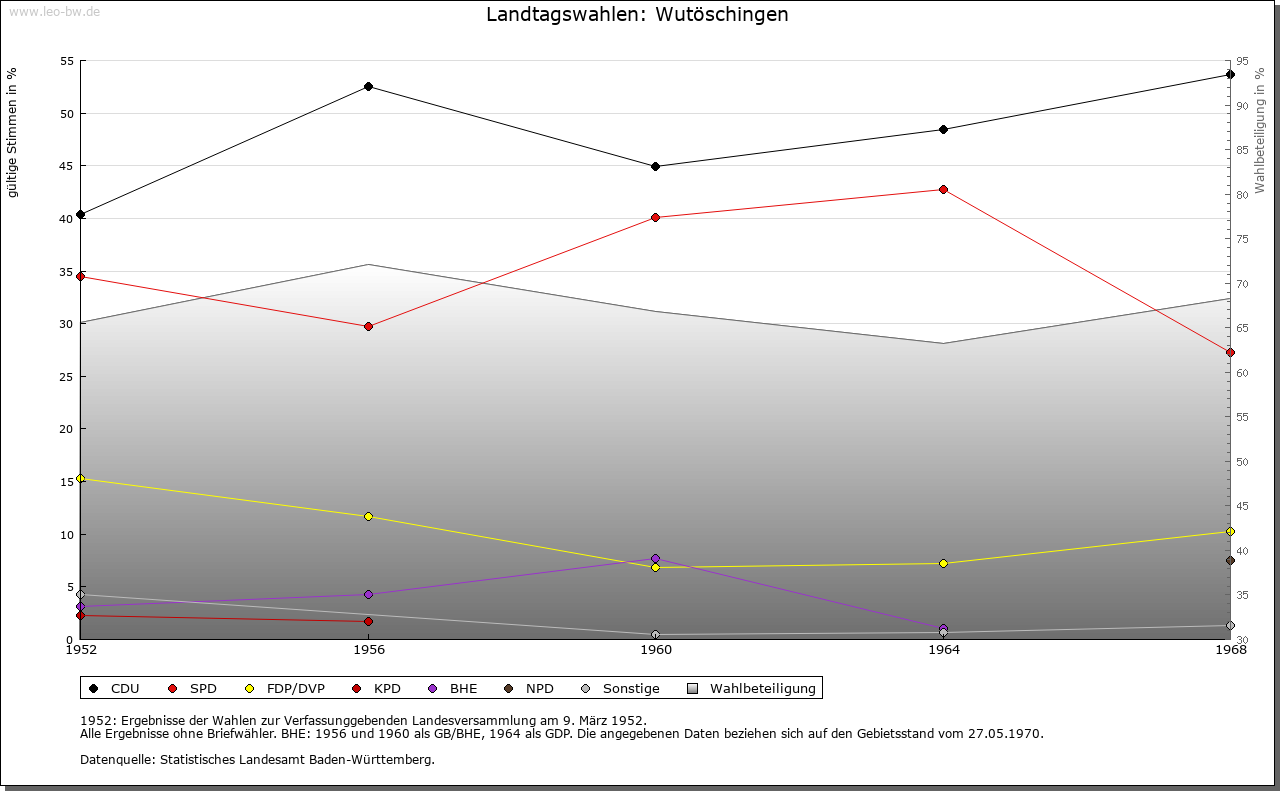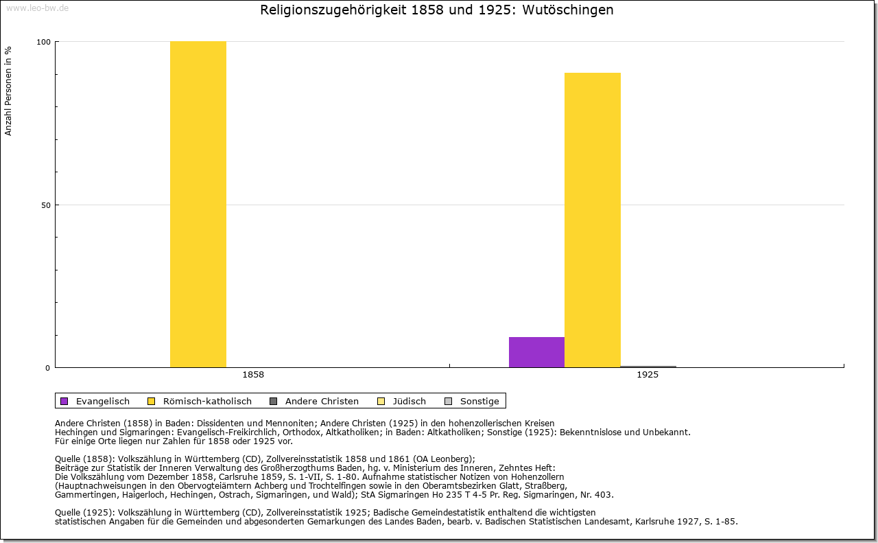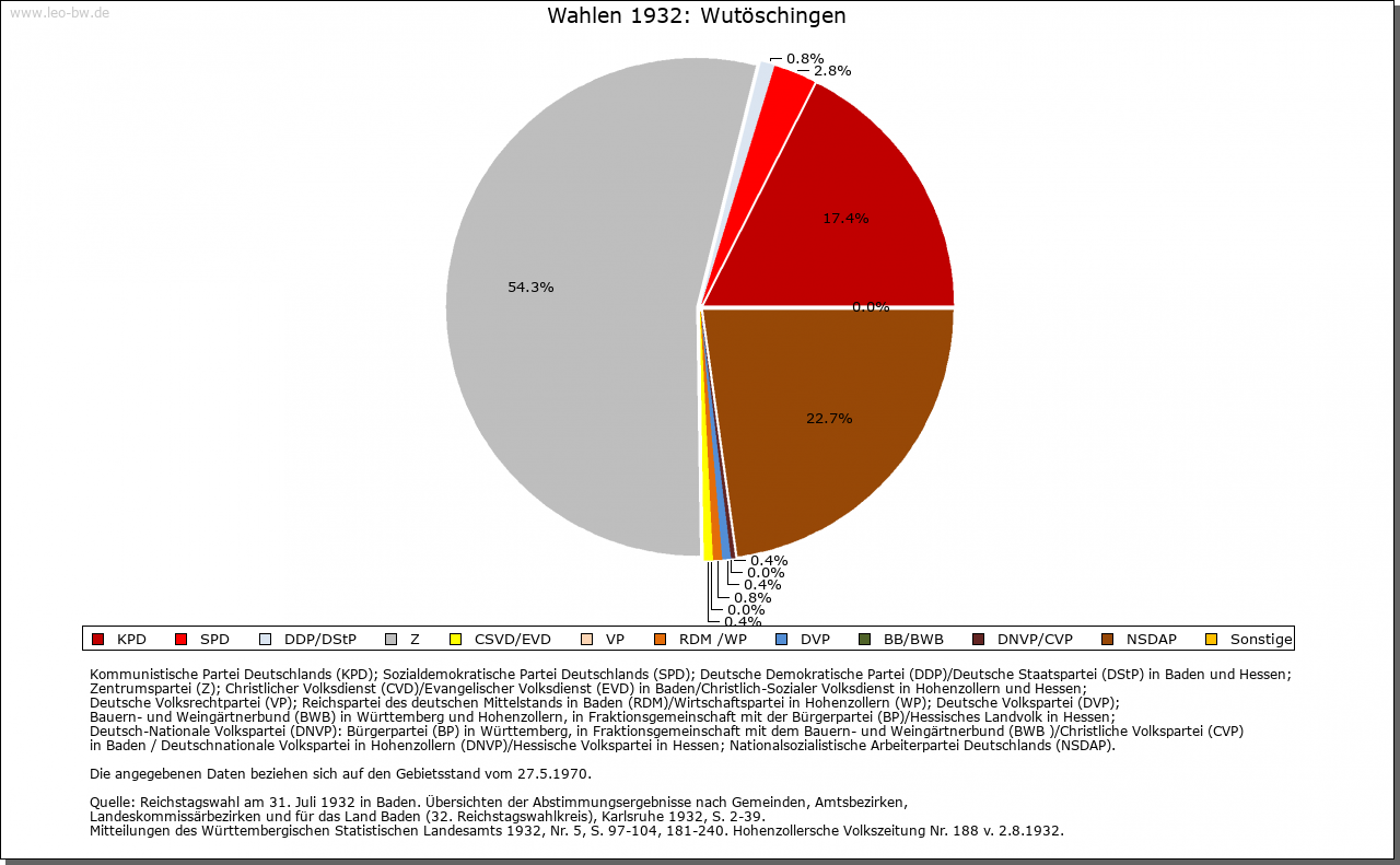 | Geschichte: | 1152 Essinun, 1323 ze Eschingen im Gutatal, 1525 Eschingen in Wuthenthal. Steinplattengräber der späten Merowingerzeit. Früher Besitz der Herren von Krenkingen und der Klöster Detzeln und St. Blasien. Das Niedergericht ging, wahrscheinlich im Zusammenhang mit den 1307 an Kloster Berau verkauften Vogtrechten, von den Herren von Krenkingen über verschiedene Adelsfamilien an die von Rümlang über. Ulrich von Rümlang veräußerte es 1488, zusammen mit den Rechten über Willmendingen, Horheim, Lutislo und Endermettingen, an Graf Heinrich von Lupfen und Graf Alwig von Sulz. Streitigkeiten mit der Landgrafschaft Klettgau wurden 1489 geschlichtet. Joachim Christoph von Mörsberg als lupfischer Erbe veräußerte den Ort an Maximilian von Pappenheim, von dem Graf Karl Ludwig von Sulz 1603 alles erwarb. Dessen Sohn Ulrich verkaufte seine Anrechte 1649 an Graf Friedrich Rudolf von Fürstenberg. Bis zum Übergang an Baden 1805/06 gehörte der Ort, soweit links der Wutach gelegen, zur Landgrafschaft Klettgau (Herrschaft Wutental), im jenseits der Wutach gelegenen Gemarkungsteil hatte die Landgrafschaft Stühlingen die hohe Obrigkeit. 1806 wurde Wutöschingen badisch, 1807 dem standesherrlichen Oberamt Klettgau zugeteilt, kam später zum Bezirksamt Tiengen und nach dessen Auflösung 1819 zum Bezirksamt/1939 Landkreis Waldshut. |