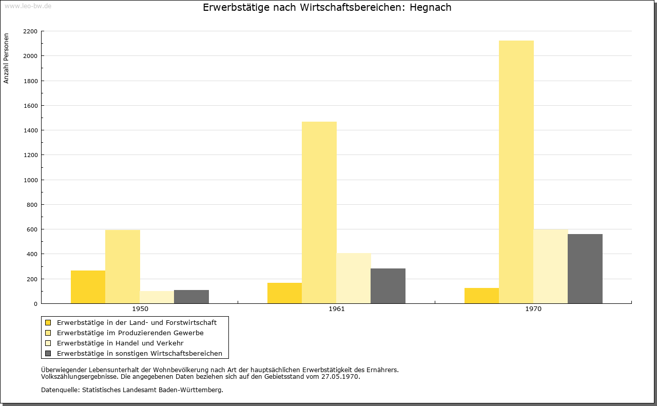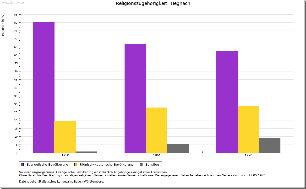 | Kirche und Schule: | Kirchlich war Hegnach 1353 Filial von Waiblingen. Spätestens seit 1410 bestand eine Nikolauskapelle. Evangelische Pfarrkirche 1487/88 erbaut, 1895 erneuert. Katholische Kirche zum Hl. Geist 1967 erbaut; zuständige Pfarrei ist Waiblingen. |