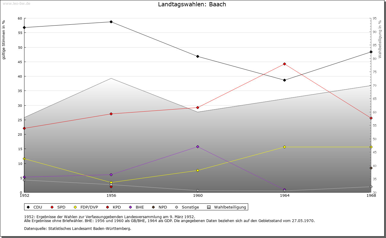 | Geschichte: | 1357 Bach, 1442 die Höfe im Bach (nach dem unbenannten Ortsbach). Gehörte größtenteils der Deutschordens-Komturei Winnenden und kam mit dieser 1665 an Württemberg. Baach zählte zum Amt bzw. Oberamt Winnenden, das 1808 mit dem Oberamt Waiblingen vereinigt wurde und dann zum Oberamt, seit 1938 Landkreis Waiblingen. |