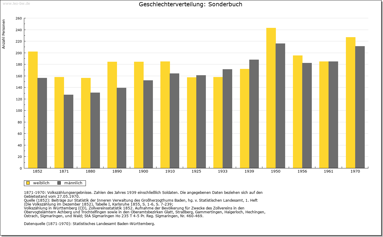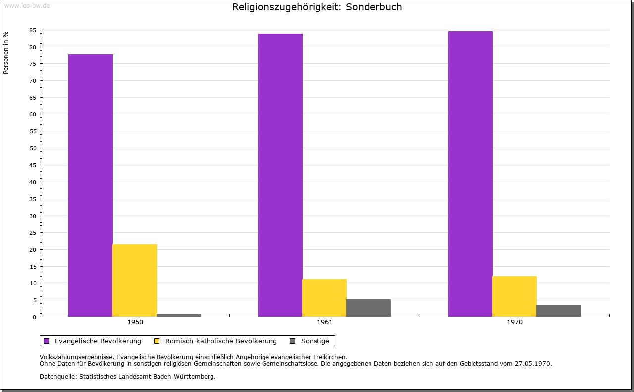 | Geschichte: | 1108 (Chronik 16. Jahrhundert) Sinderbuch, 1294 Sunderbuch (sundar = südlich, buch = Wald). 1,9 Kilometer östlich im Wald Kohlerhau eine gut erhaltene keltische Viereckschanze. Zwischen 1309 und 1354 kommen einige Mitglieder der Adelsfamilie von Sonderbuch vor. Besitz der von Nenningen, gelangte 1406/10 an Blaubeurer Bürger. Das Spital Blaubeuren besaß etwa ein Drittel des Grundbesitzes. Das Dorf wurde 1447 von den Grafen von Helfenstein an Württemberg verkauft und gehörte dann zum Stadt-Oberamt beziehungsweise Oberamt Blaubeuren, 1938 zum Landkreis Ulm. |