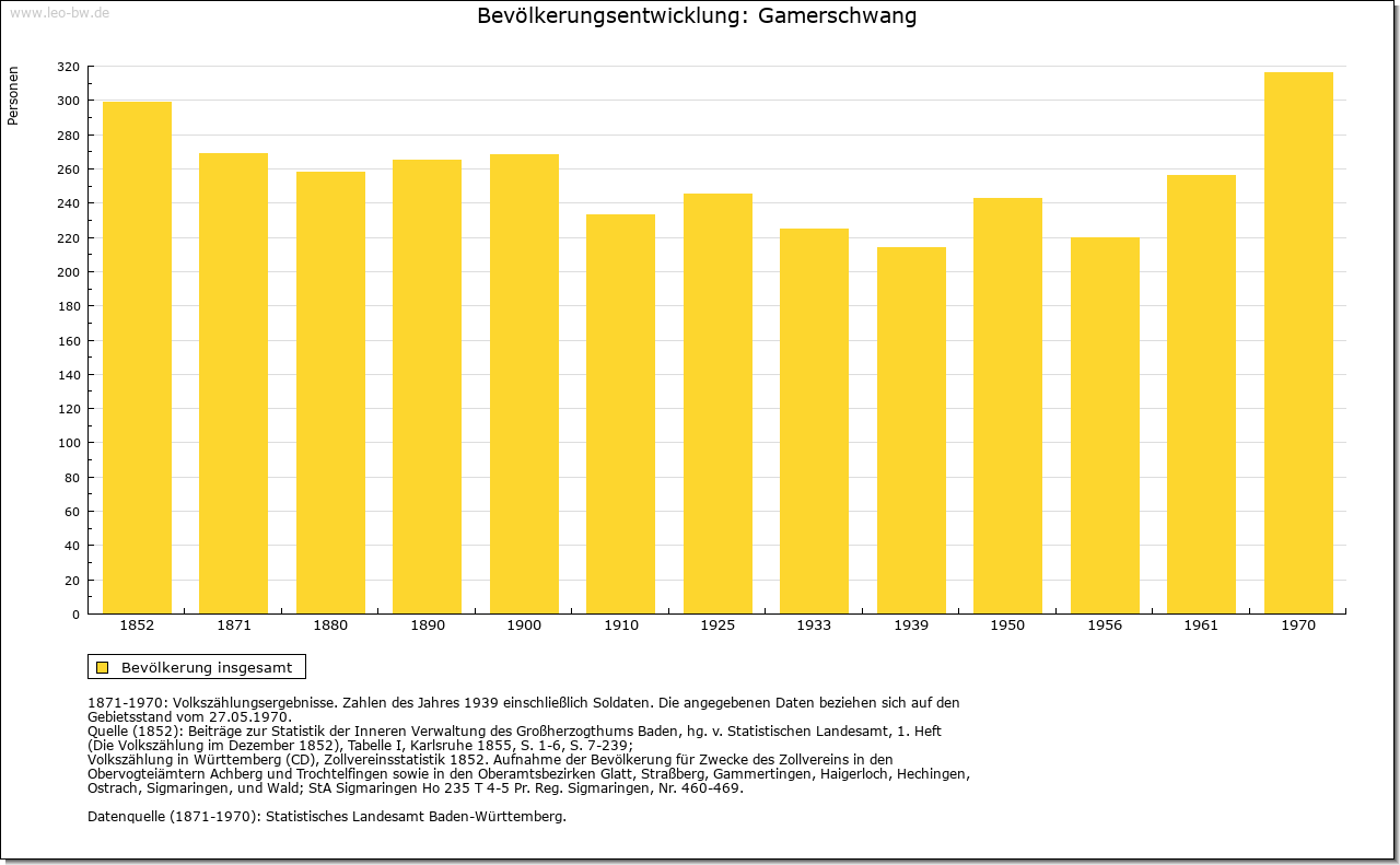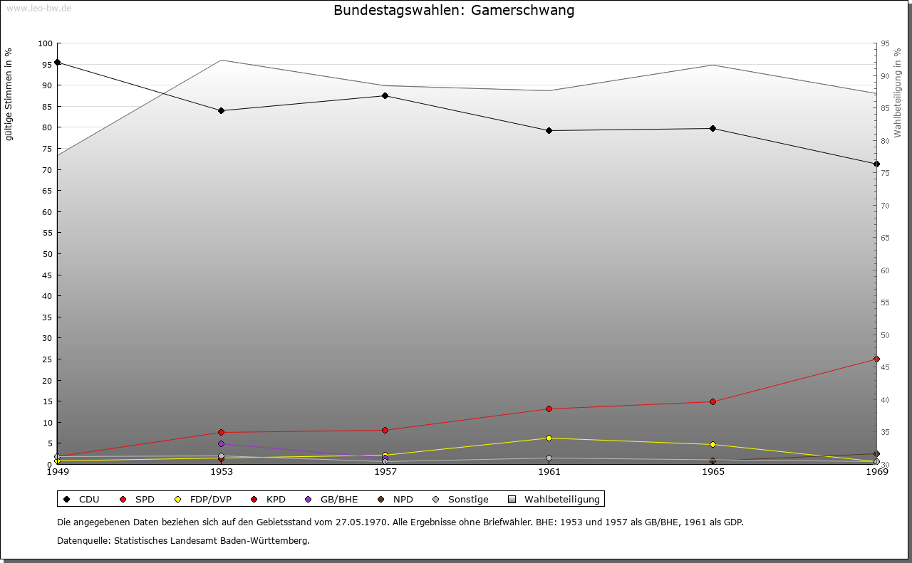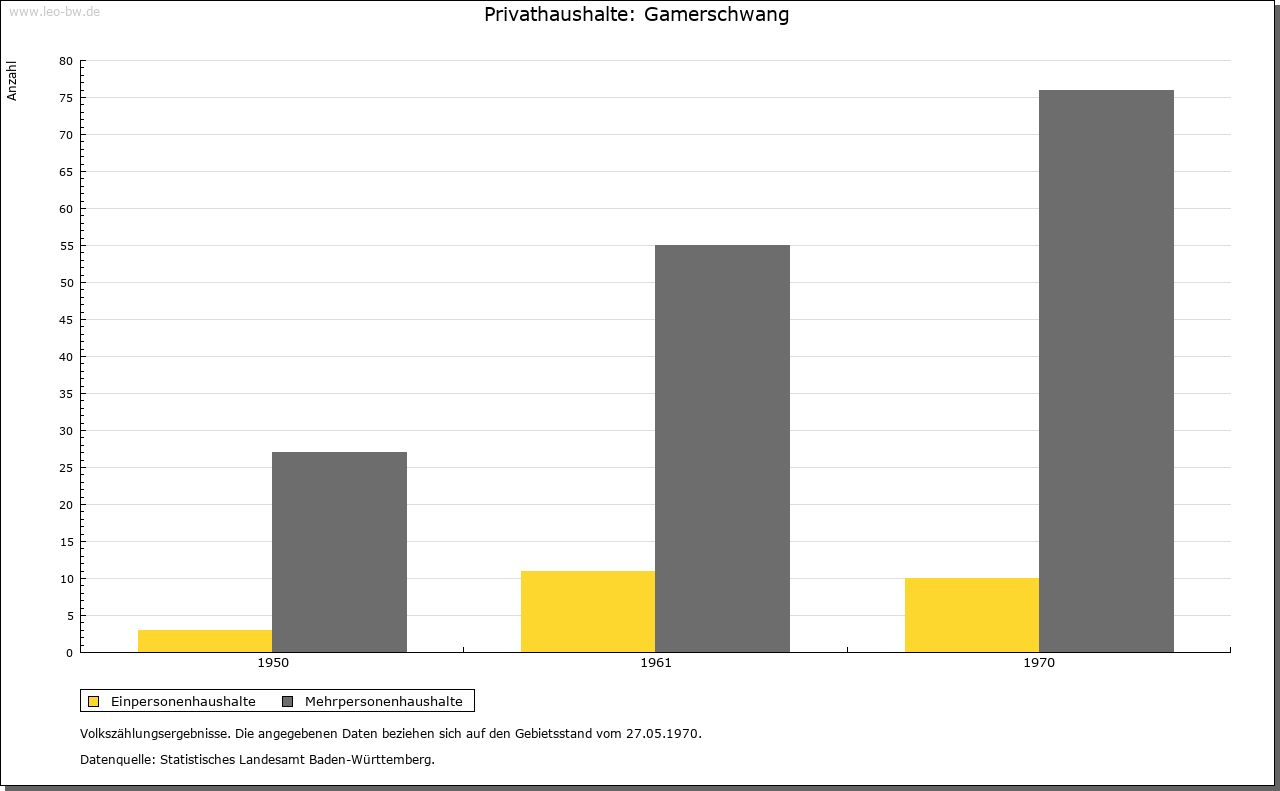 Geschichte: 12. Jahrhundert Gamenesuuanc, 1277 Gamelswanch (Personenname), vermutlich hochmittelalterliche Ausbausiedlung. Adel von Gamerschwang im 12. Jahrhundert, im 13. Jahrhundert Dienstleute der Grafen von Berg, letztmals 1495 (in Überlingen verbürgert). Die Burg stand wohl an der Stelle des um 1760/70 von den Freiherren von Raßler erbauten Schlosses. Oberhoheit der Grafen von Berg, 1343 an Österreich. Burg und Ortsherrschaft als Lehen der Grafen von Helfenstein, von Werdenberg und von Fürstenberg in Händen der Sefler von Ulm (1365), der von Reischach (1380) und der Kraft von Ulm (1397), die sich nach dem Ort benannten, ihn aber 1435 an die Herren von Schienen verkauften. Diese zogen nach der Zerstörung ihrer Burg auf dem Schienerberg (1441) hierher. Nach 1550 wech­selnde Besitzer (von Freyberg, Speth von Schülzburg), dann 1661 Belehnung der von Raßler, die sich seit 1681 »zu Gamerschwang« nannten. Das Rittergut gehörte zum Kanton an der Donau. 1760 bis 1770 Niederlassung zahlreicher Hausierhändler im Ort. 1805 an Württemberg, Oberamt (1938 Landkreis) Ehingen. Patrimonialamt bis 1809. Um 1810/11 Schultheißerei Nasgenstadt, seither selbständig.