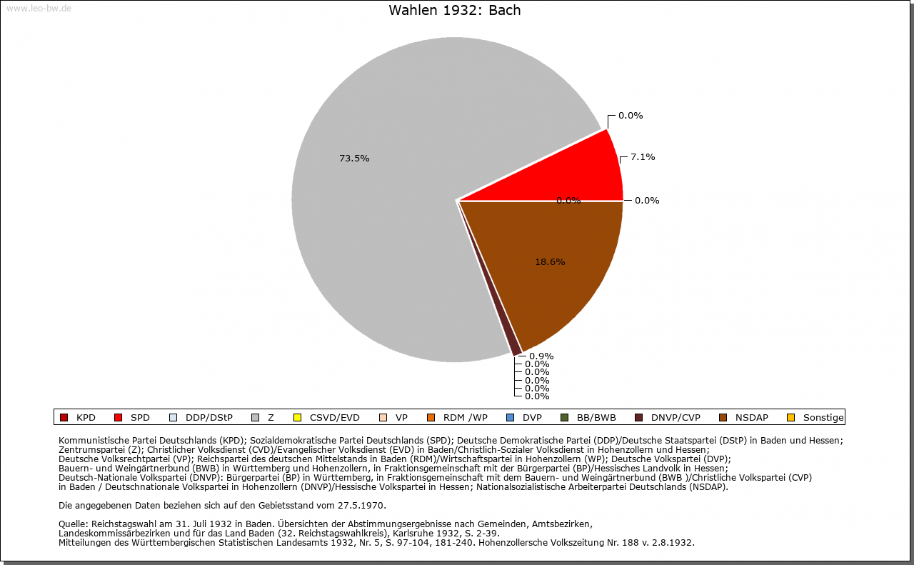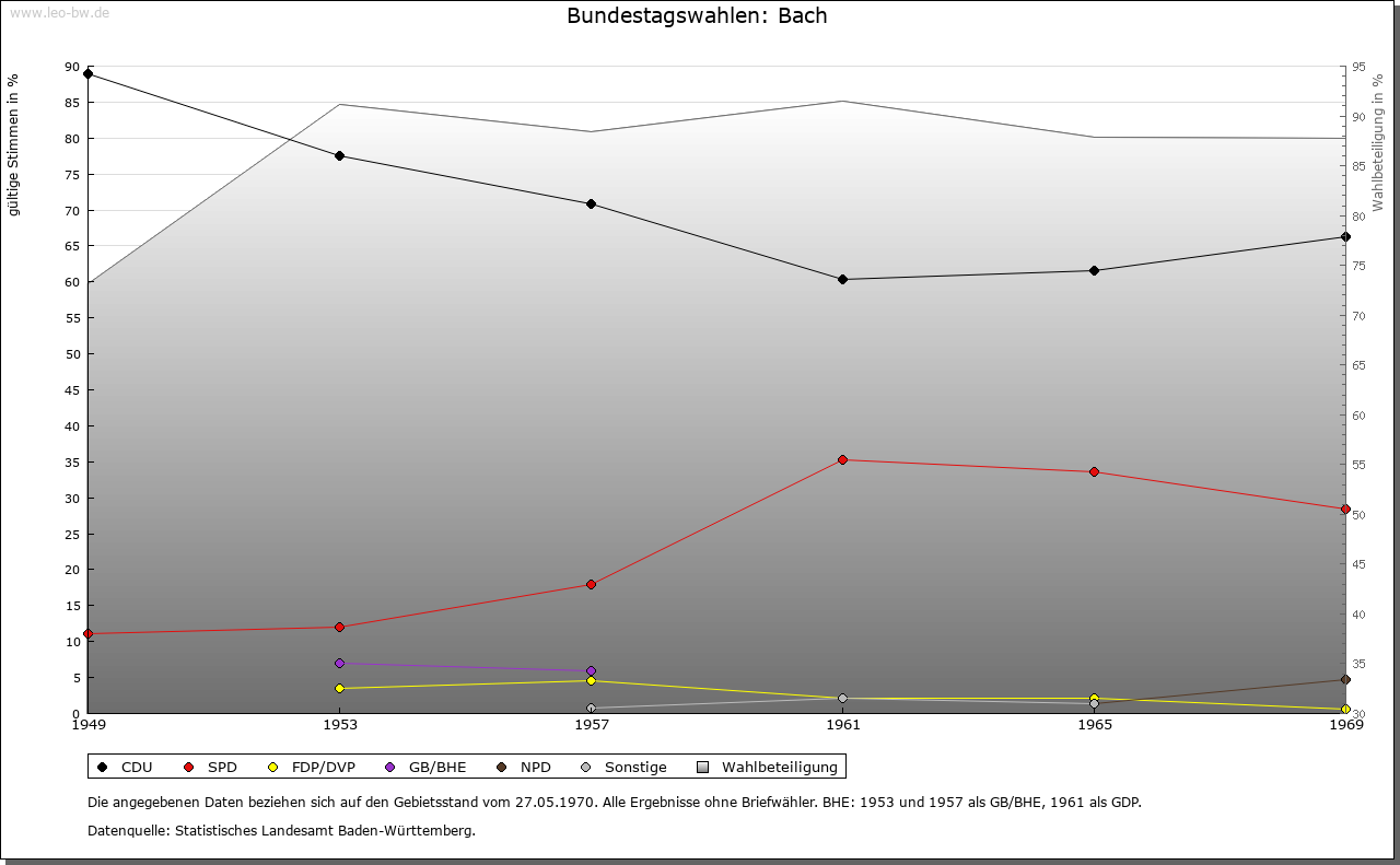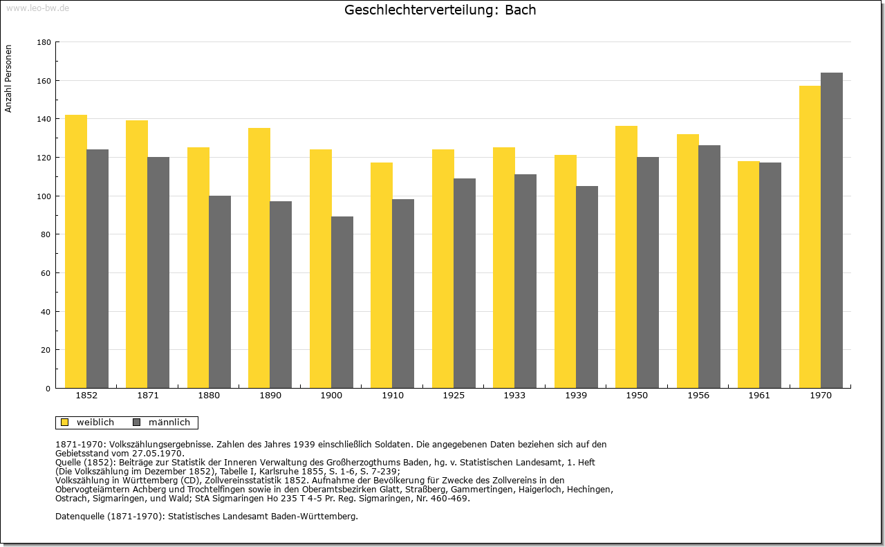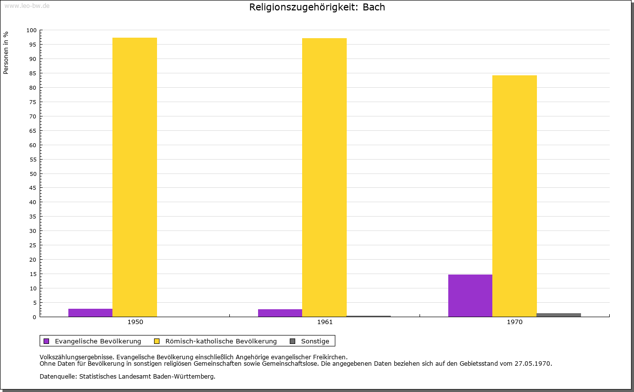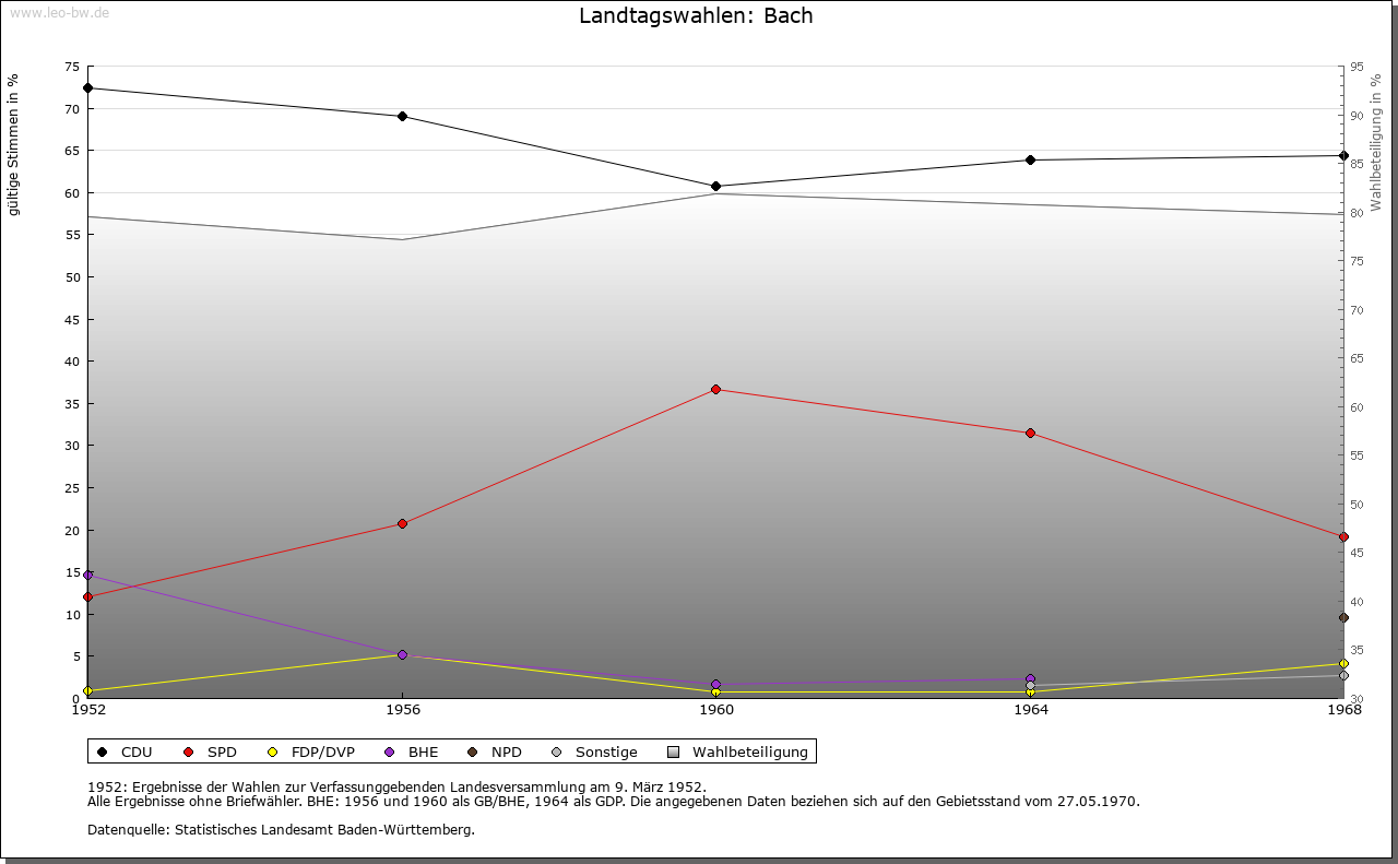 | Geschichte: | 1188 Bach (Lokalisierung fraglich), 1264 erstmals sicher genannt. Vermutlich Siedlung des hochmittelalterlichen Landausbaus. Der 1188 und 1264 bis 1290 genannte Adel von Bach ist nicht sicher lokalisiert, doch gehören vermutlich hierher die Bergschen Dienstleute Pilgrim (Peregrinus) und Ulrich (1264 bis 1290). Im 14. und 15. Jahrhundert treten Herren von Bach mit dem Freybergschen Wappen und Herren von Freyberg, genannt von Вach, auf. Ein Schloss stand bis um 1770 an der Stelle der Kirche. Ortsherrschaft und wohl auch Oberhoheit im 15. Jahrhundert an die von Wernau, 1552 an die von Baumgarten zu Erbach, von deren Konkursgläubigern 1569 an die Schenken von Stauffenberg, 1678 an von Limburg-Styrum, 1687 an die Freiherren von Ulm, 1721 an die Grafen Schenk von Castell. 1805 kam der ritterschaftliche Ort an Bayern, erst 1810 durch Staatsvertrag an Württemberg, Oberamt (1938 Landkreis) Ehingen. 1810 gehörte er zu Donaurieden, wohl seit 1811 eigene Schultheißerei. |