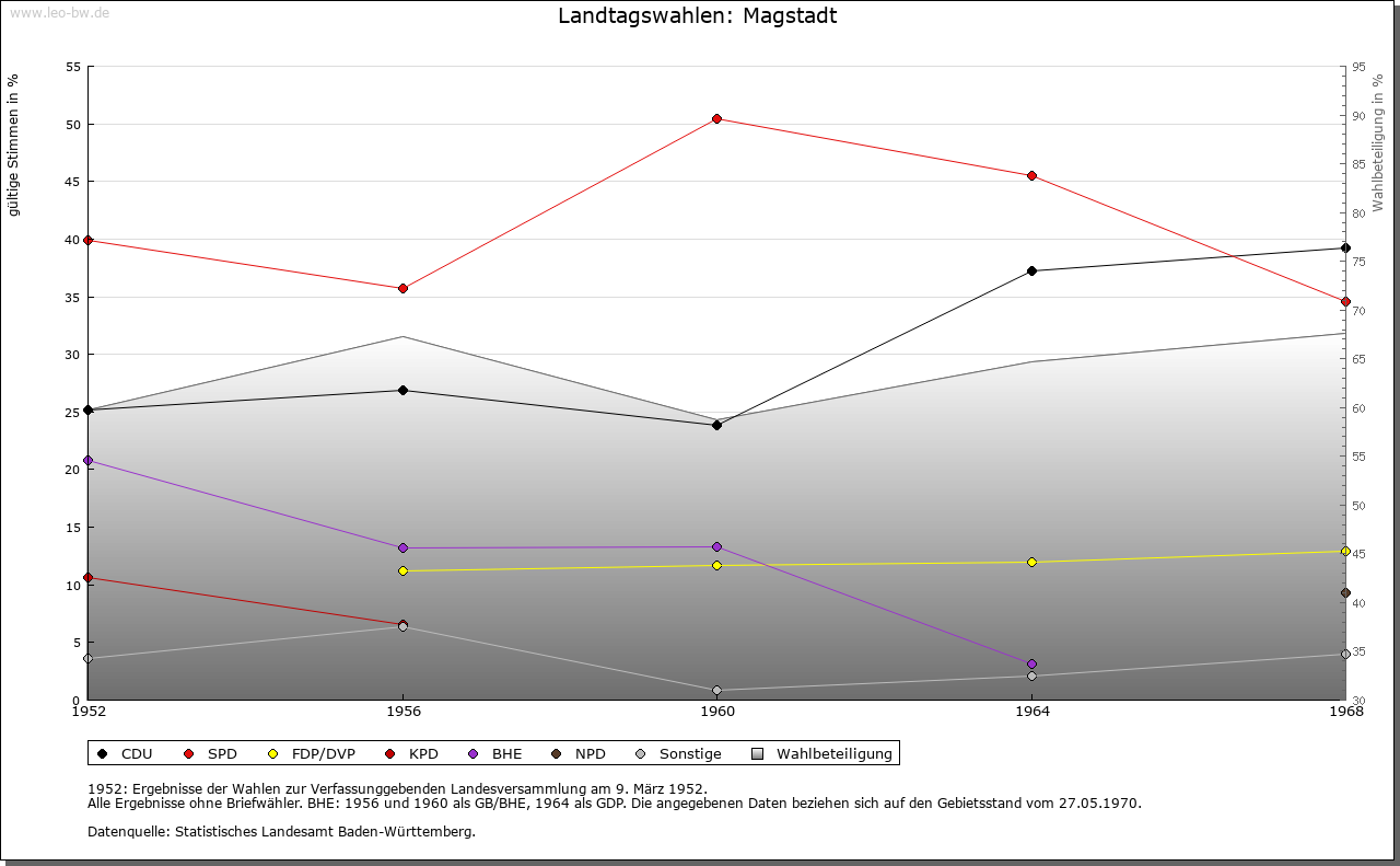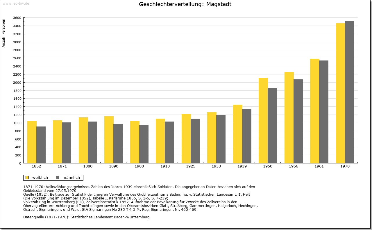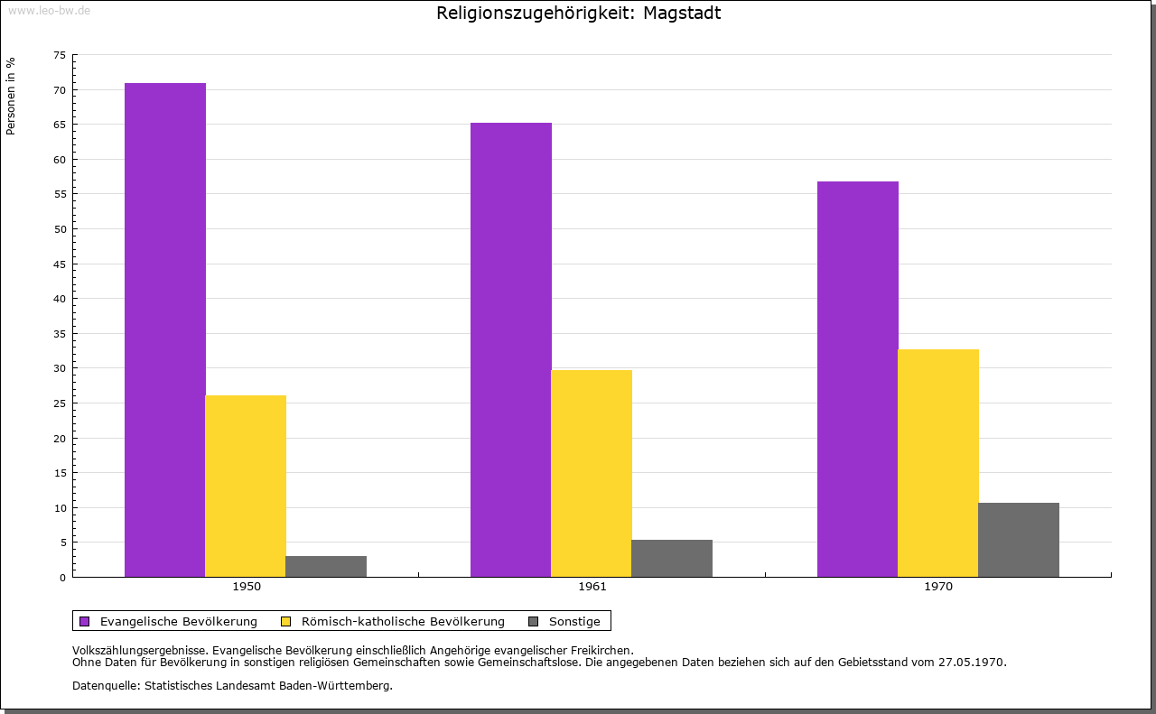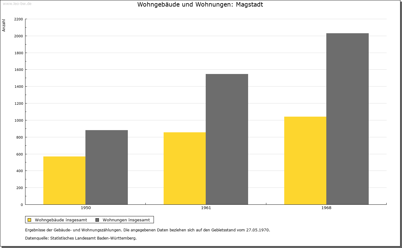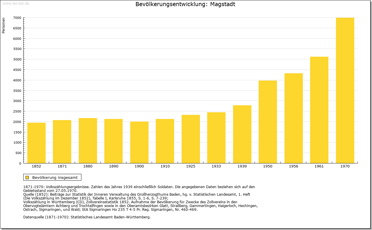 | Geschichte: | 12. Jahrhundert (Überlieferung 16. Jahrhundert) Magstat, 1261 Magistat, 1295 oppidum Magestat (Mage = Verwandte?). Durch Reihengräber als Siedlung wenigstens der Zeit um 700 erwiesen. Die im 12. und 13. Jahrhundert nachgewiesene Adelsfamilie von Magstadt zählte im 13. Jahrhundert zur Ministerialität der Tübinger Pfalzgrafen. Der zuvor wohl calwische Ort gehörte im 13. Jahrhundert den Tübingern und kam im wesentlichen vor 1381/83 an Württemberg. Besitz hatten hier u.a. auch die von Weißenstein (1295 an Kloster Maulbronn, 1423 an Stift Sindelfingen), die Marschalk von Weil (1376 an Württemberg) und Kloster Bebenhausen (1292 von den Pfalzgrafen). Im Zweiten Weltkrieg wurden 12% der Wohnungen, besonders im Ortskern, zerstört. Der Ort, der seit 1817 Marktgerechtigkeit hat, zählte nach 1380 sowie 1763/67 zum Amt Leonberg, sonst zum Amt bzw. Oberamt, seit 1938 Landkreis Böblingen. |
