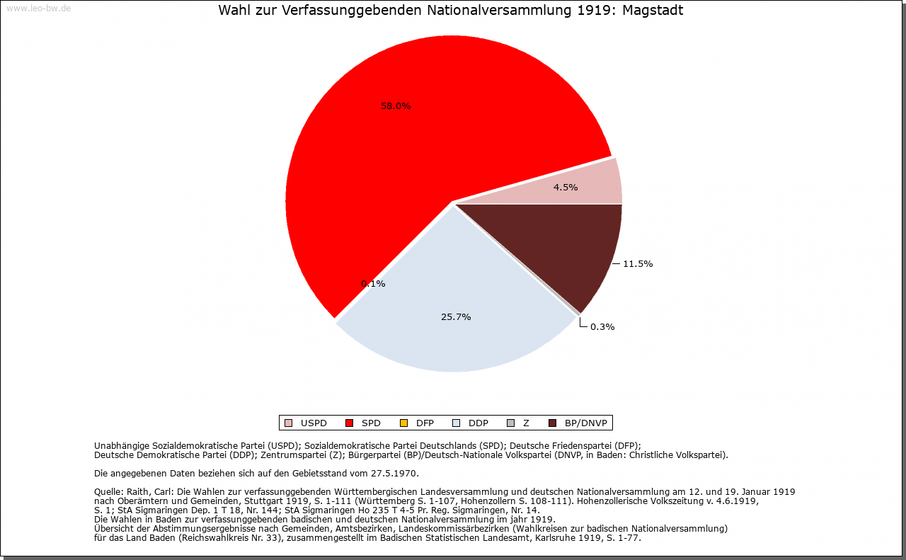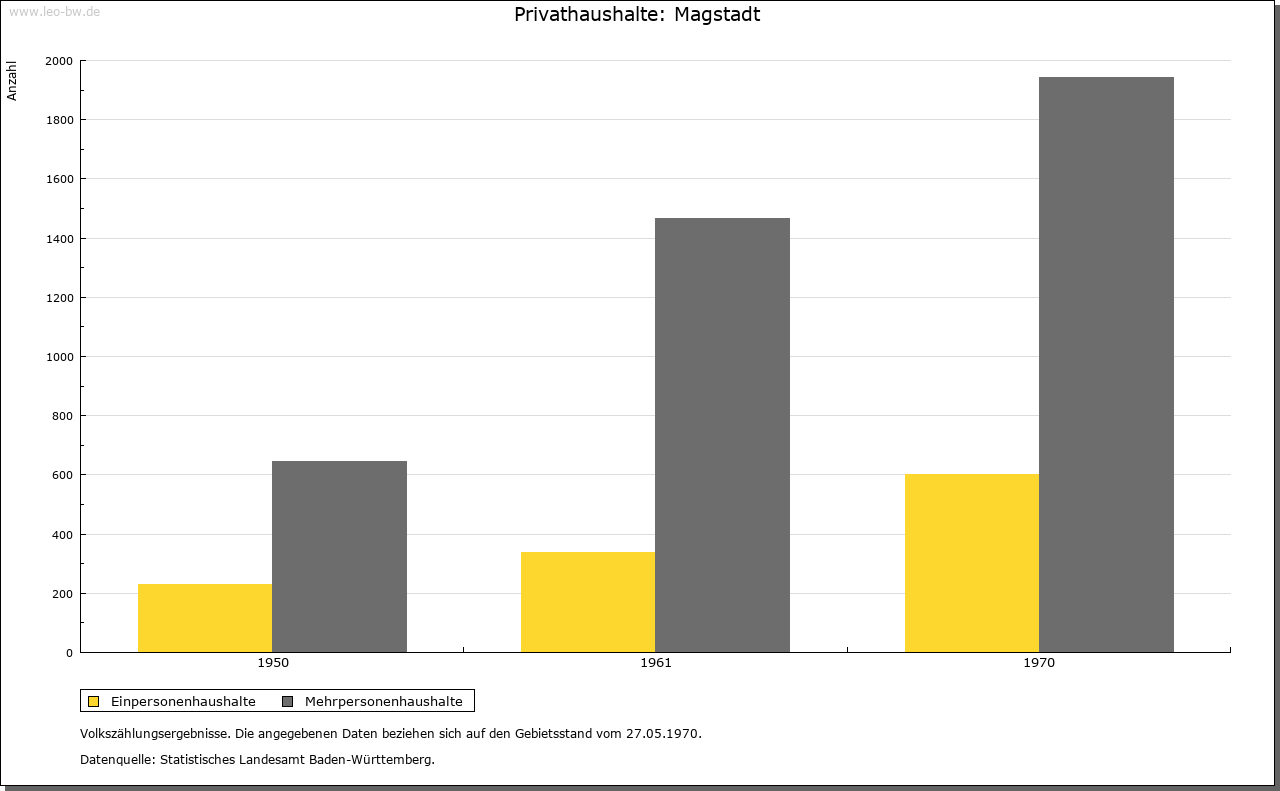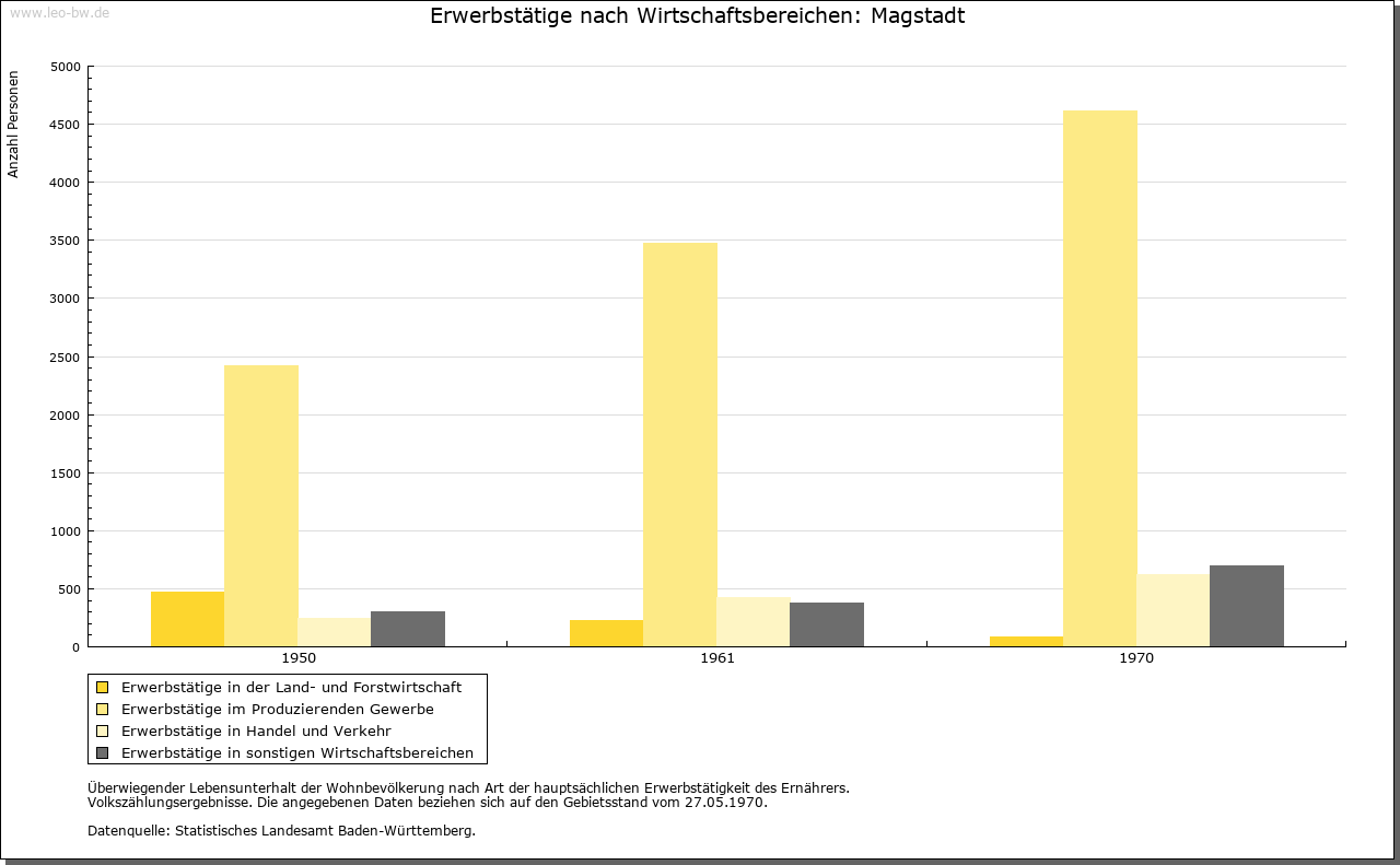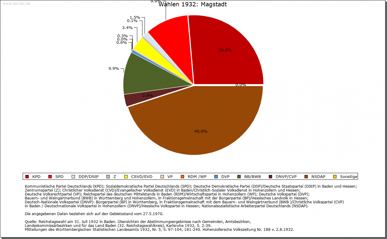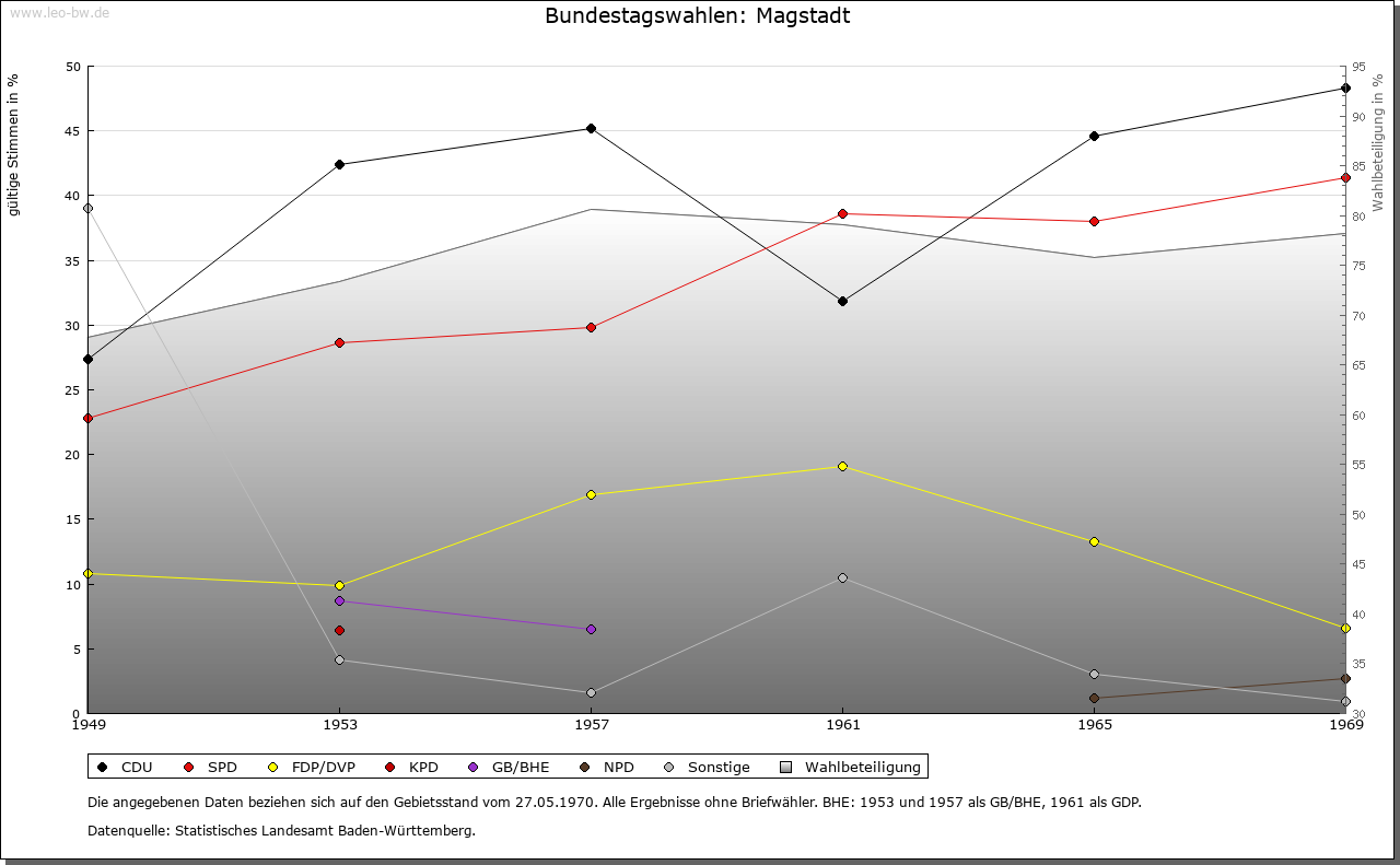 | Geschichte: | 12. Jahrhundert (Überlieferung 16. Jahrhundert) Magstat, 1261 Magistat, 1295 oppidum Magestat (Mage = Verwandte?). Durch Reihengräber als Siedlung wenigstens der Zeit um 700 erwiesen. Die im 12. und 13. Jahrhundert nachgewiesene Adelsfamilie von Magstadt zählte im 13. Jahrhundert zur Ministerialität der Tübinger Pfalzgrafen. Der zuvor wohl calwische Ort gehörte im 13. Jahrhundert den Tübingern und kam im wesentlichen vor 1381/83 an Württemberg. Besitz hatten hier u.a. auch die von Weißenstein (1295 an Kloster Maulbronn, 1423 an Stift Sindelfingen), die Marschalk von Weil (1376 an Württemberg) und Kloster Bebenhausen (1292 von den Pfalzgrafen). Im Zweiten Weltkrieg wurden 12% der Wohnungen, besonders im Ortskern, zerstört. Der Ort, der seit 1817 Marktgerechtigkeit hat, zählte nach 1380 sowie 1763/67 zum Amt Leonberg, sonst zum Amt bzw. Oberamt, seit 1938 Landkreis Böblingen. |