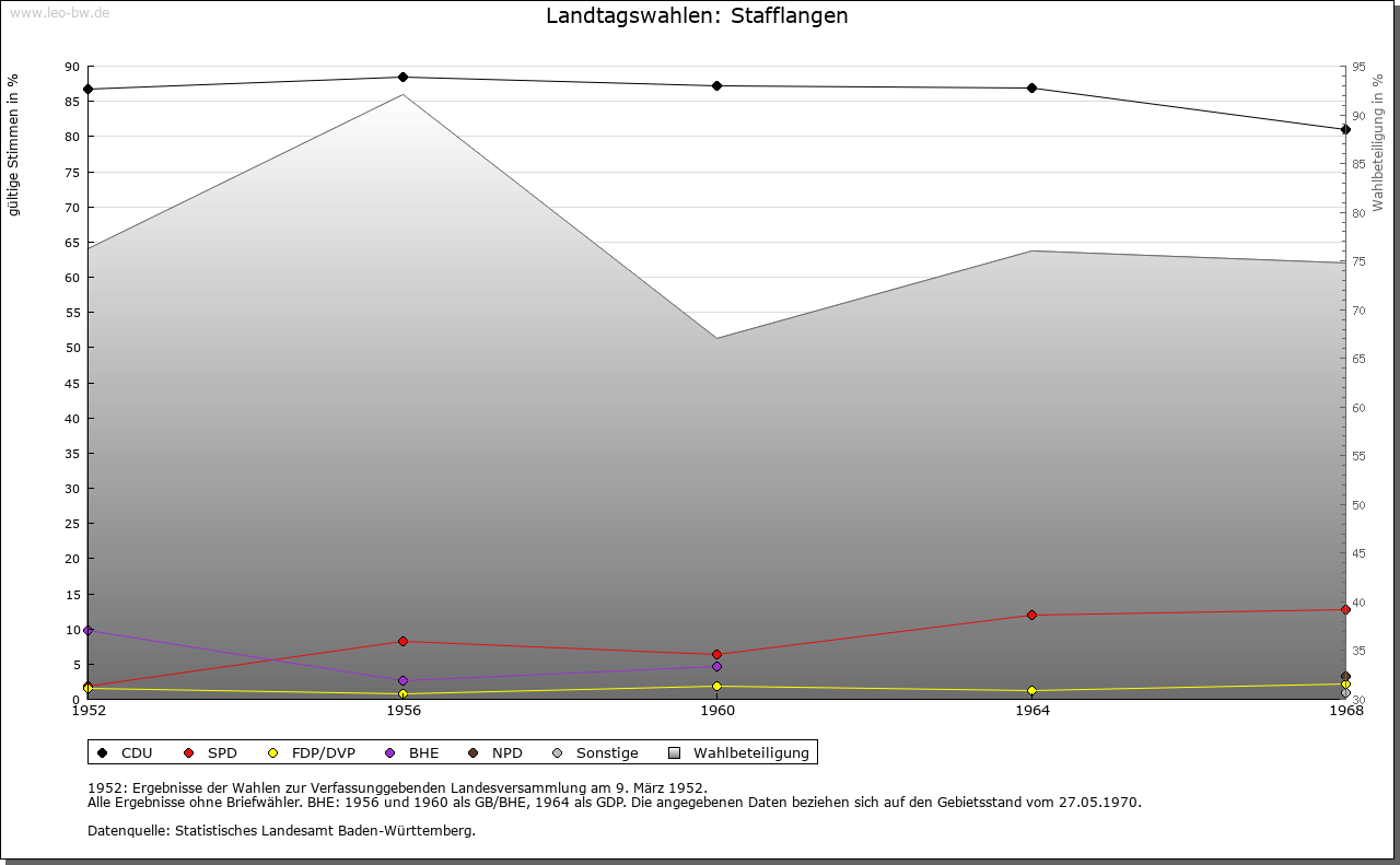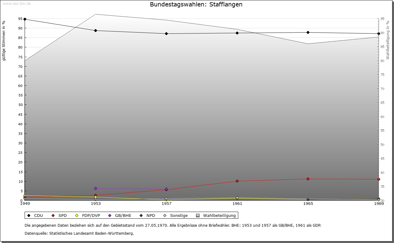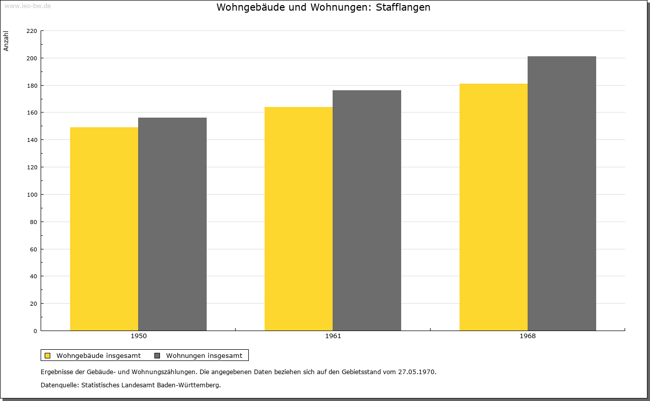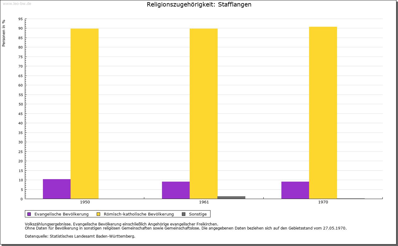 | Geschichte: | Um 1200 Staphelangen. Ursprünglich wohl zur Herrschaft Warthausen. Burg und Dorf kamen von Jop von Stadion über die von Sulmingen (1355) und die Biberacher Patrizierfamilie Gräter (1396) schließlich 1608 an das Kloster Schussenried. Hoch- und Blutgerichtsbarkeit 1612 als Pfand, 1743 als Lehen erworben. 1737 Kauf des (schon um 1200 belegten) Besitzes des Klosters Beuron. Mit Schussenried 1803 an von Sternberg-Manderscheid, 1806 an Württemberg (Standesherrschaft). Oberamt Waldsee, 1842 Oberamt (1938 Landkreis) Biberach. |
