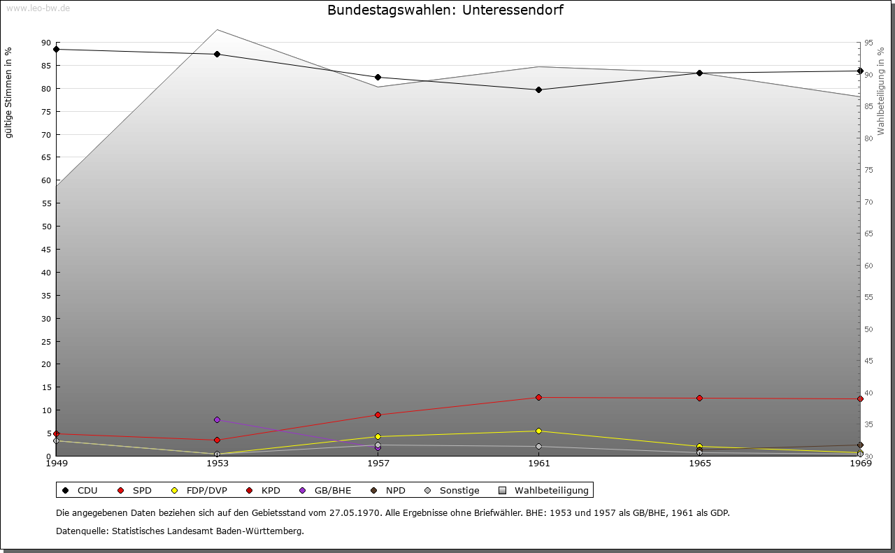 | Geschichte: | 797, 817 Essindorf (Personenname Esso). Siedlung der älteren Ausbauzeit. Ob die im Nordwesten gemachten Skelettfunde von alemannischen Reihengräbern stammen, ist unbekannt. Schon 817 ist von »beiden Essendorf« die Rede. Niederadel von Essendorf ist 1239 bis 1570 genannt, im 14. Jahrhundert in Biberach und Ravensburg verbürgert. Abgegangene Burg im Оsten beim Weiler Scharben. Diese kam 1381 an die von Landau, 1444 als »Schloß Landau« an die Truchsessen von Waldburg. Das Dorf gehörte früh zur Herrschaft Waldsee und kam mit dieser 1331 an Österreich, 1386 an die Truchsessen von Waldburg (1454 mannserbliche Inhabung). 1806 unter württembergische Staatshoheit. Oberamt Waldsee. Bis 1824 unterstand der Ort dem Gericht Essendorf mit Sitz in Oberessendorf. 1938 zum Landkreis Biberach. |